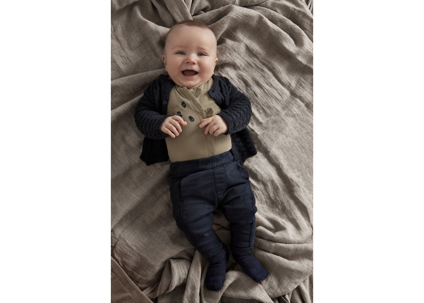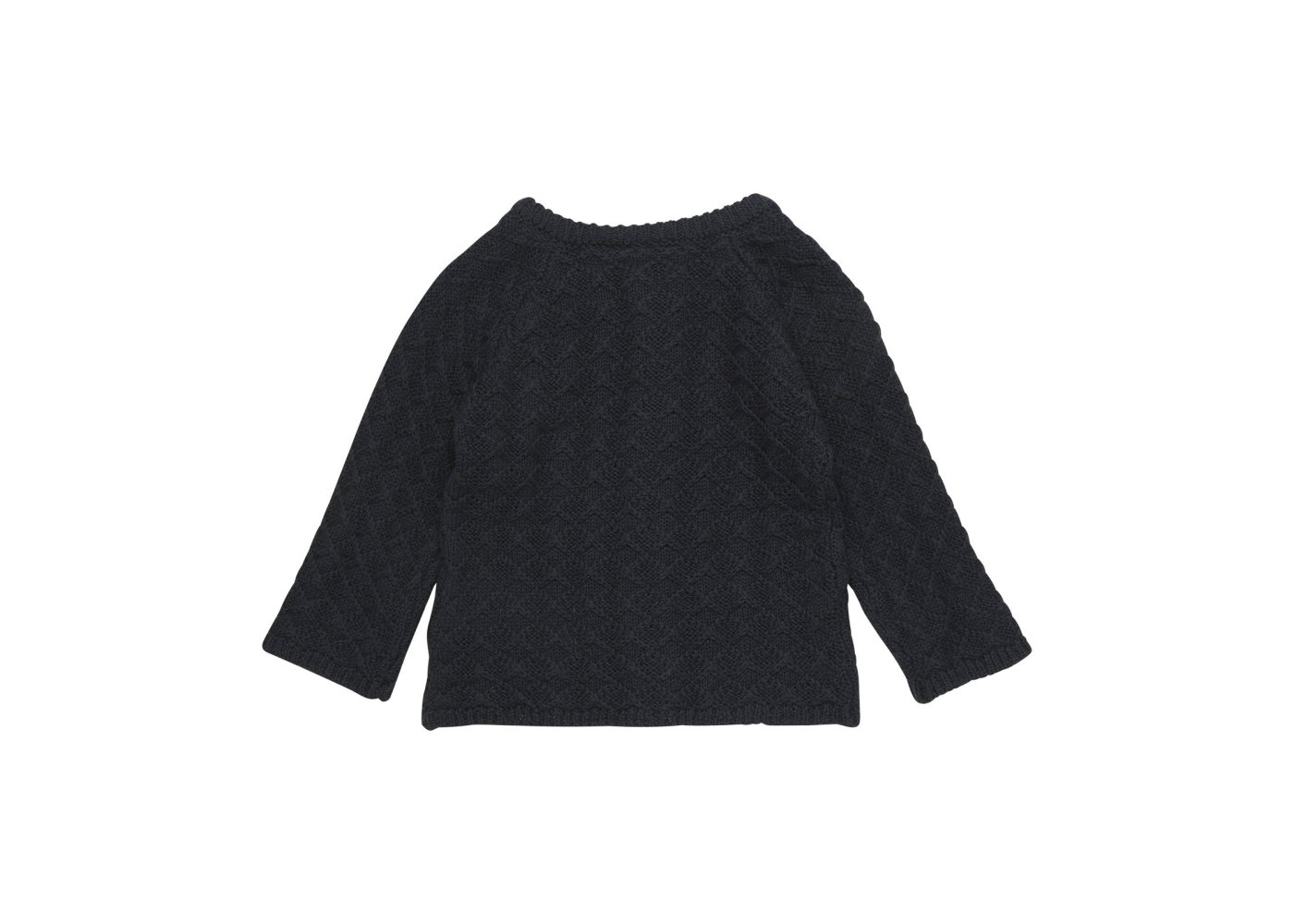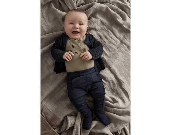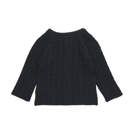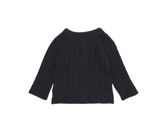 Trøjen har ribstrik i alle åbninger og lukkes med fine knapper ned foran. Den er lavet i skøn blanding af uld og bomuld.