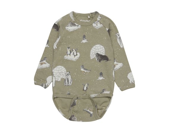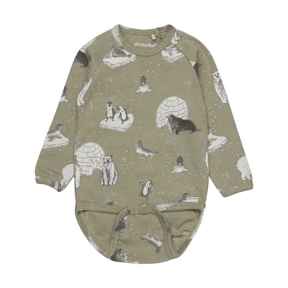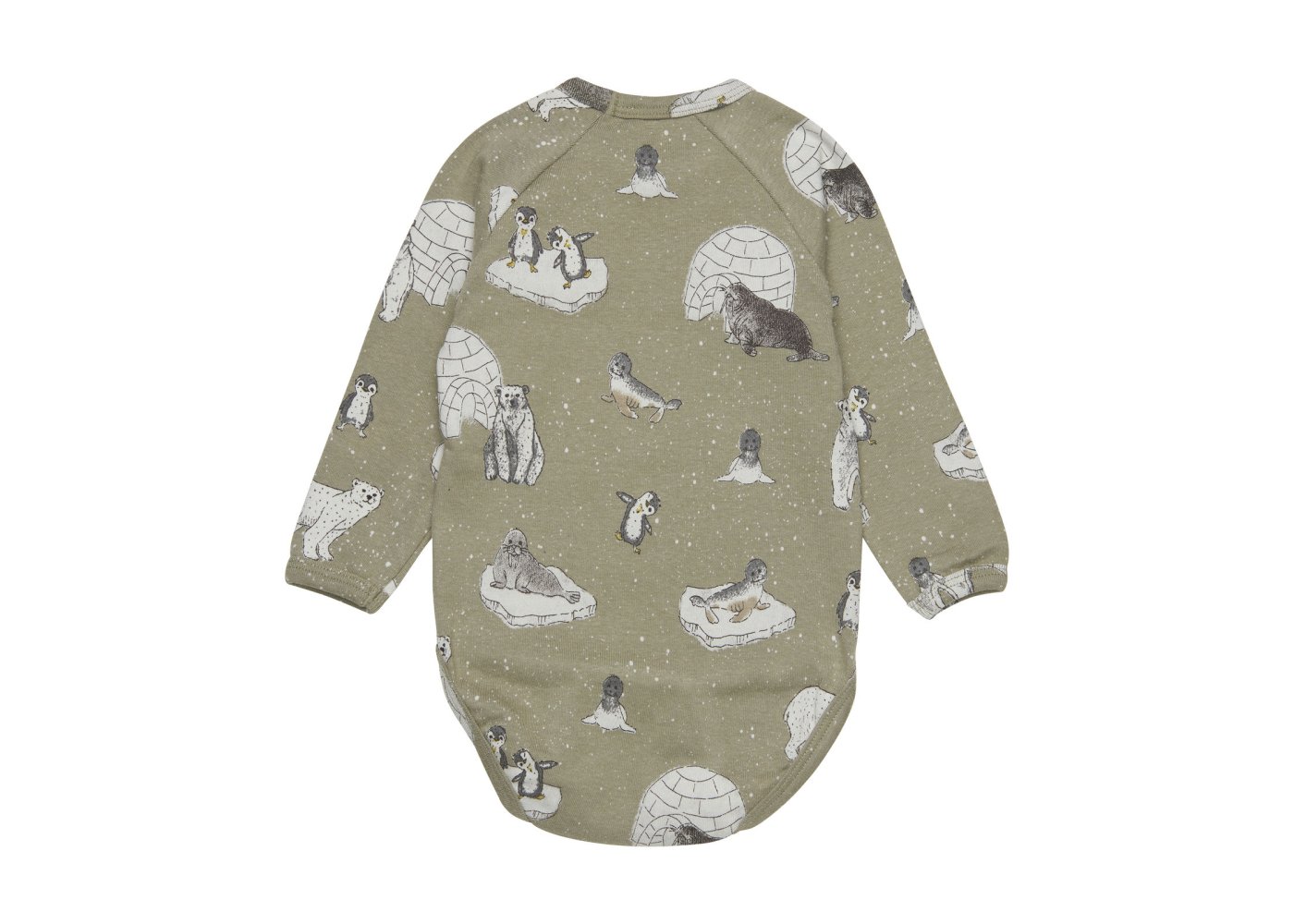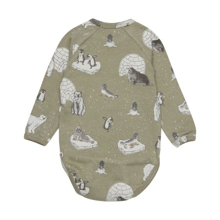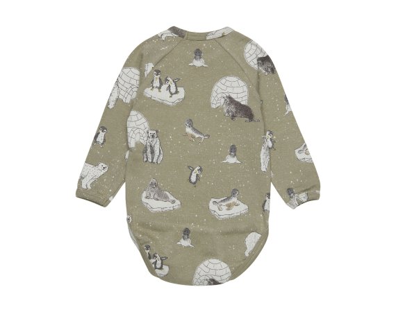 Sød grøn body med lange ærmer og smukt motiv af dyr fra Arktis.Bodyen lukkes med trykknapper imellem ben.