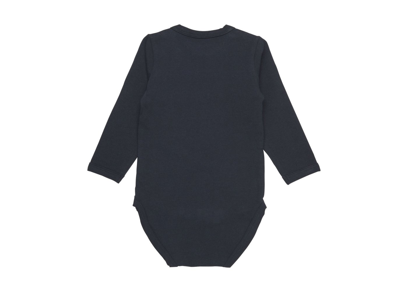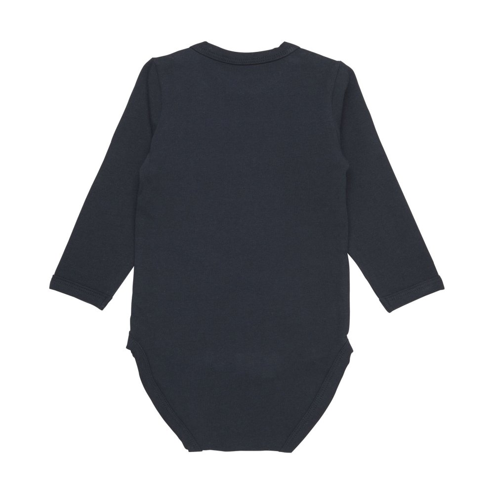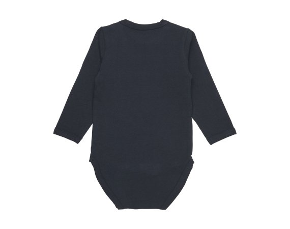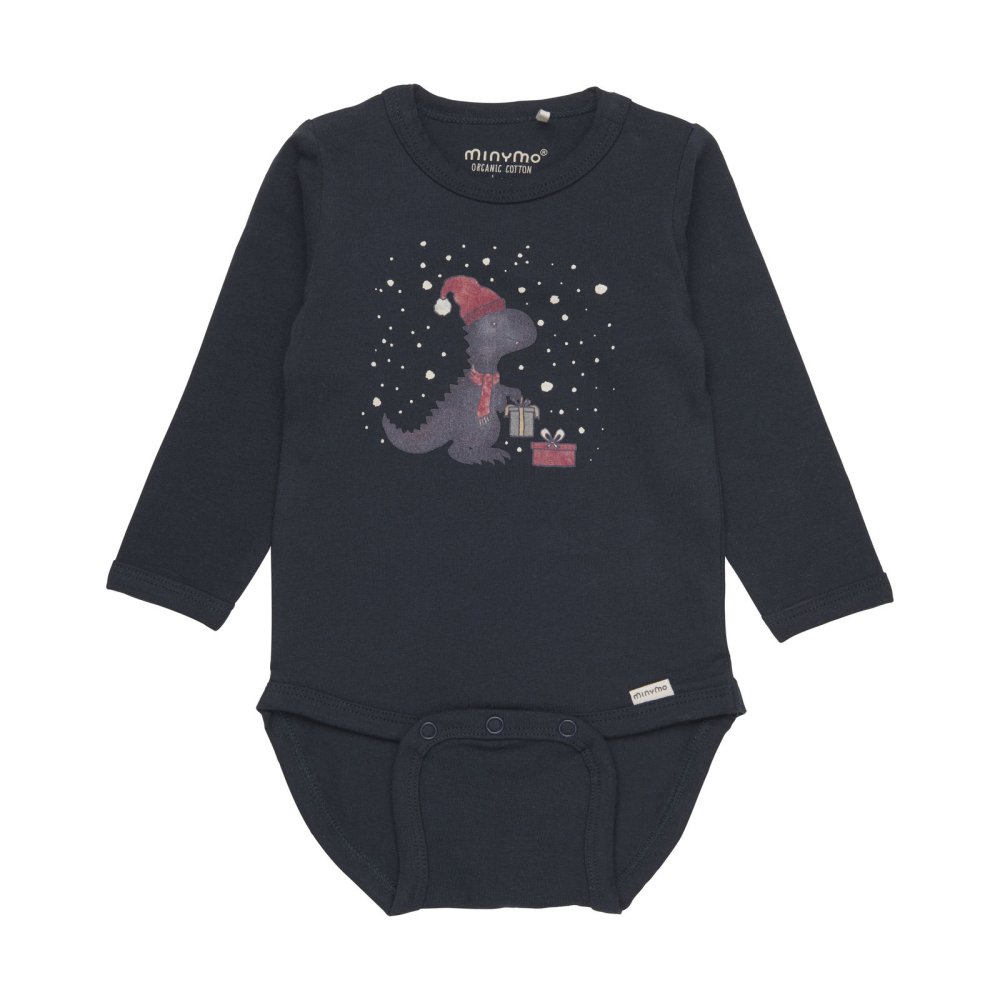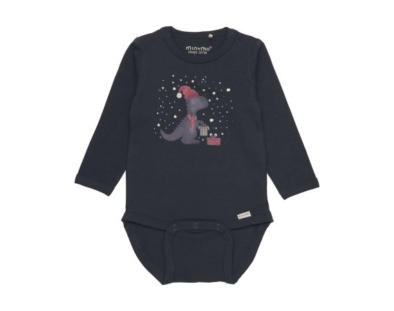 Sød blå jersey body med lange ærmer og dino motiv.Bodyen lukkes med trykknapper imellem ben.