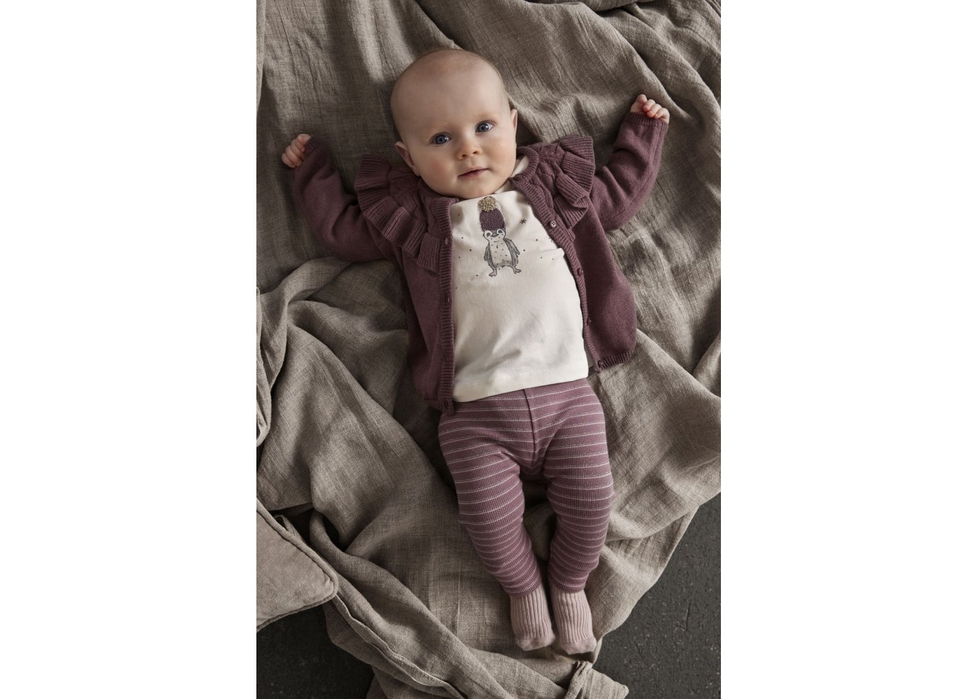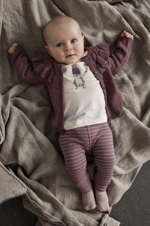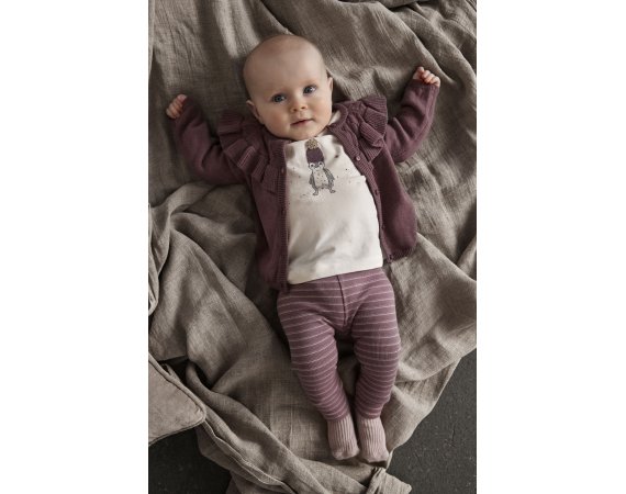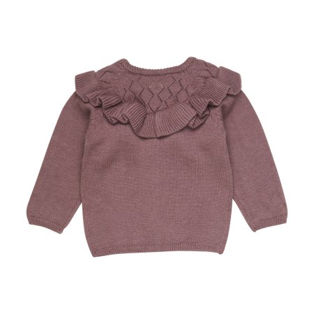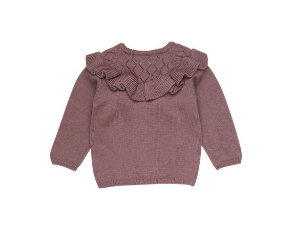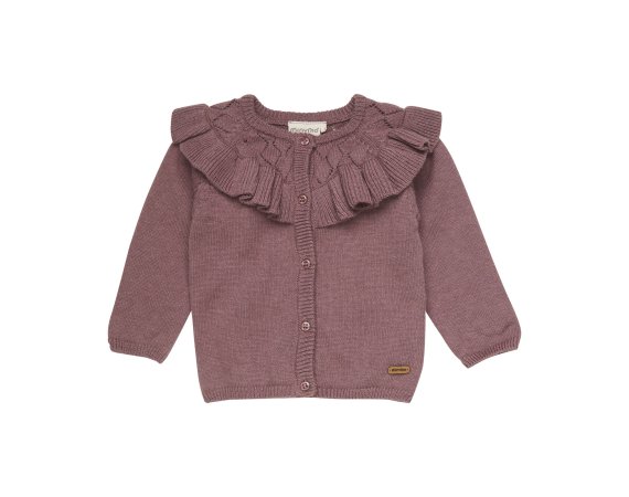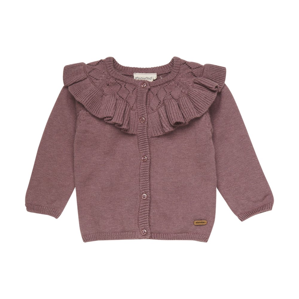 Fin strik cardigan med sød flæse og flot mønster fra Minymo.