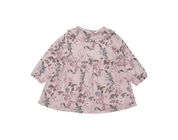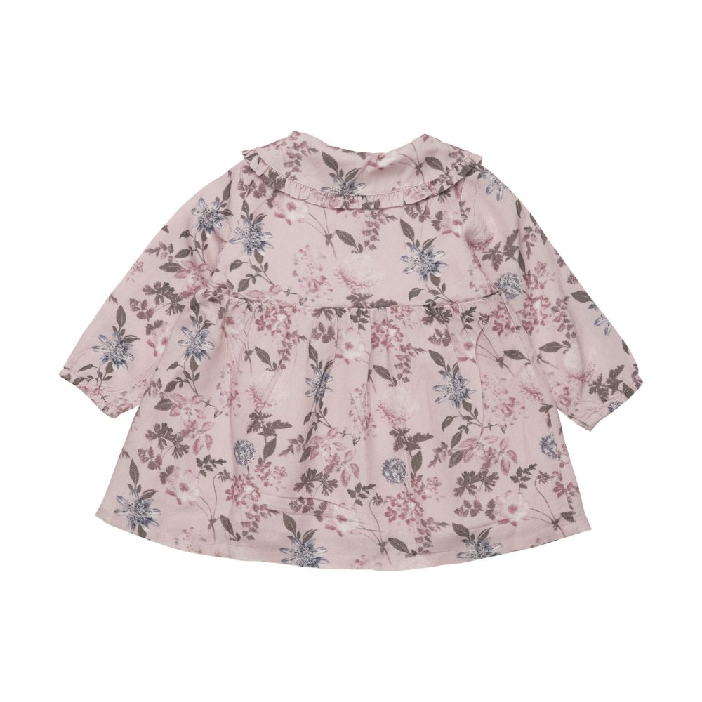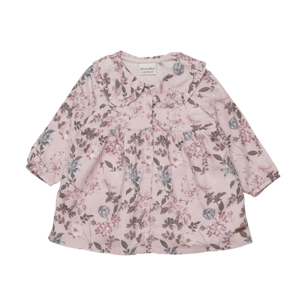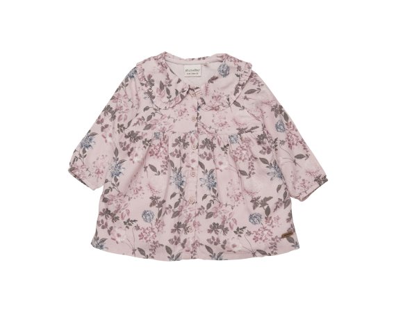 Yndig kjole med fin flæse krave og blomster fra Minymo.Kjolen har et sødt rynket skørt og lukkes foran med gennemgående knapper.