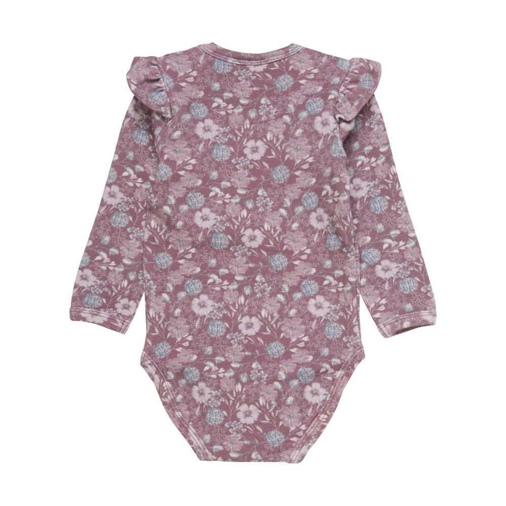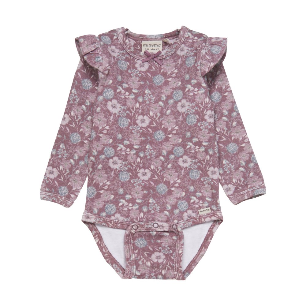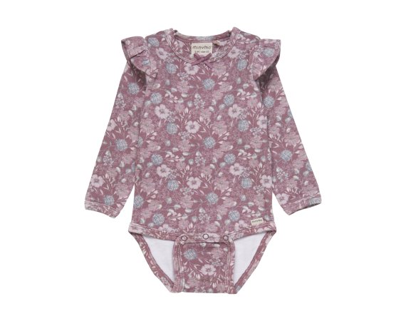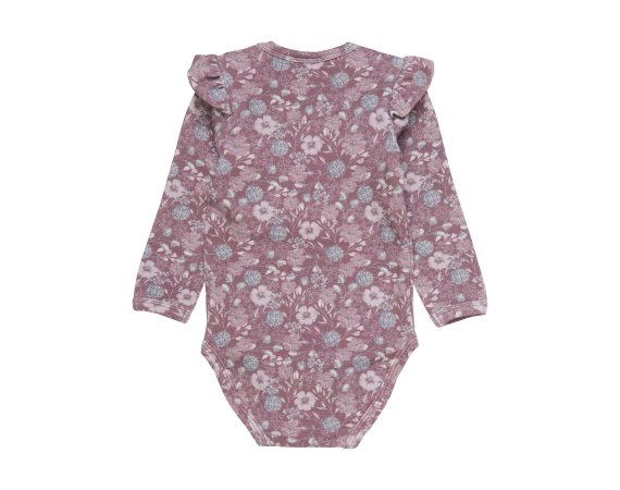 Lækker rib body med flæser på skuldre og fin sløjfe foran på brystet.Bodyen har lange ærmer og lukkes med trykknapper mellem ben.Tekstil: 57% bomuld, 38% modal, 5% elastan