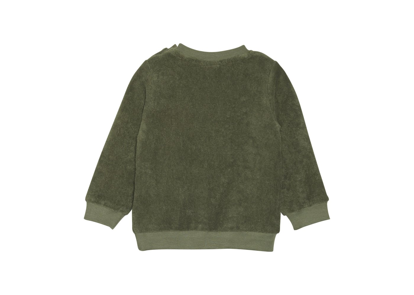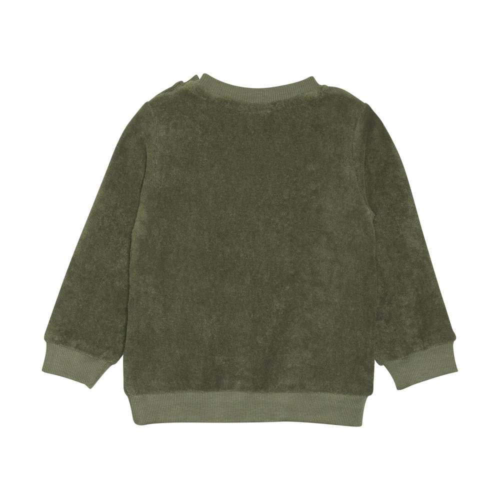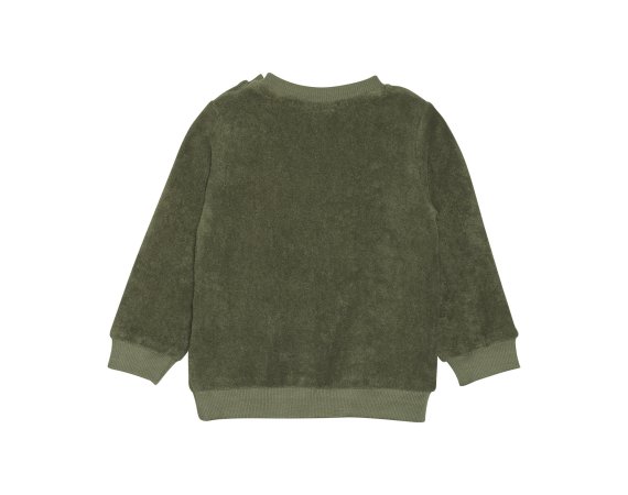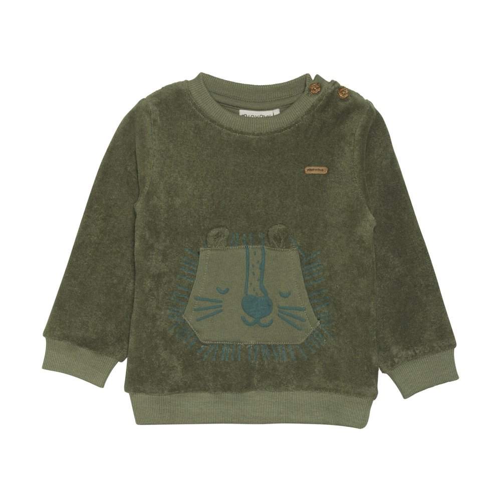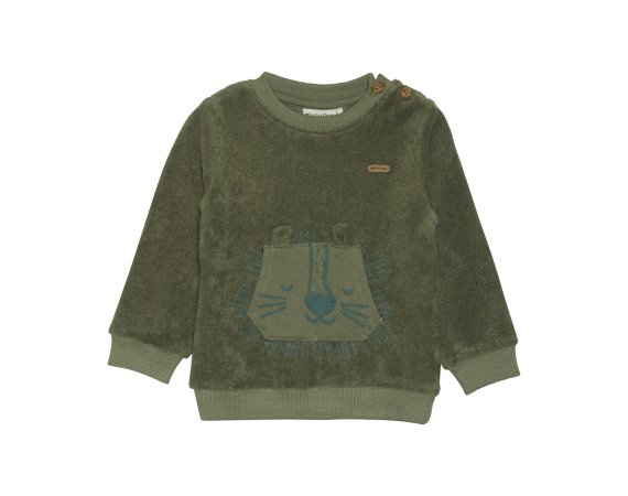 Lækker langærmet frotté sweatshirt med løvemotiv.Sweatshirten har rib i alle åbninger, og lukkes med knapper på venstre skulder.Der fås bukser i samme skønne design.