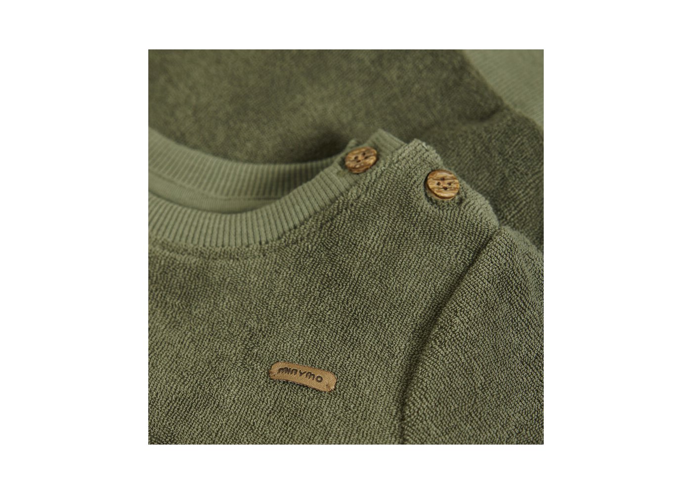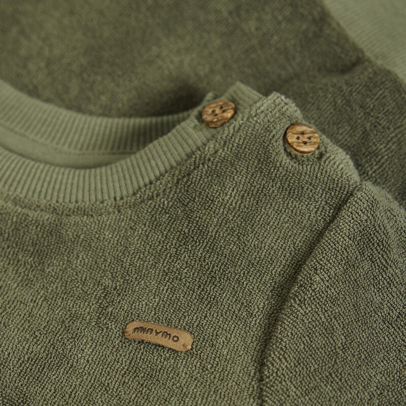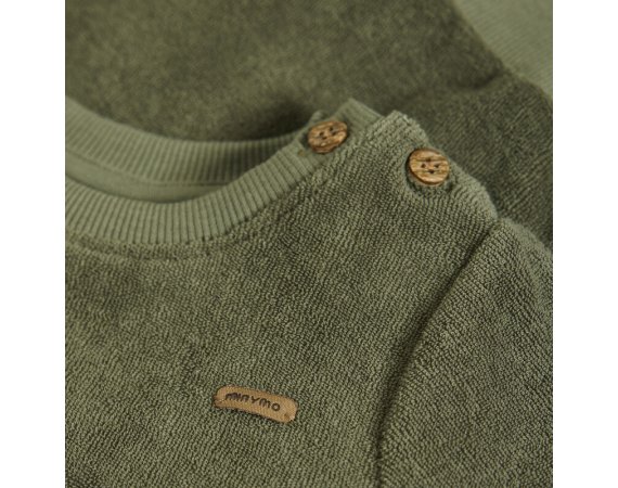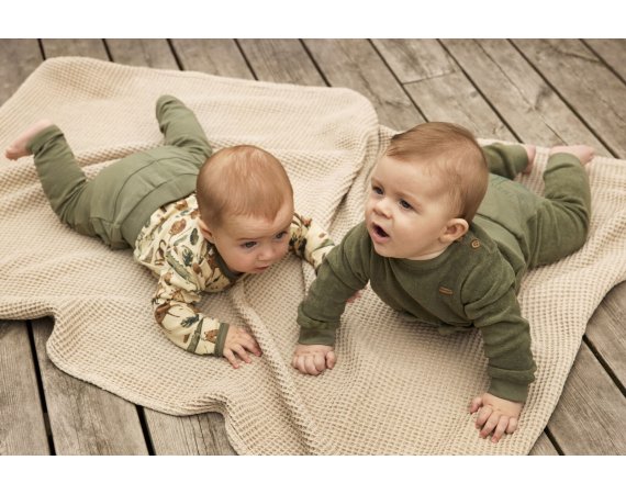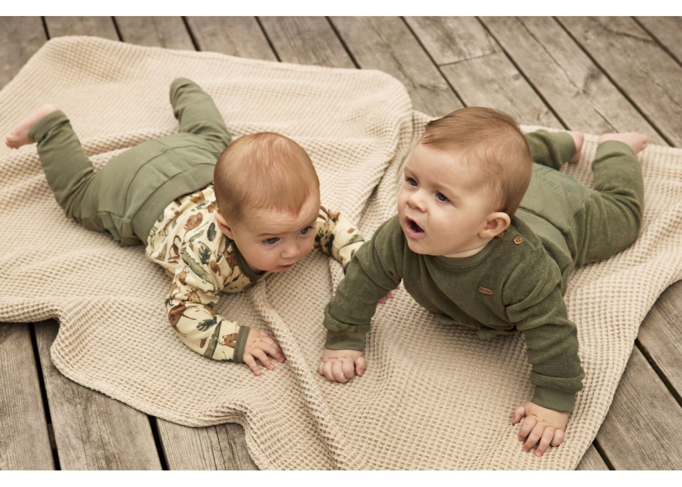 Lækker langærmet frotté sweatshirt med løvemotiv.Sweatshirten har rib i alle åbninger, og lukkes med knapper på venstre skulder.Der fås bukser i samme skønne design.