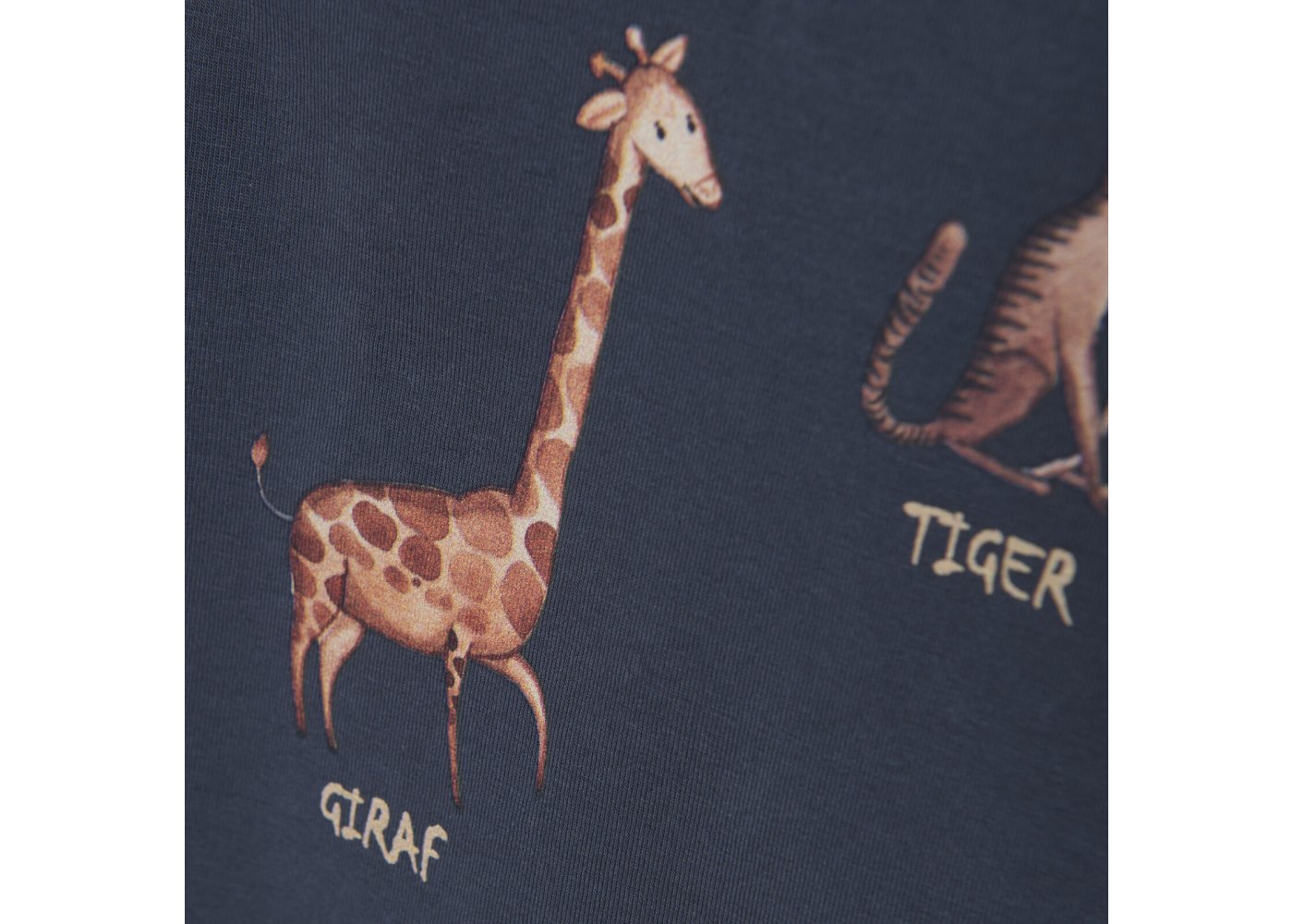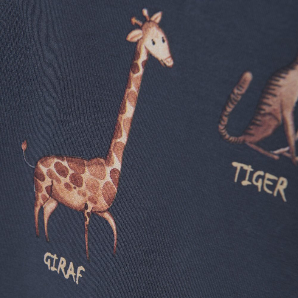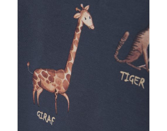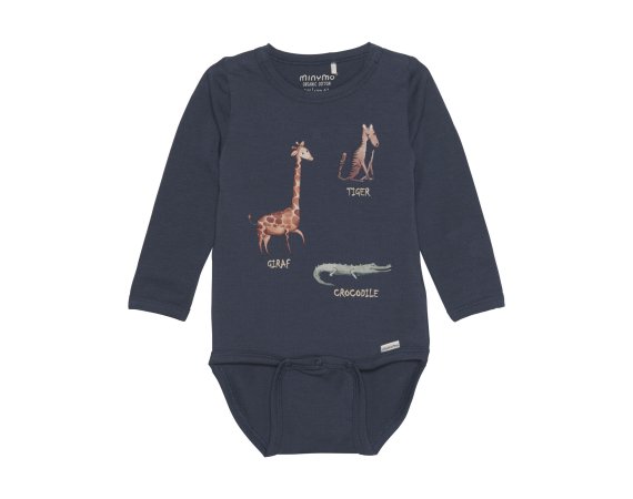 Lækker langærmet jersey body med sødt giraf, tiger og krokodille motiv foran.Bodyen har ribkanter i alle åbninger og lukkes med trykknapper på venstre skulder og imellem ben.