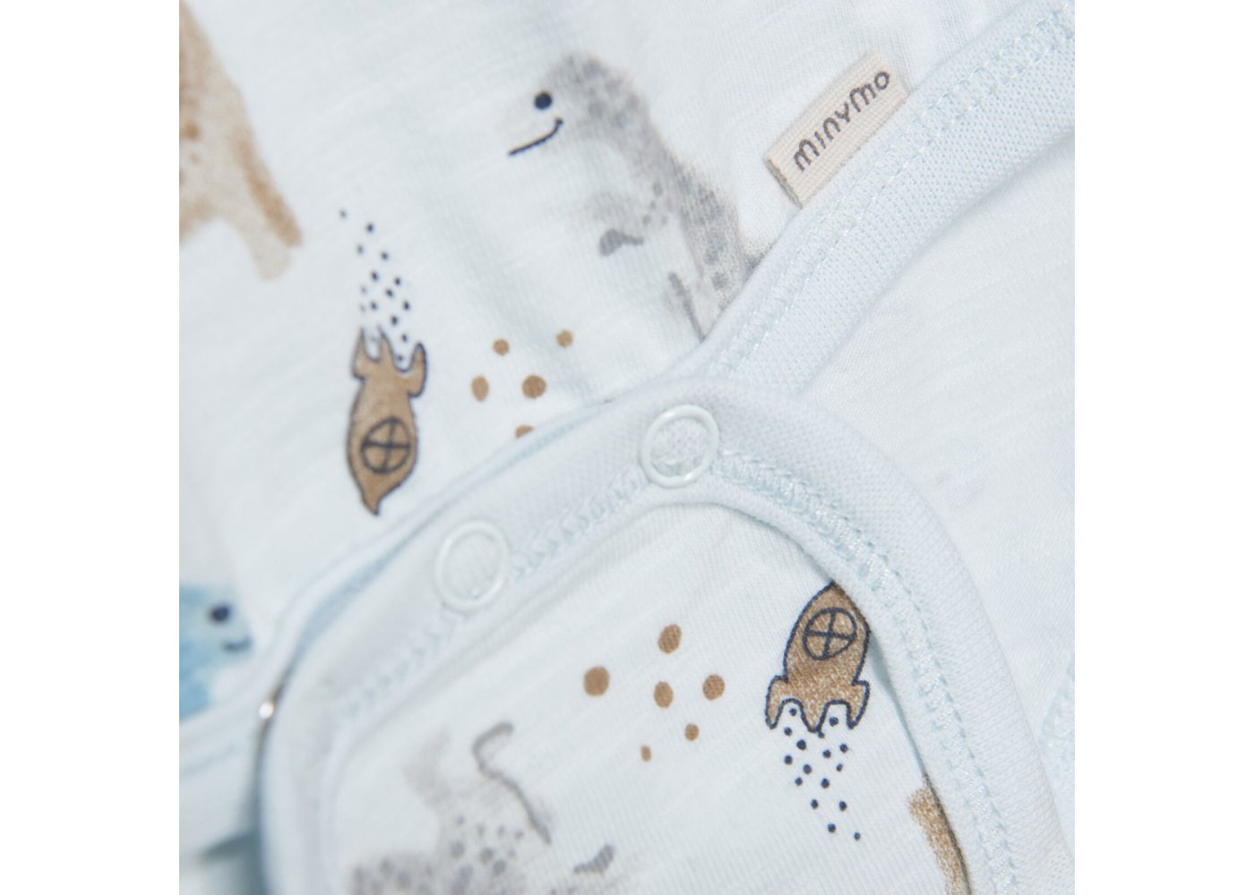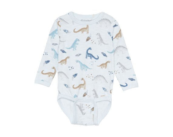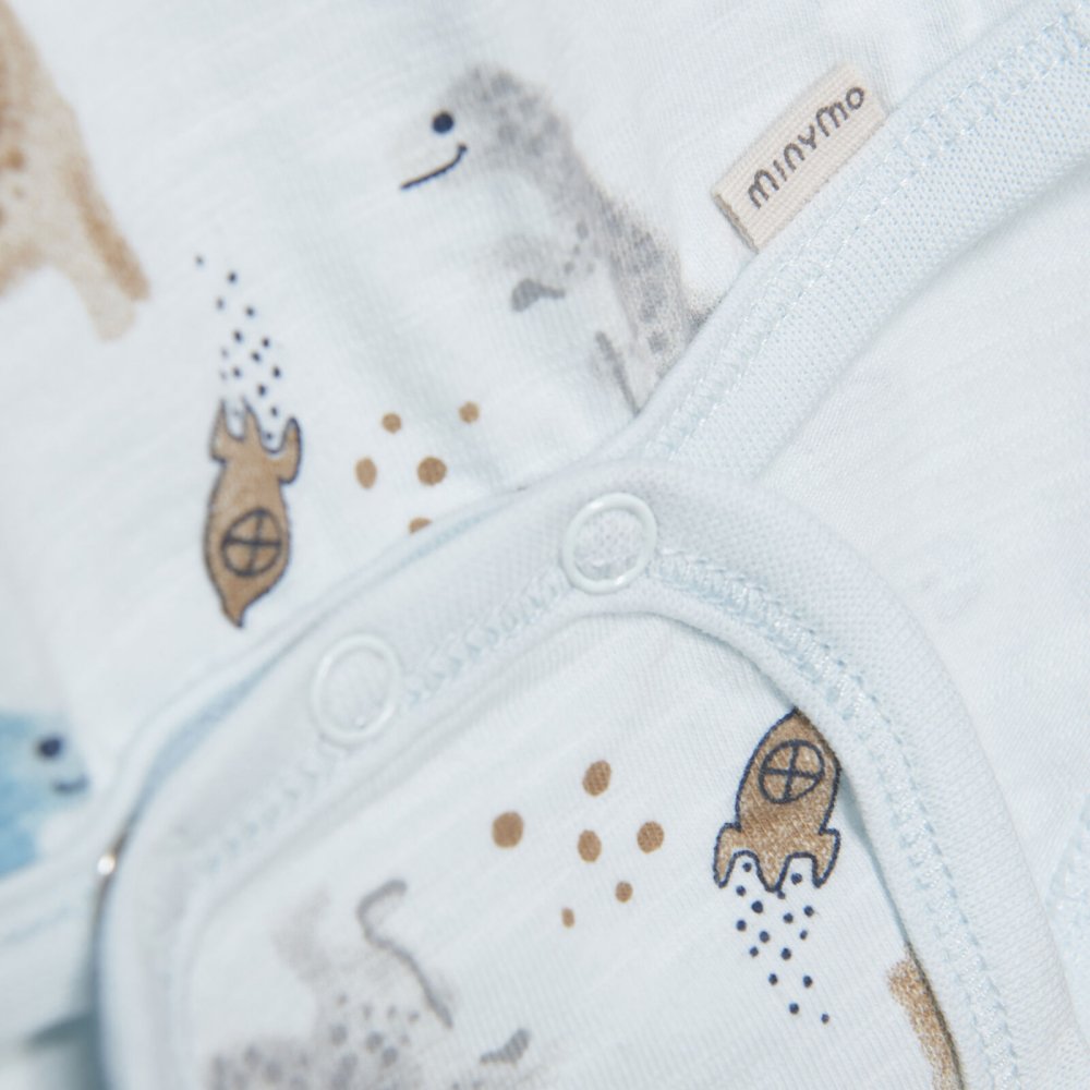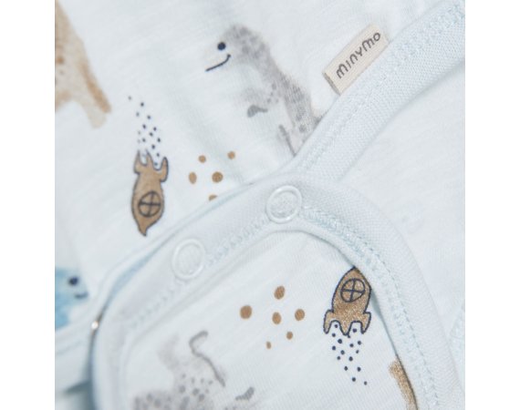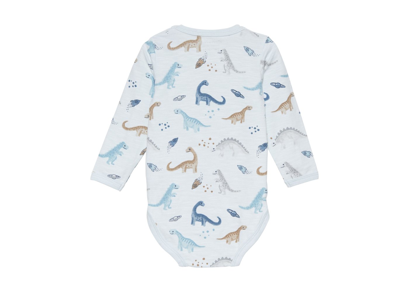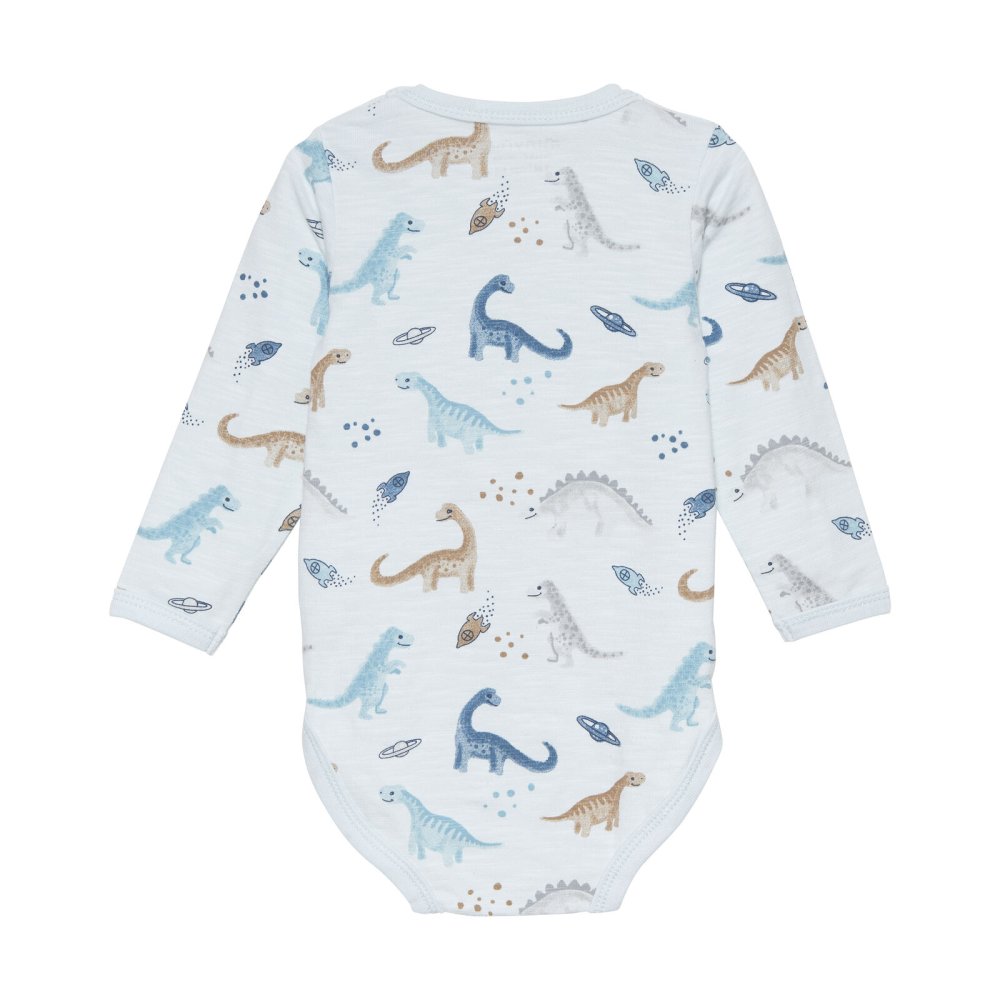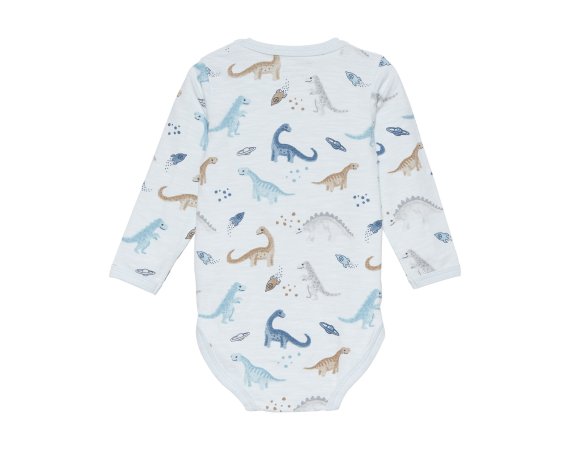 Lækker langærmet jersey body med sødt dinosaur og rumskib motiv foran.Bodyen har ribkanter i alle åbninger og lukkes med trykknapper på skulder og imellem ben.