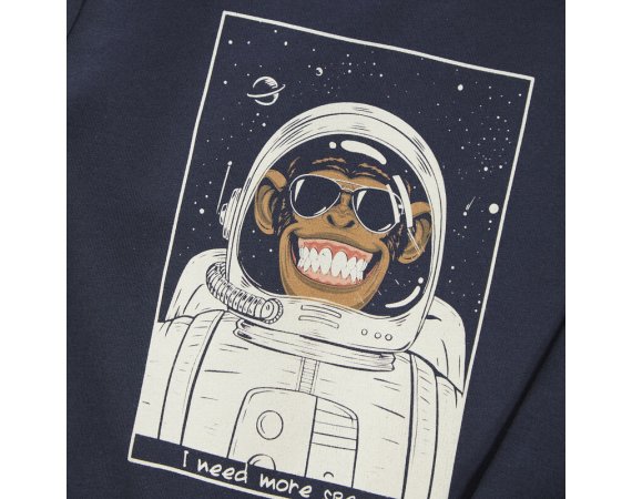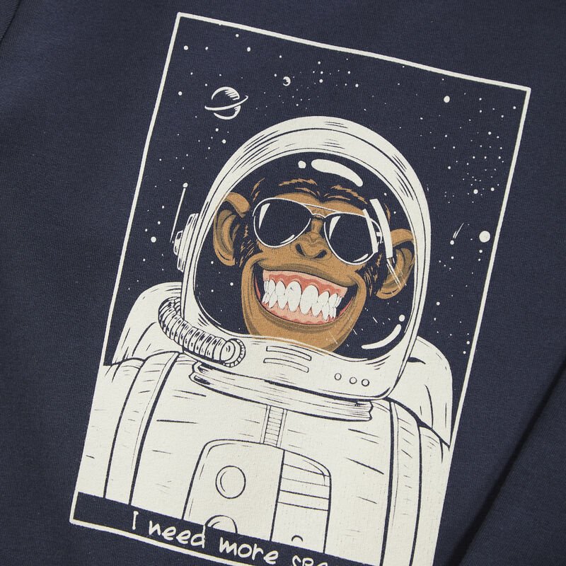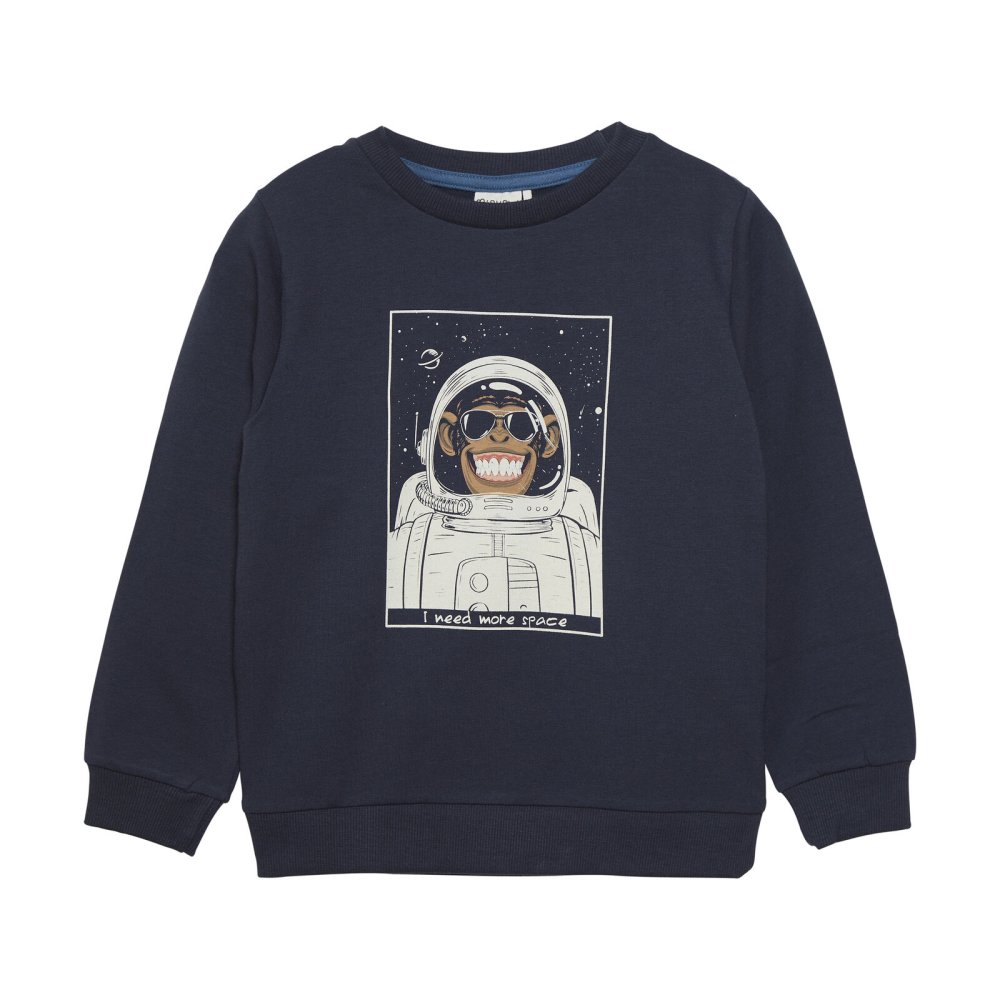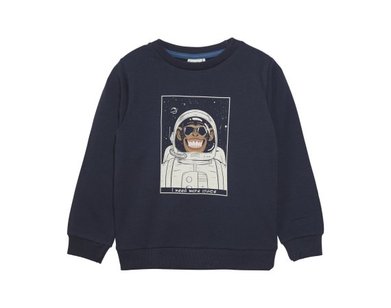Smart sweatshirt med sjovt motiv af en abe i rumdragt foran.Sweatshirten har ribkant i alle åbninger og er ensfarvet bagpå.