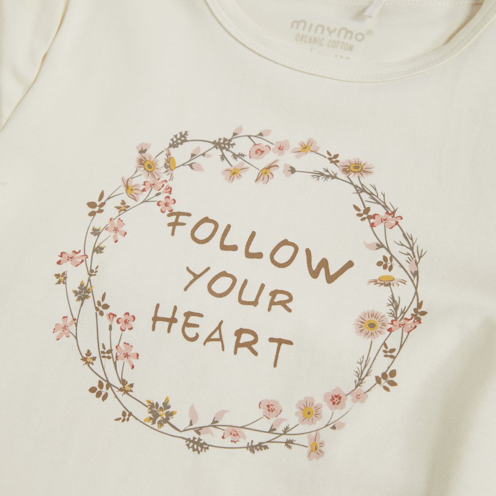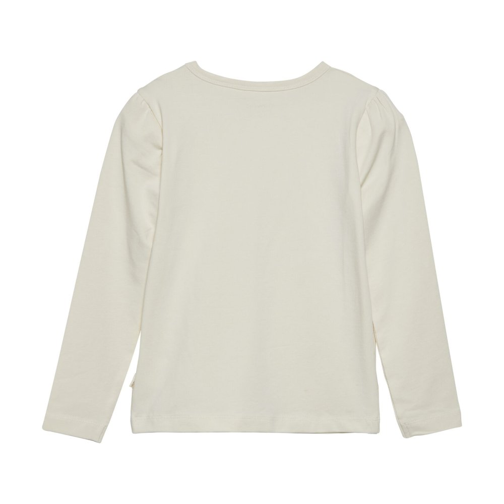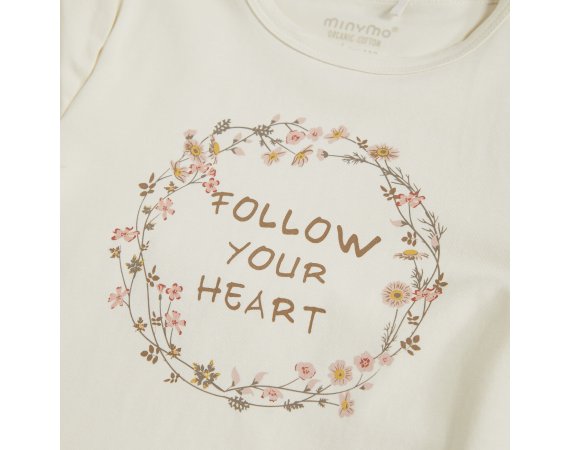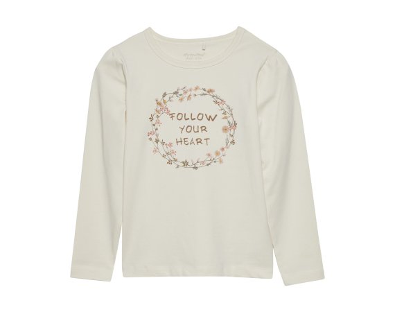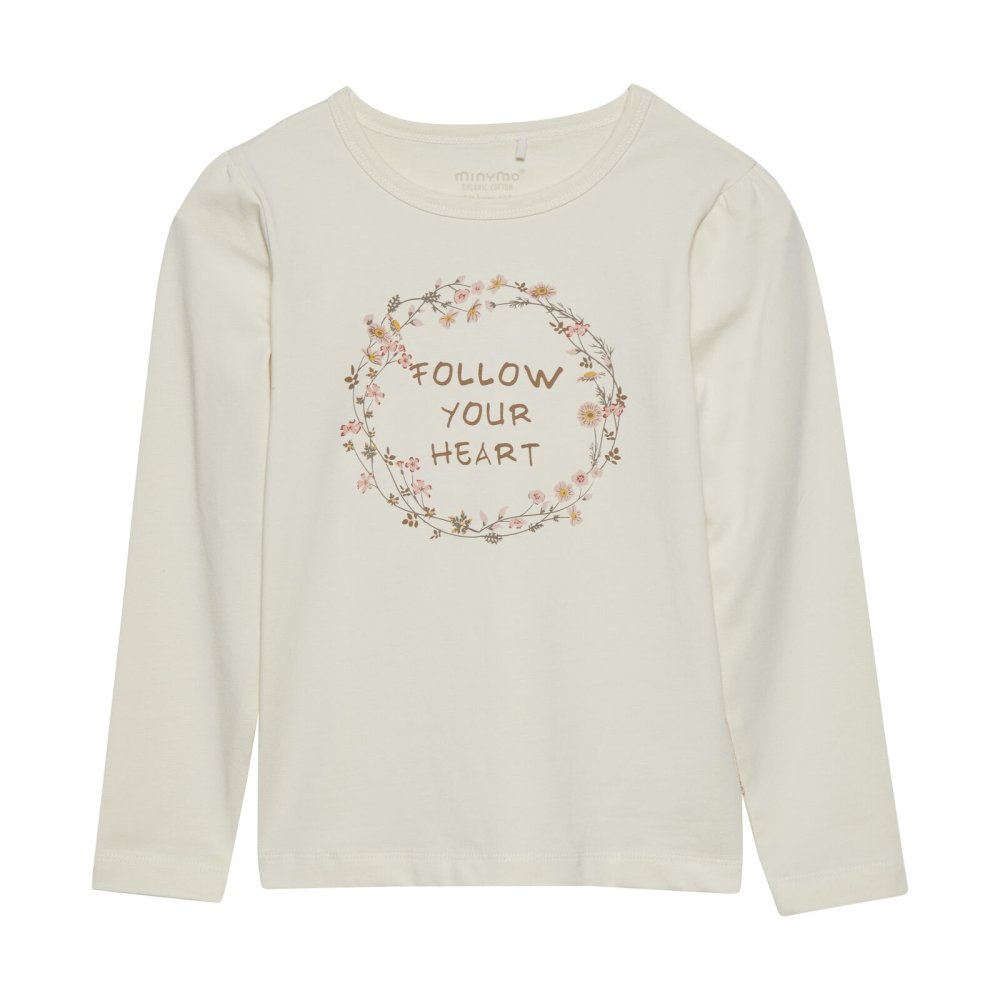 Fin langærmet t-shirt i lækker jersey kvalitet fra Minymo.T-shirten har en fin blomsterkrans foran, og er ensfarvet bagpå.