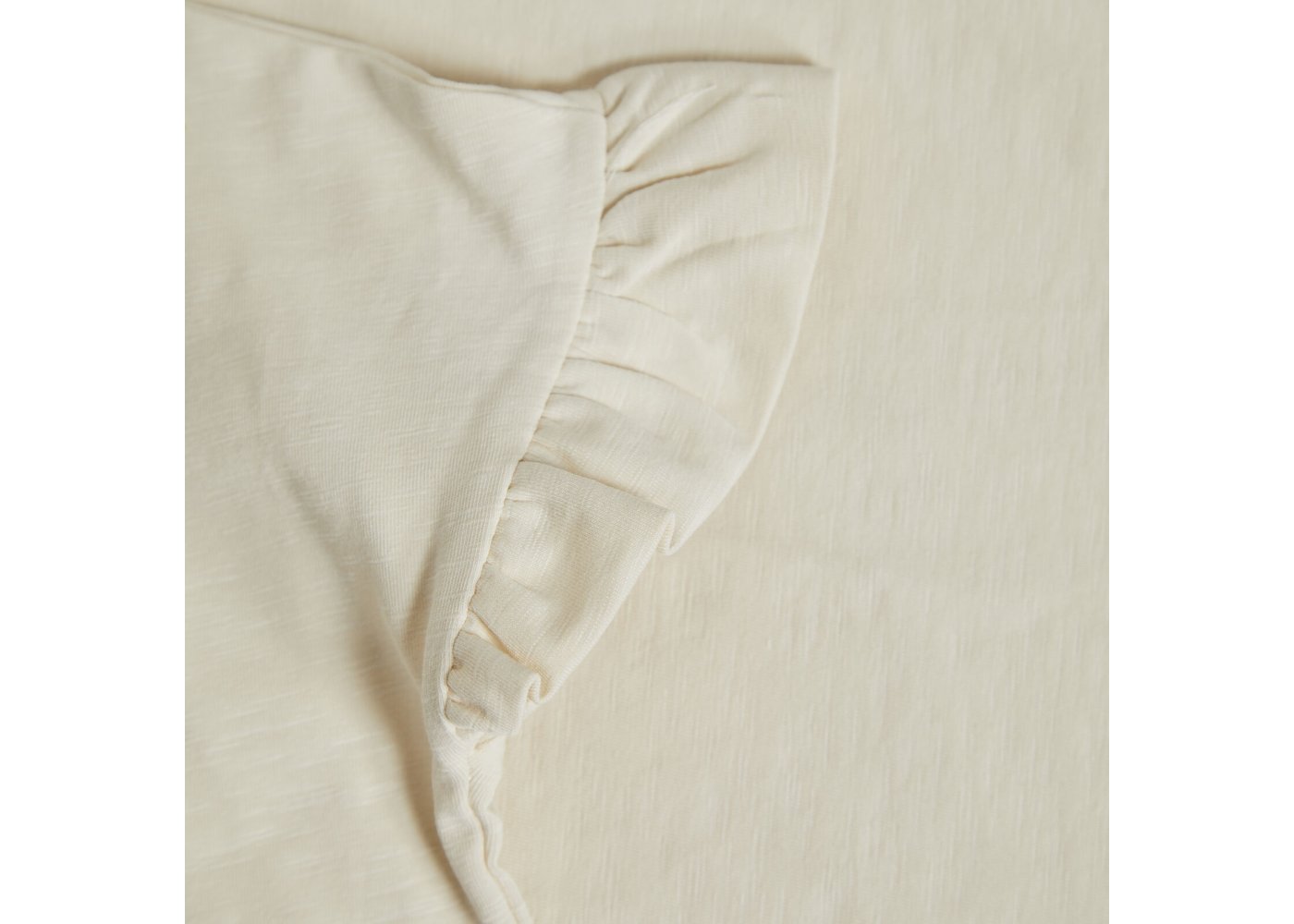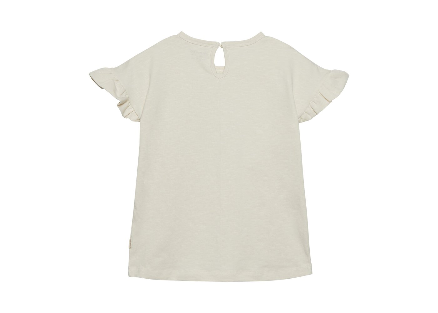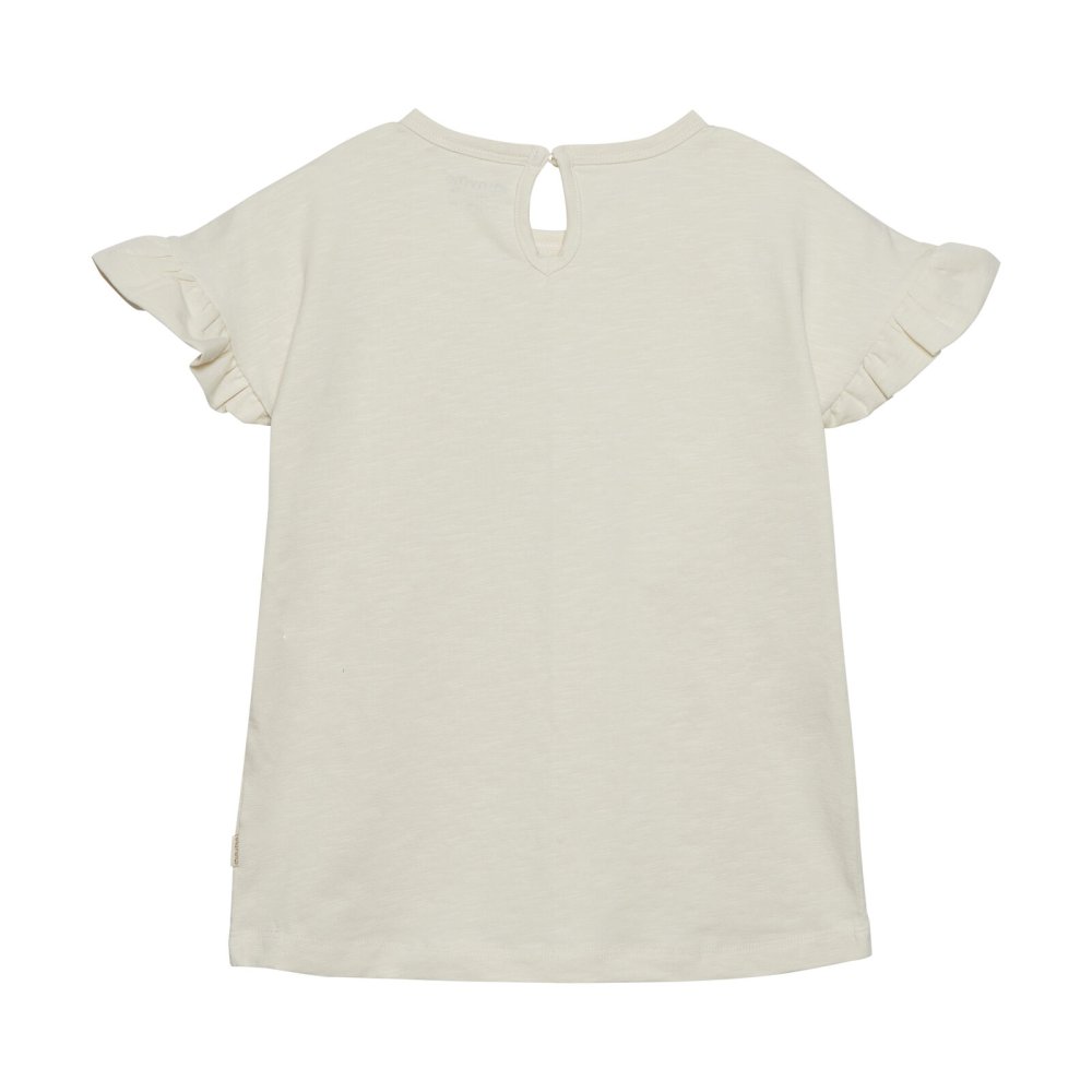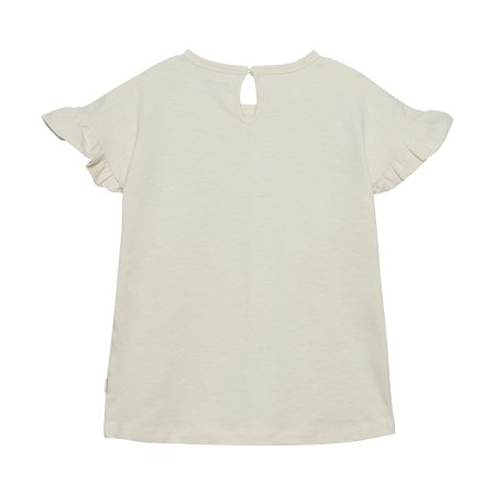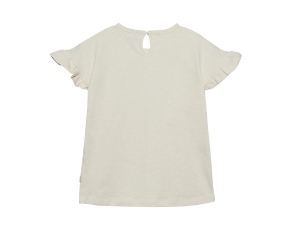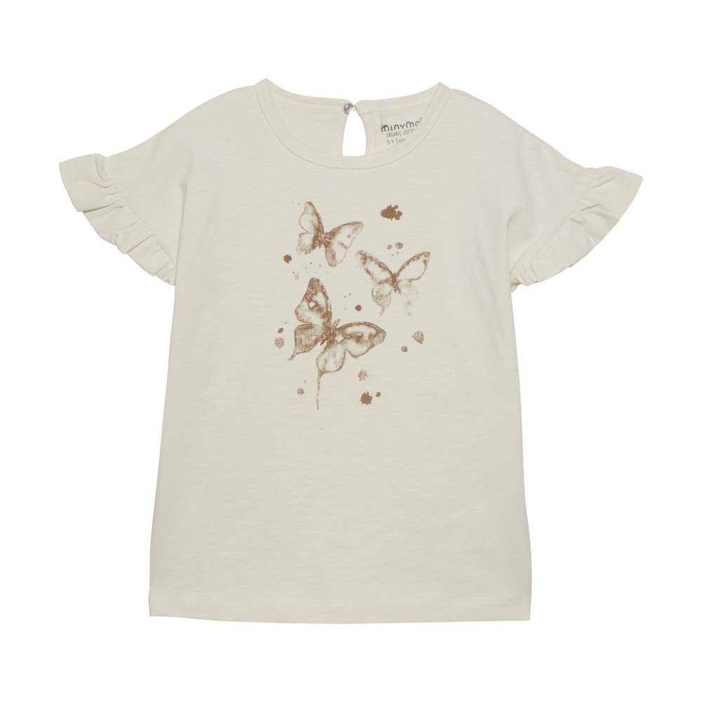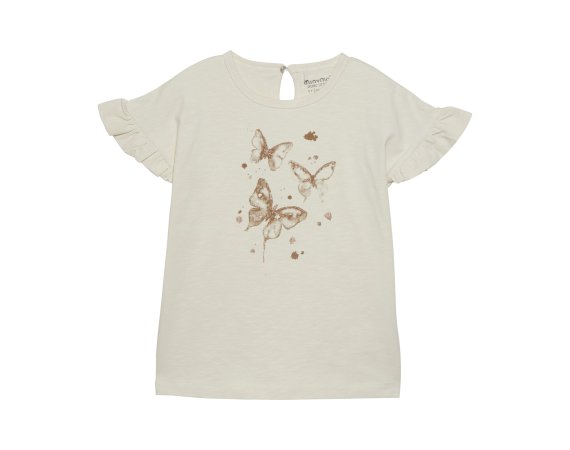 Yndig jersey bluse med sommerfugle motiv foran.Blusen har ærmer med flæser, og lukkes bagpå med knap