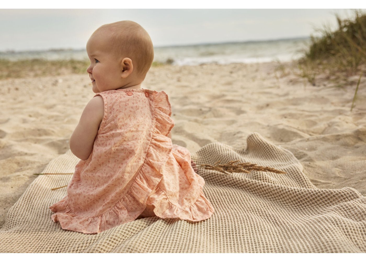 Slå-om kjolen er uden ærmer, og har en flot flæsekant. Den lukkes med knapper bagpå.