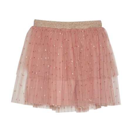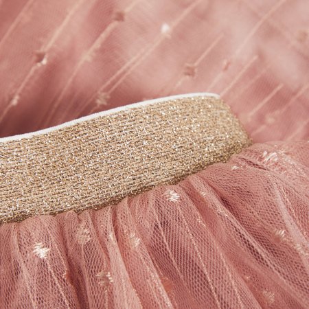 Super sød tyl nederdel i rosa med guldglimmer.Nederdelen har en bred elastikkant i livet og lagdelt skørt med rynk og fylde.