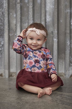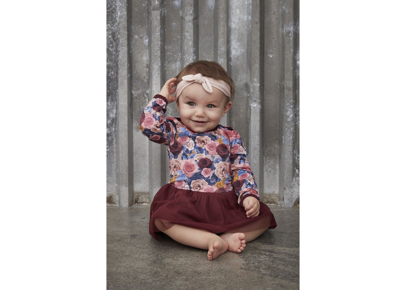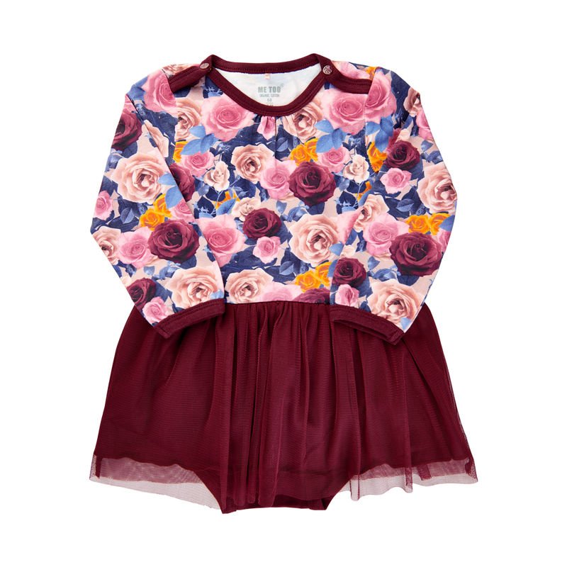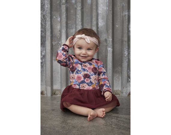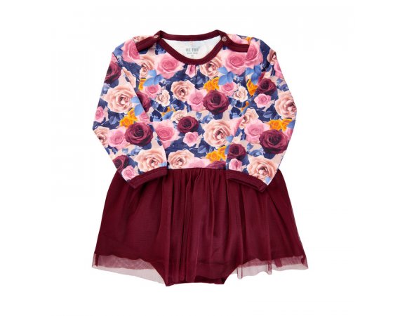 Super skøn og yndig kjole body med flot print af roser i forskellige farver.Kjolen har faste ensfarvede ribkanter i samme farve som tylskørt.