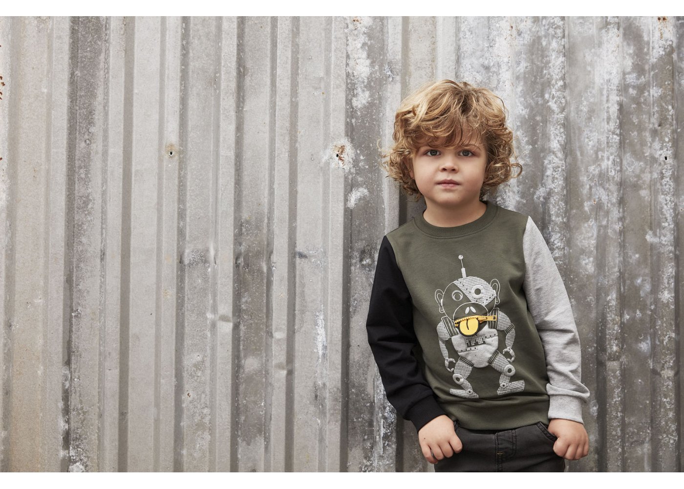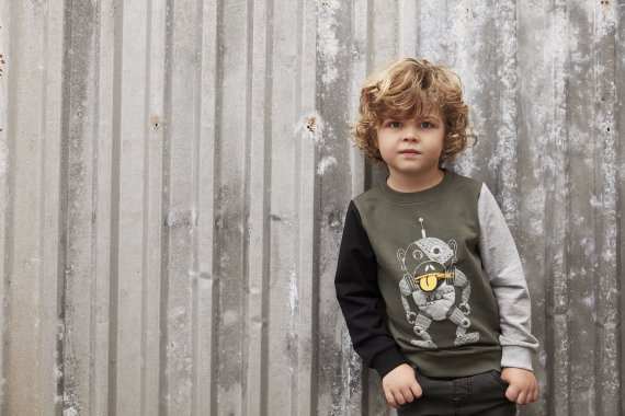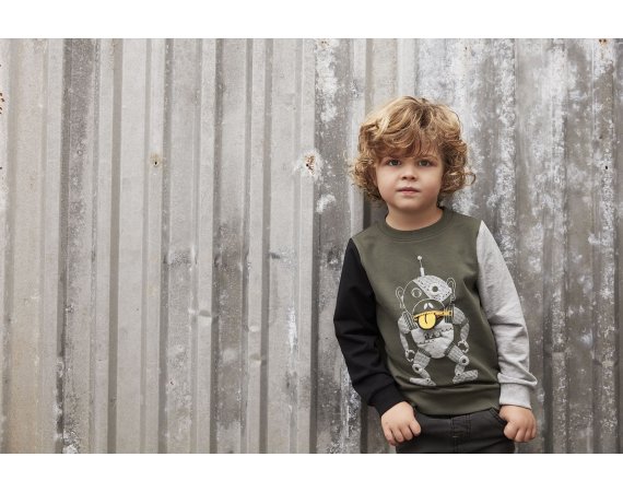 T-shirten har robotprint med en lynlås mund på brystet. Blusen har smal ribkant i halsåbning og brede ribkanter i livet og ved håndled.