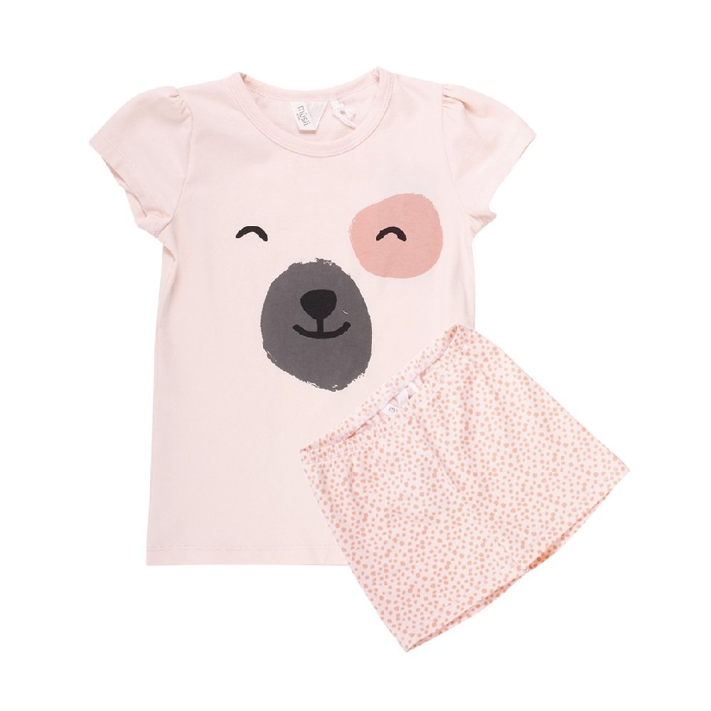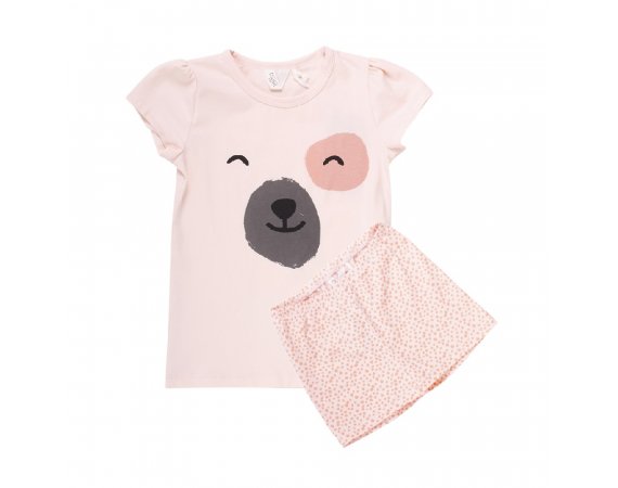 Sød kortærmet pyjamas med bamse på maven og plettede shorts