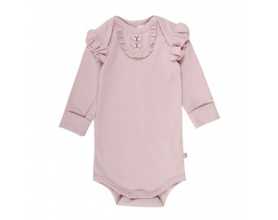 Bodyen har flæser ved skuldre og et smukt broderi med sommerfugle fortil.