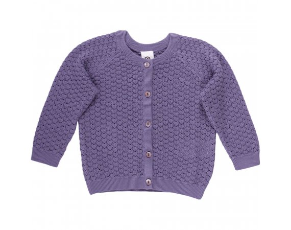 Super lækker cardigan i lilla strikCardigan med yndigt hulmønster der knappes foran med knapper.