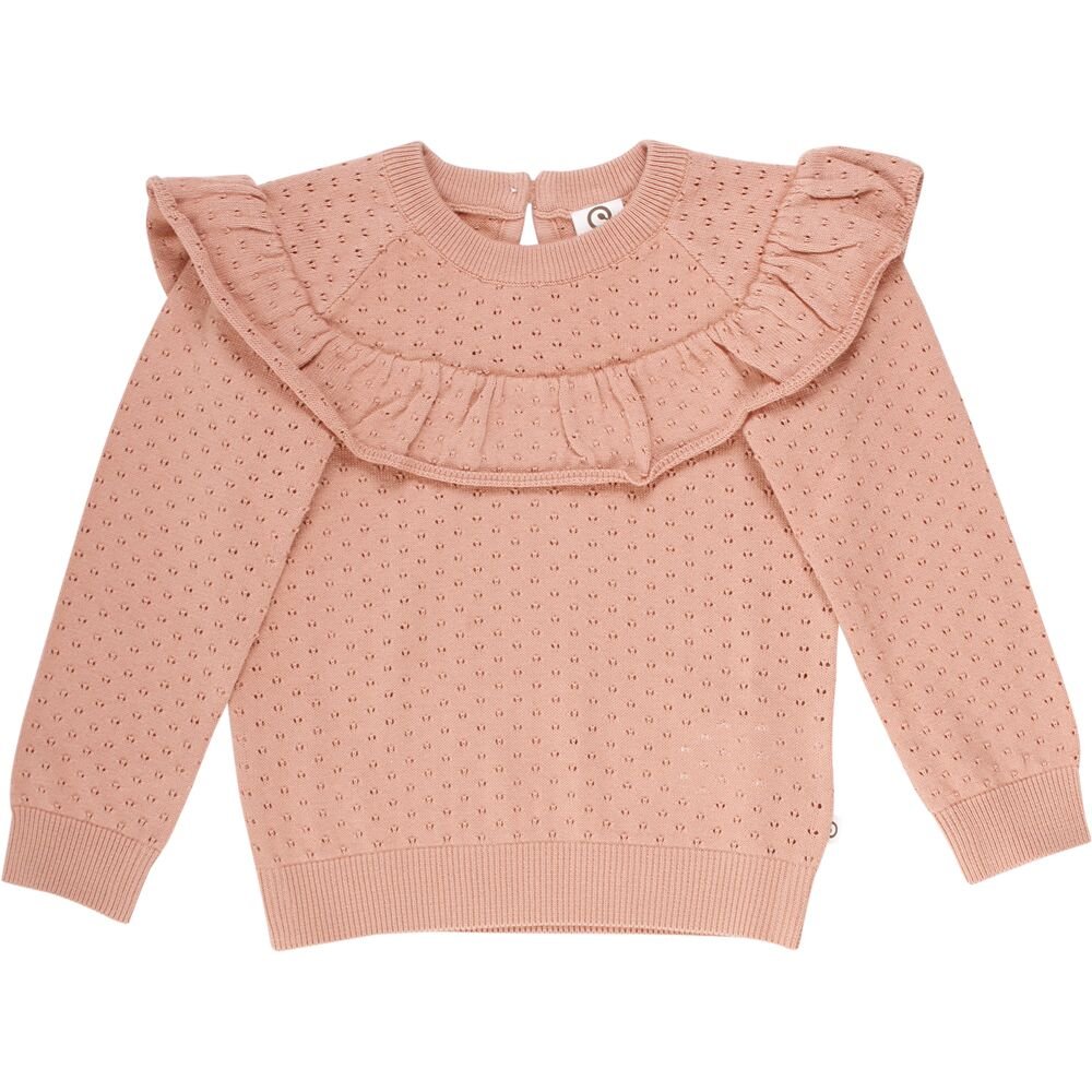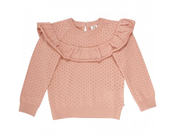 Yndig blød og lækker striktrøje med hulmønster og flæseTrøjen har ribkanter i alle åbninger og lukkes i nakken med knap.