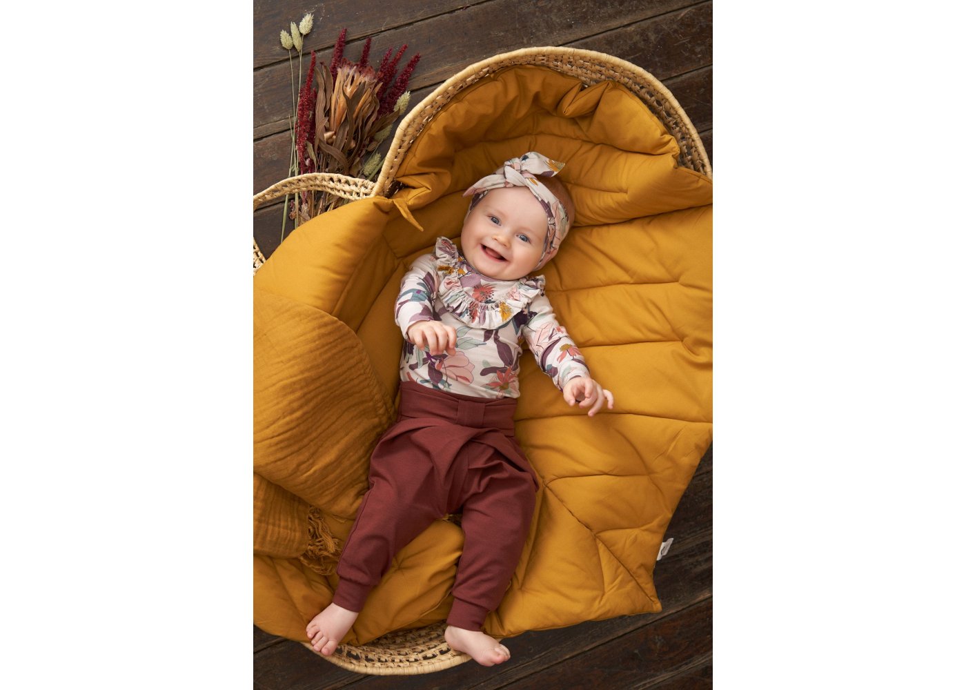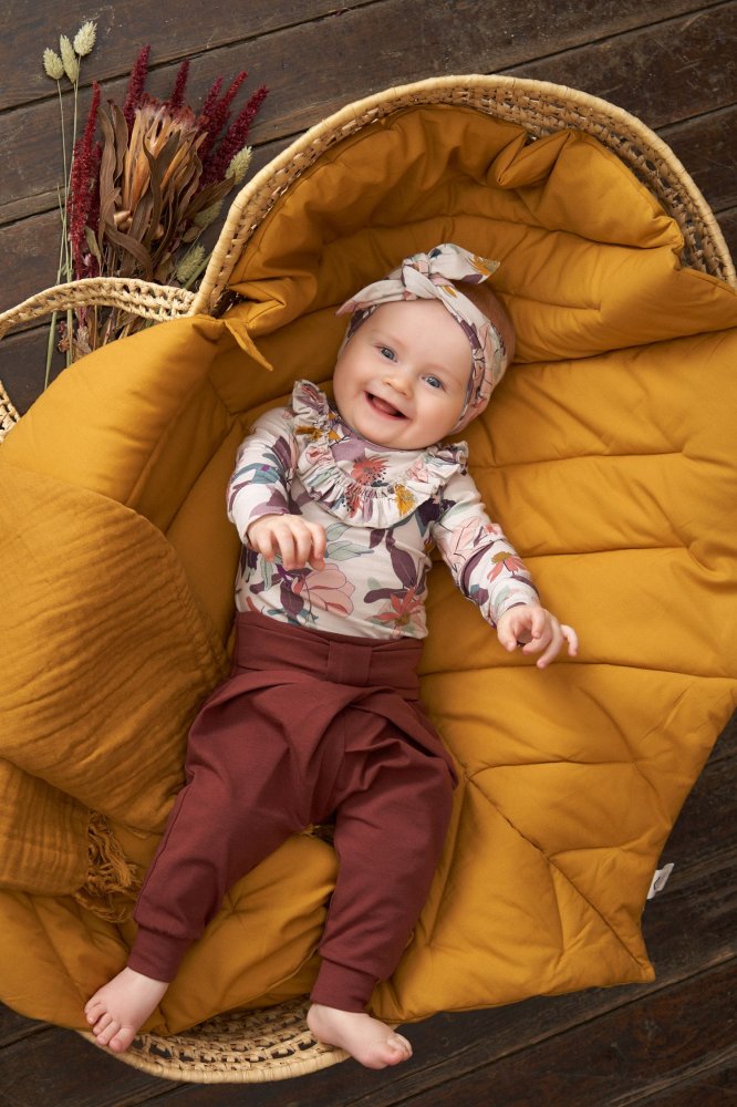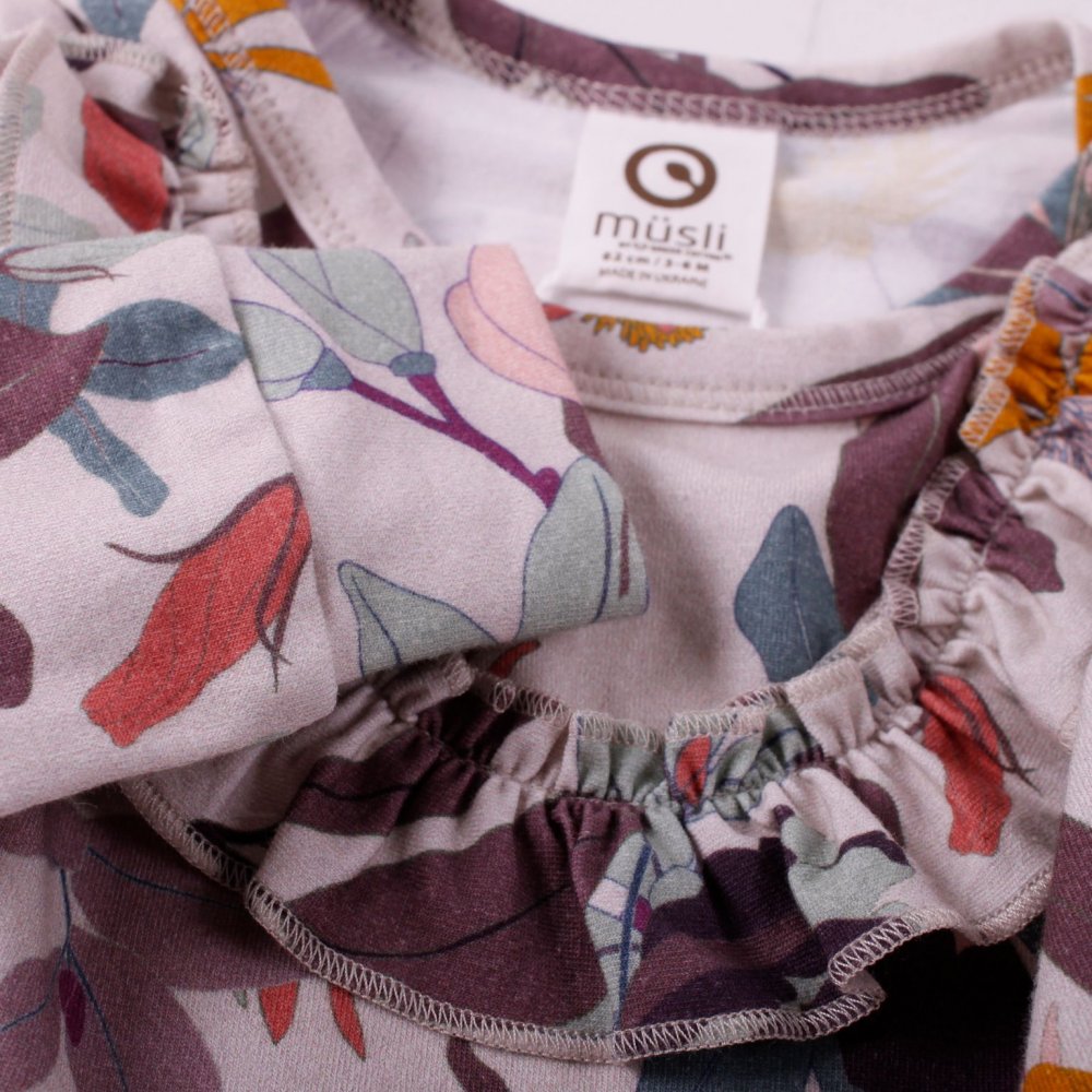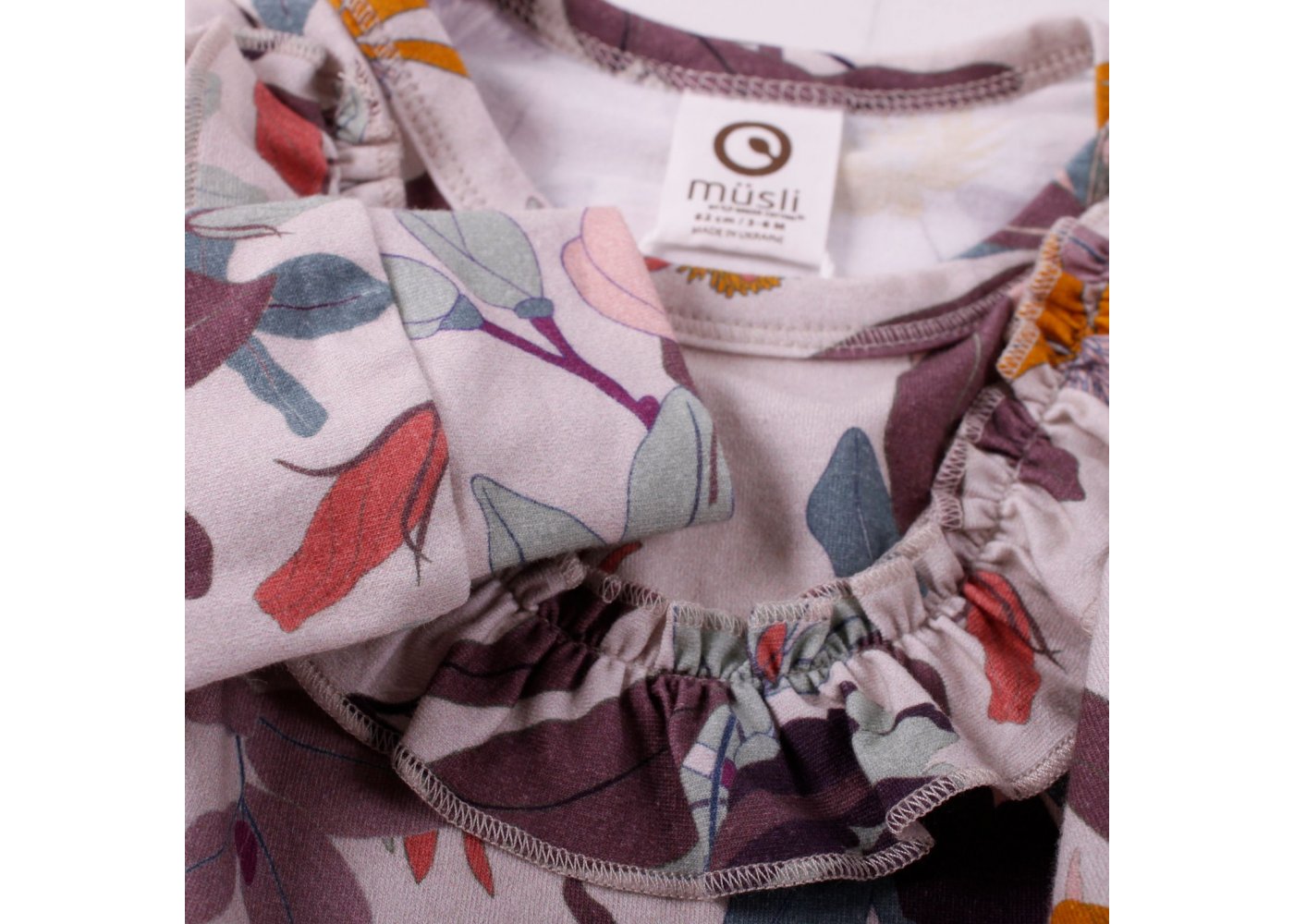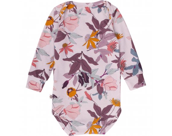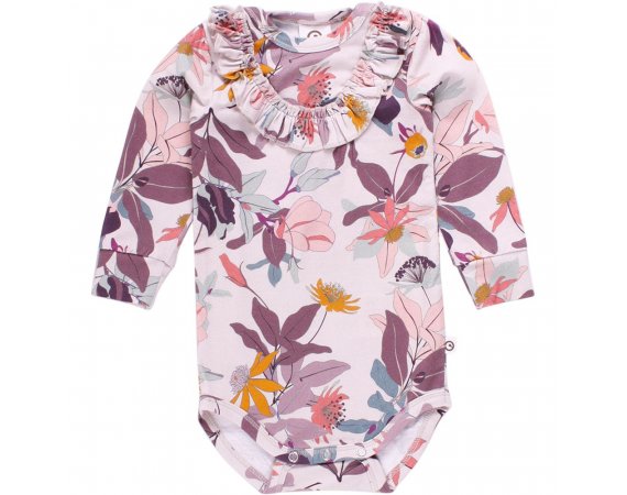Super sød langærmet body med blomsterprint.Bodyen har en sød flæse foran på brystet, der giver den et flot look.