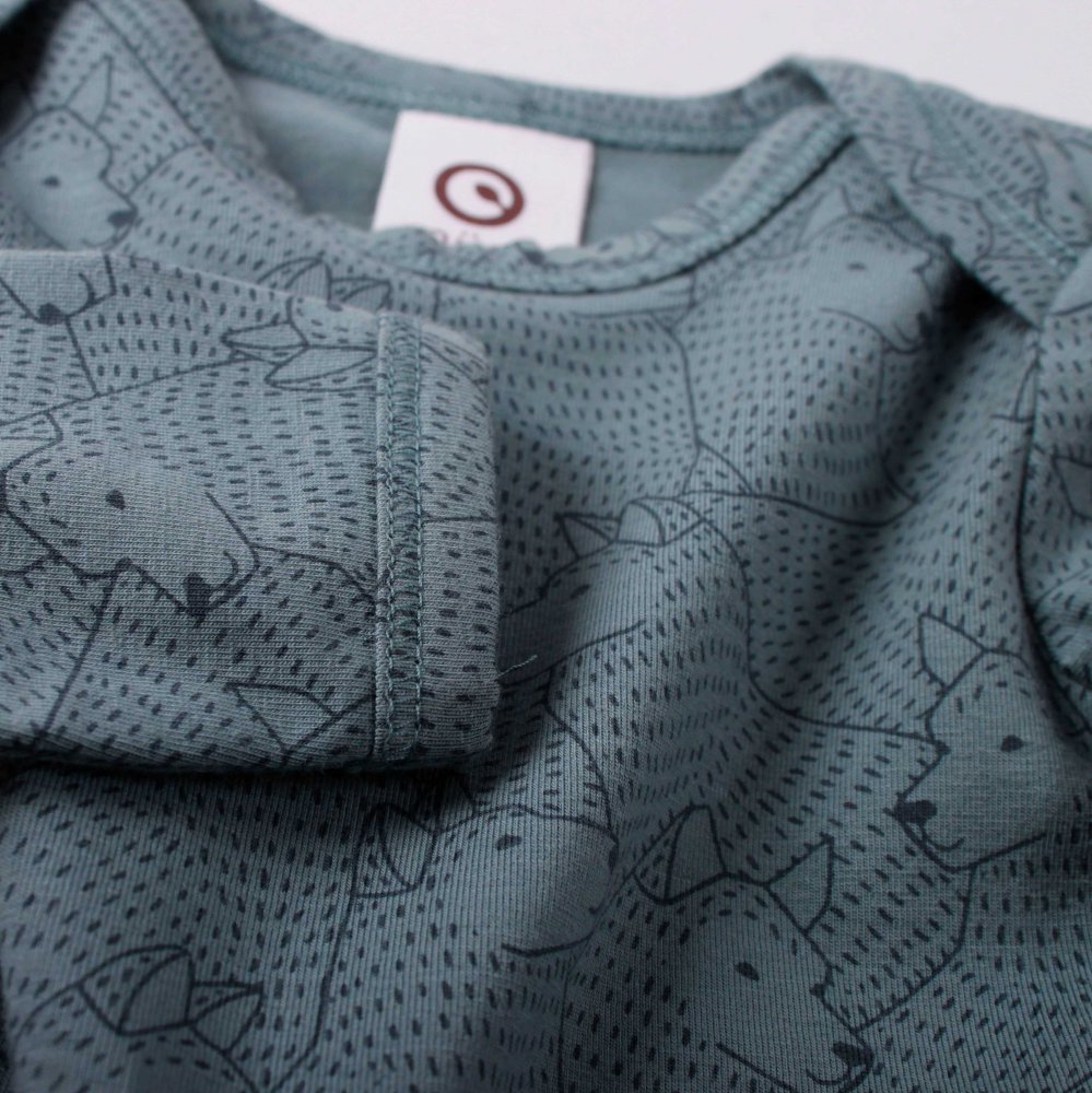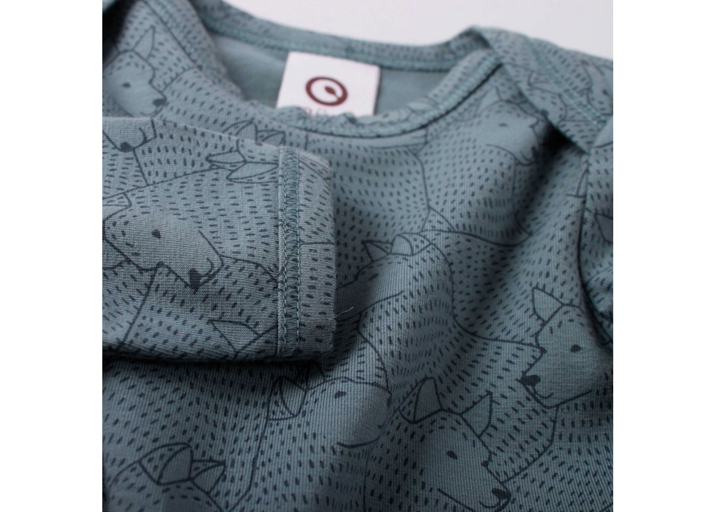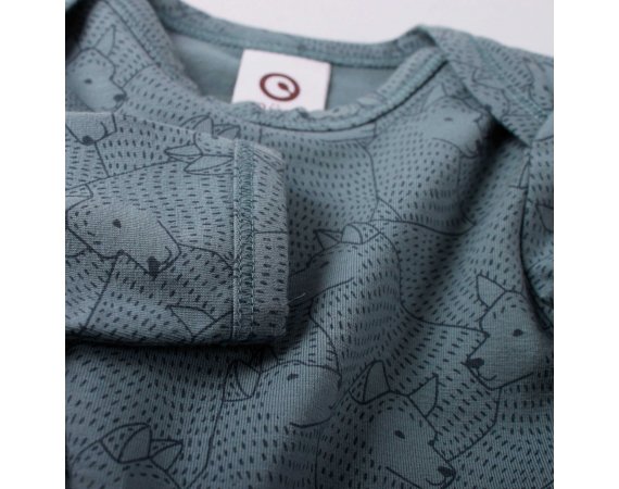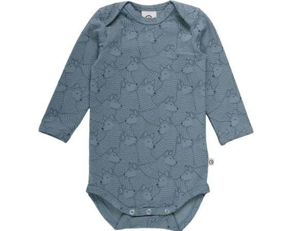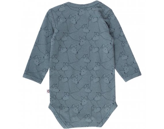 Sød langærmet body med ulveprint.Bodyen har kuvertlukning og lukkes med trykknapper imellem ben.