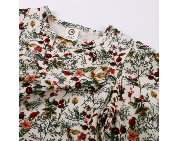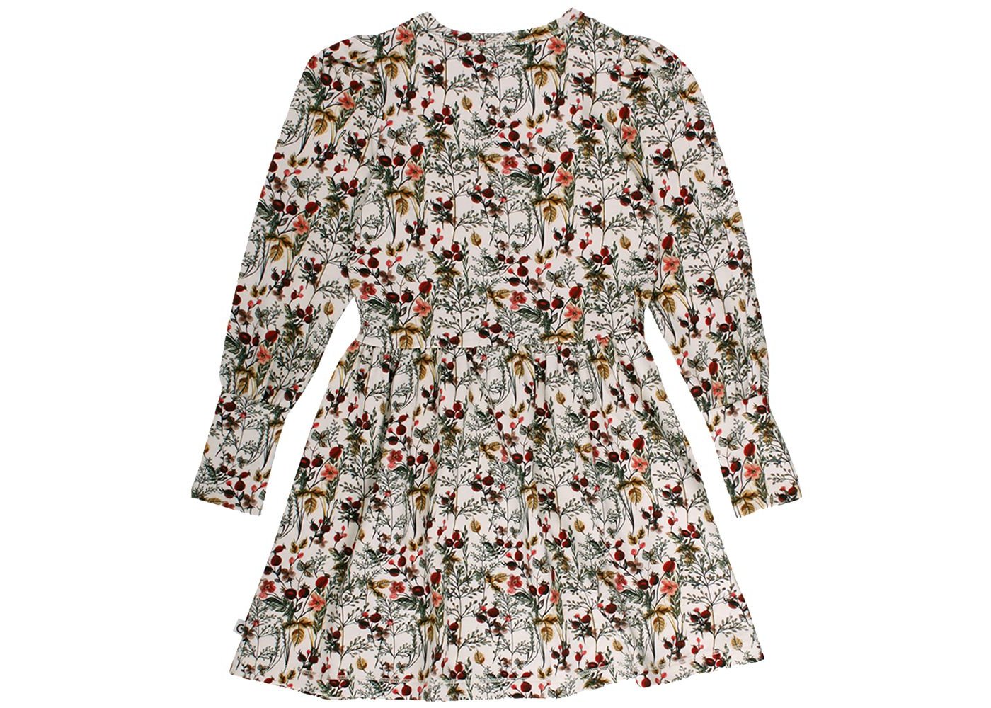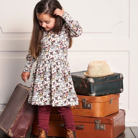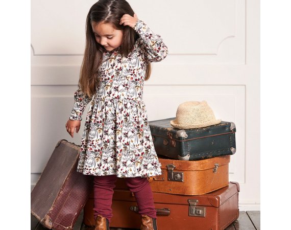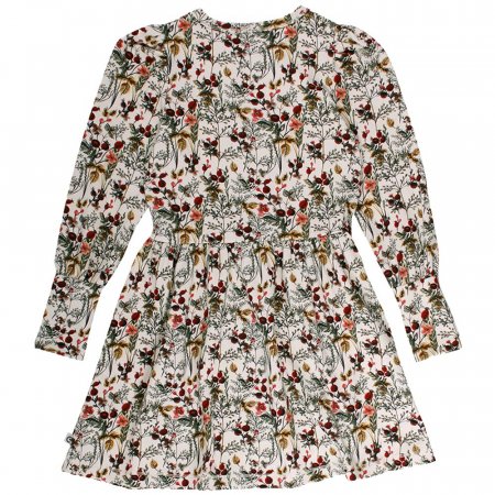 Feminin, yndig kjole med flæser og søde finesser.Kjolen har lange ærmer, læg ved skuldre og et bredt fast stykke nederst på ærmer, som giver flot puff effekt