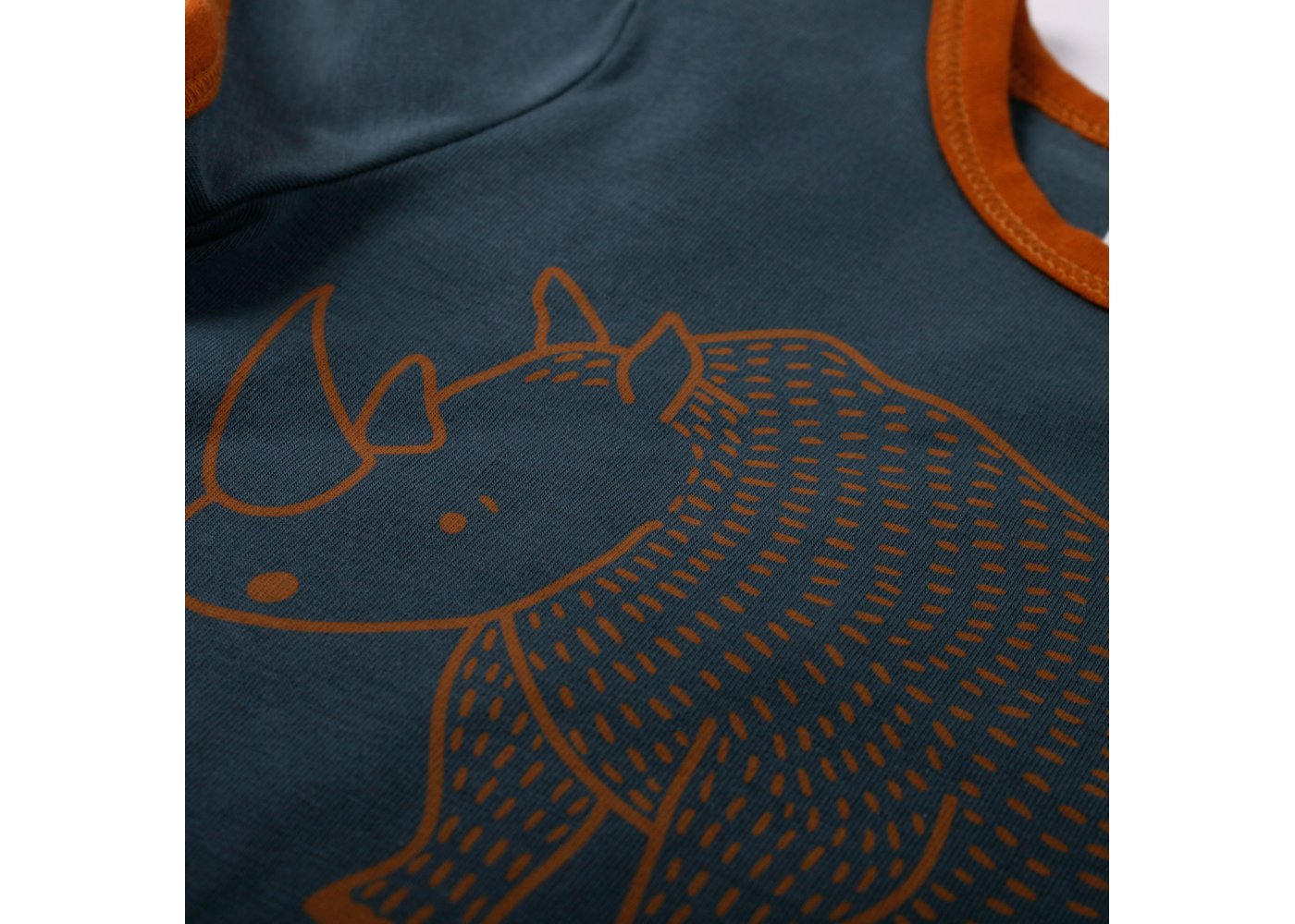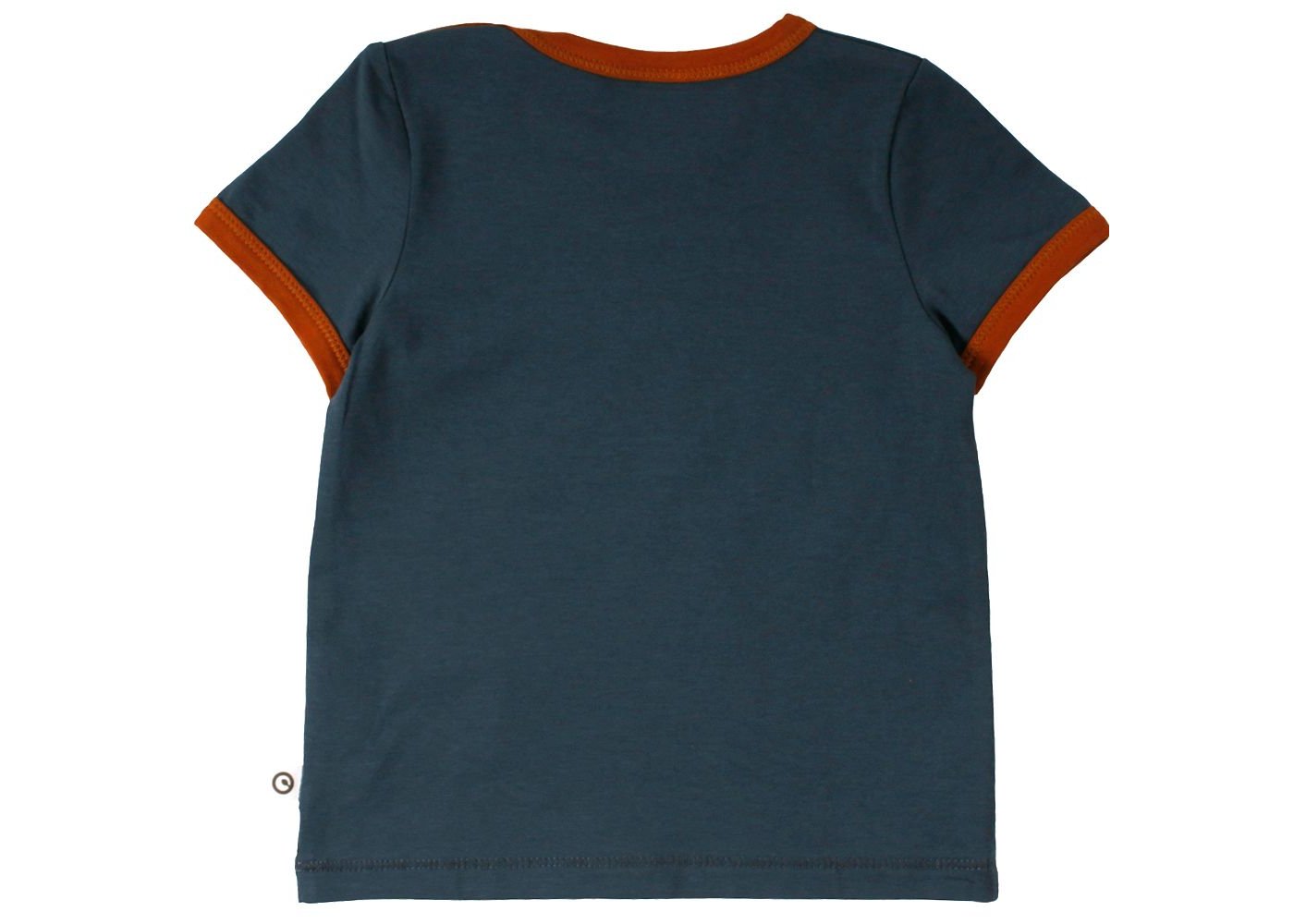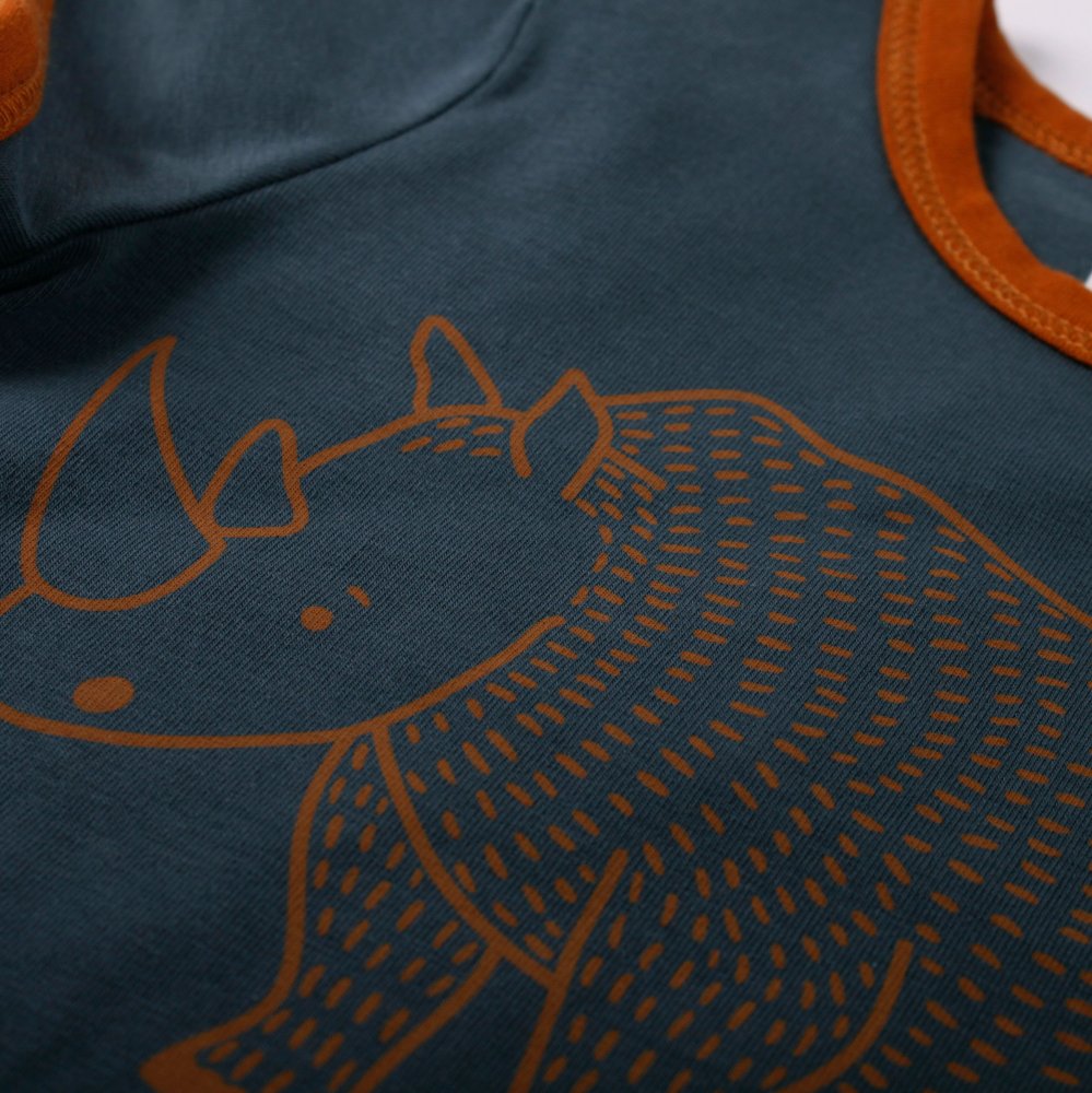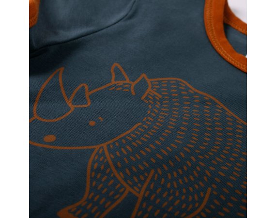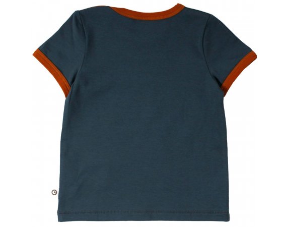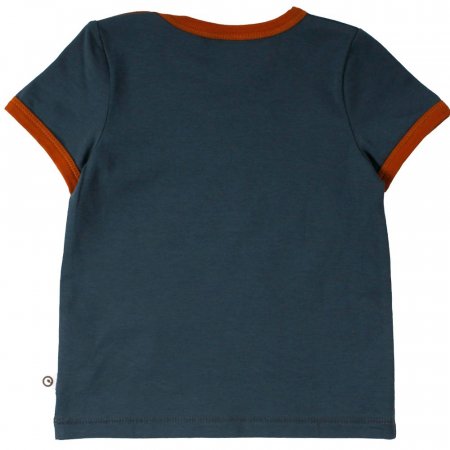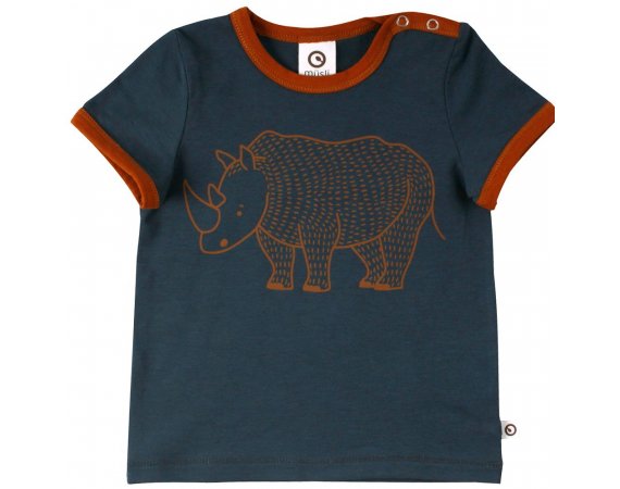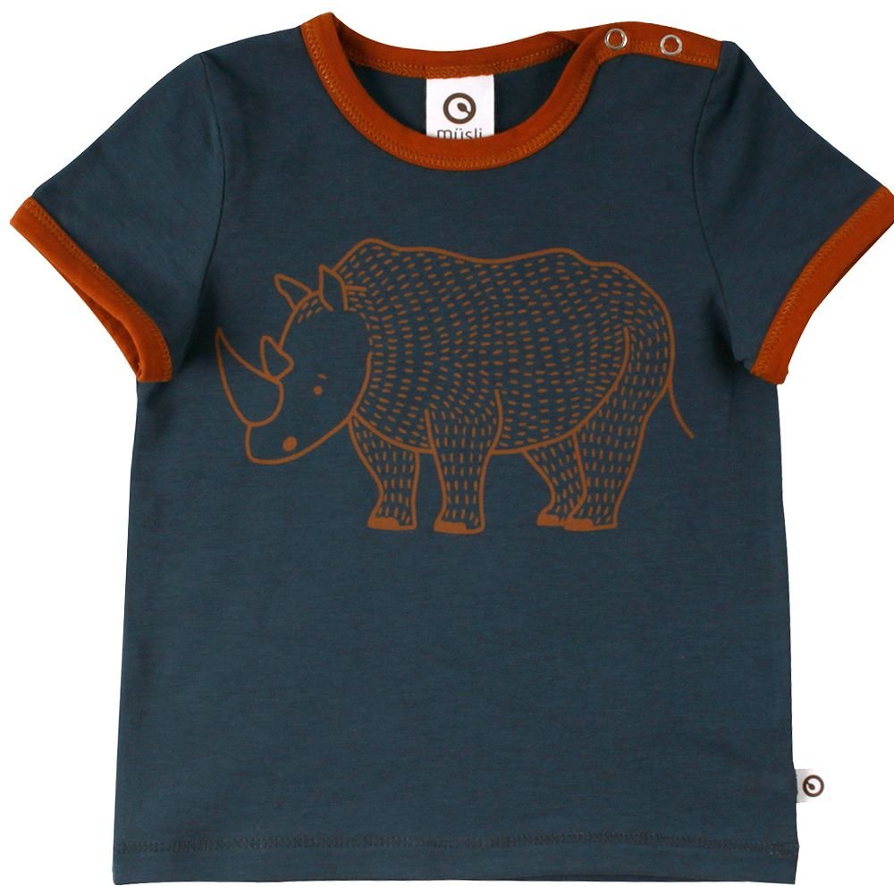 Lækker kortærmet t-shirt i navy blå med sejt print af en næsehorn foran.müsli t-shirten har en flot rib kant i okker-kontrastsfarve i halsudskæring og ved ærmer. Den lukkes med trykknapper på venstre skulder og er lavet i en lækker blød og strækbar kvalitet.