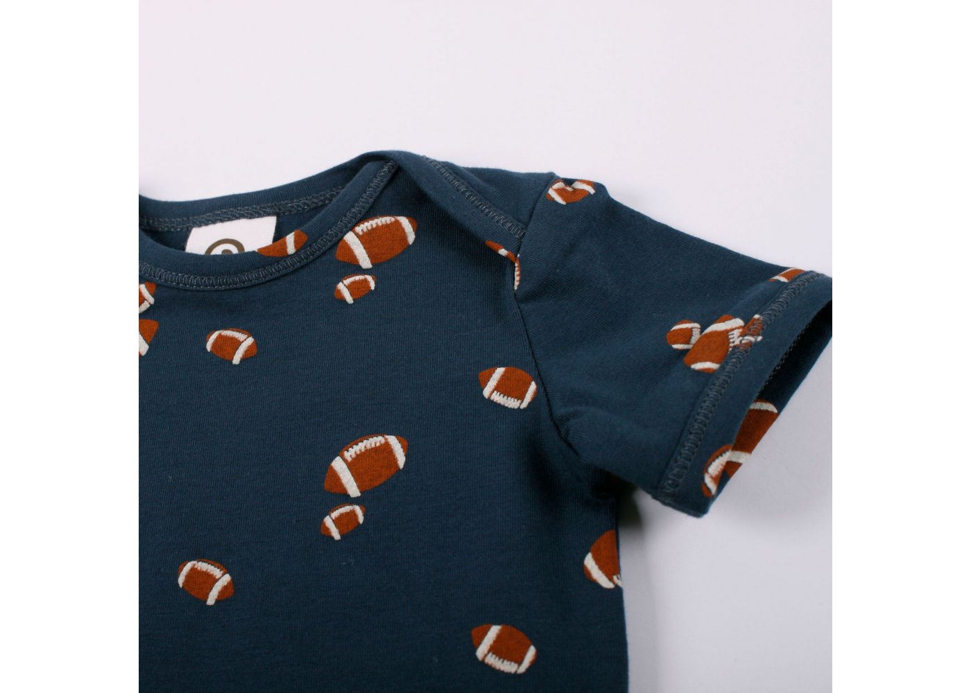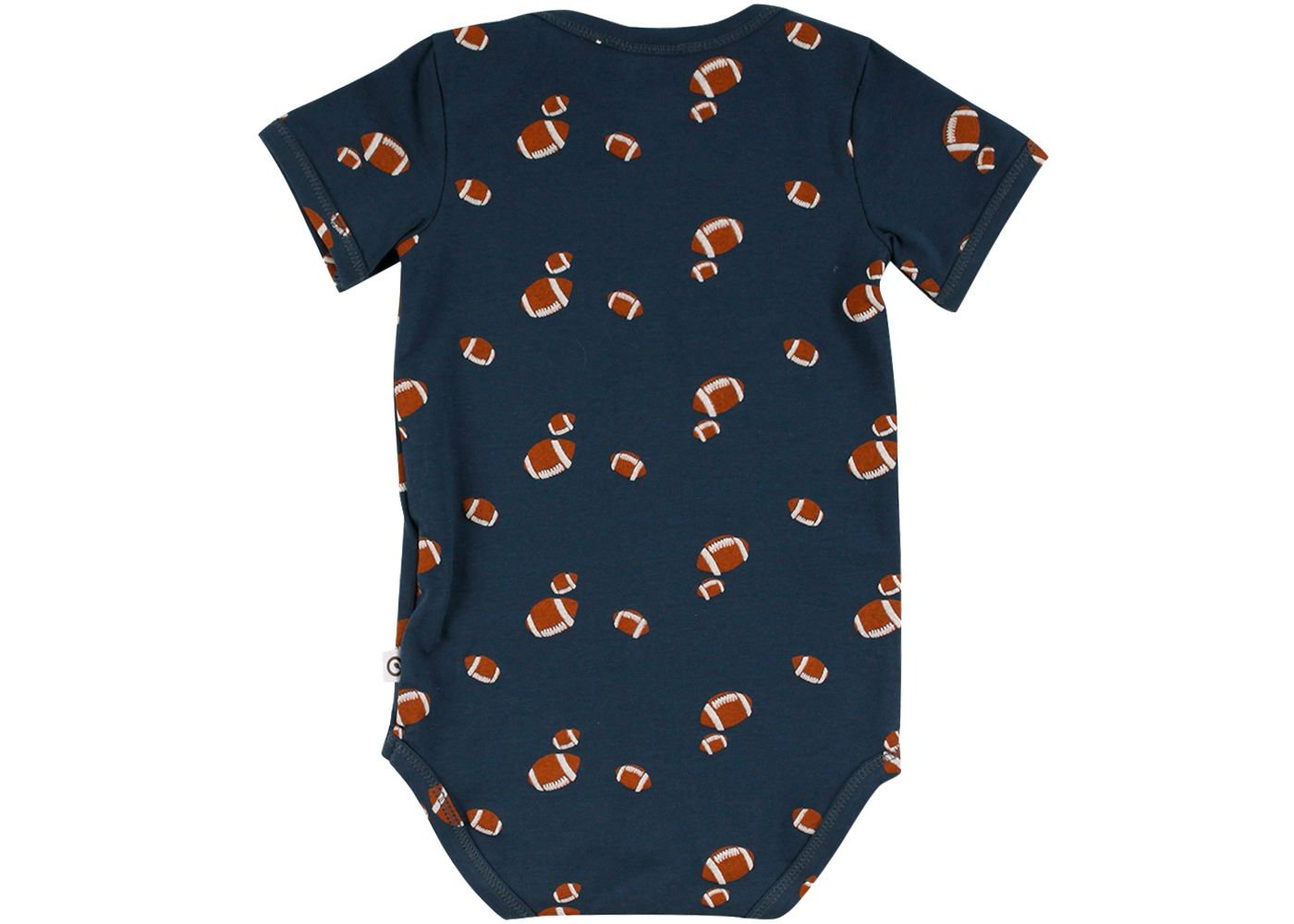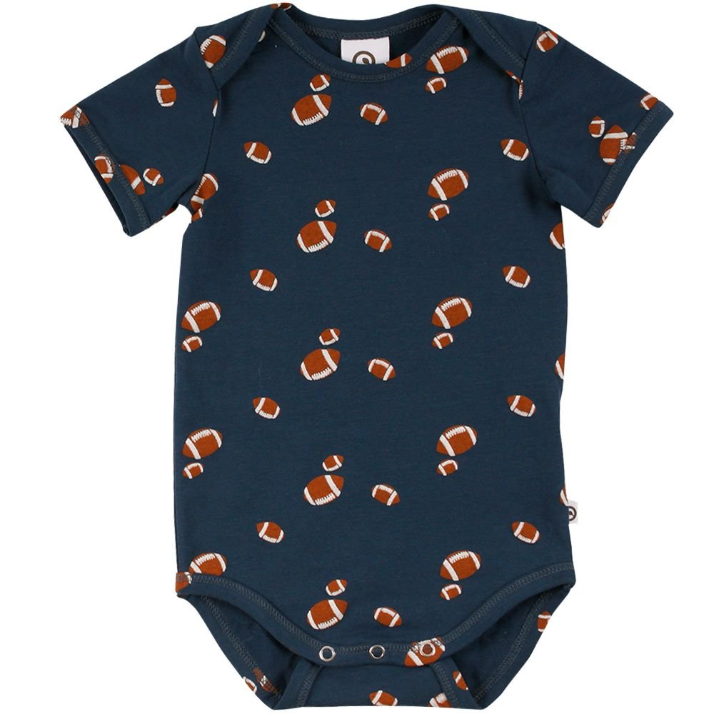 Super sød kortærmet body i blå farve og med rugbybolde fra Freds World.Bodyen har smalle ribkanter i alle åbninger, kuvertlukning på skuldre og lukkes med trykknapper imellem ben. Den er fremstillet i en lækker, blød og strækbar bomuldskvalitet, der gør den behagelig at have på.Tekstil: 95 % økologisk bomuld, 5 % elastan