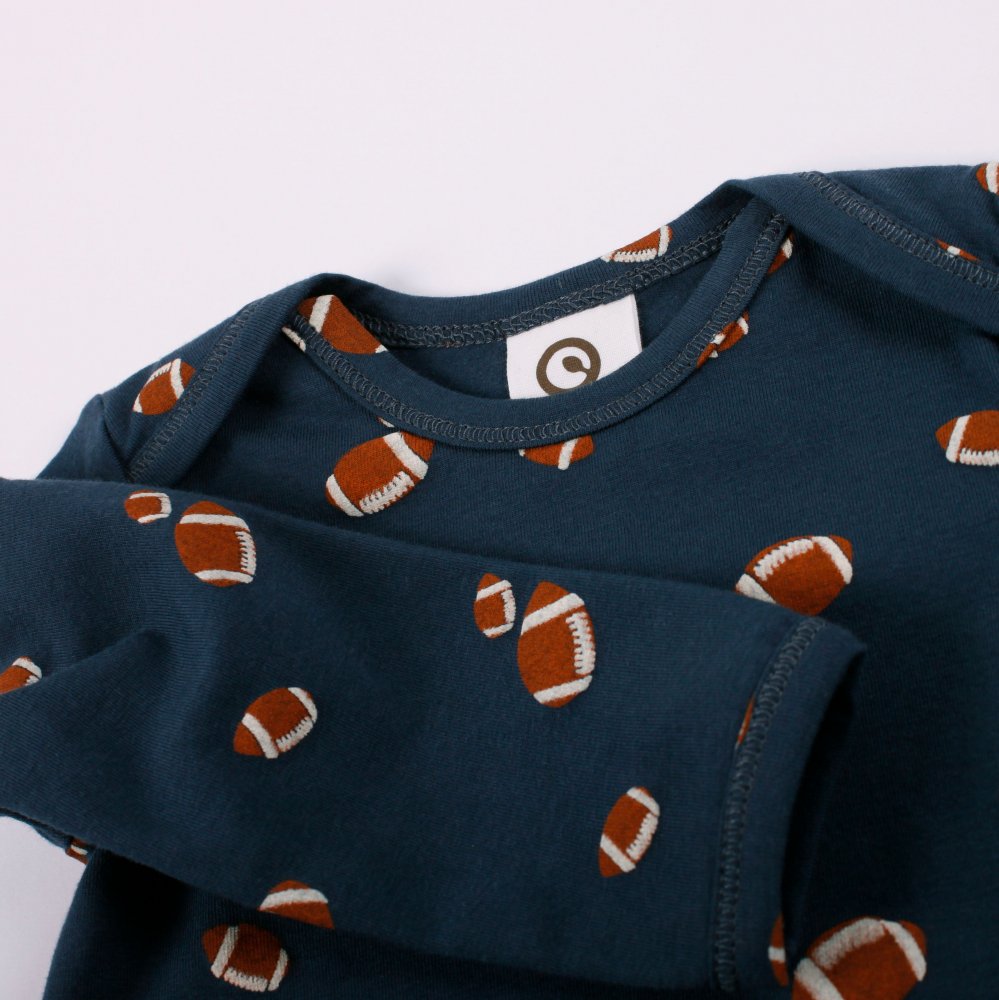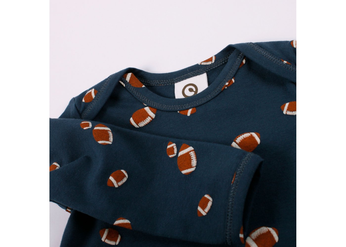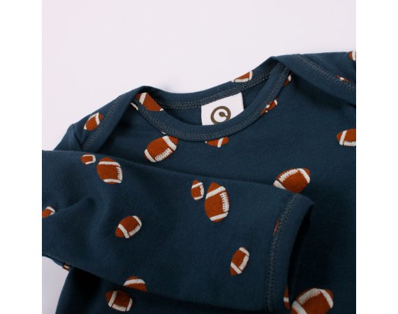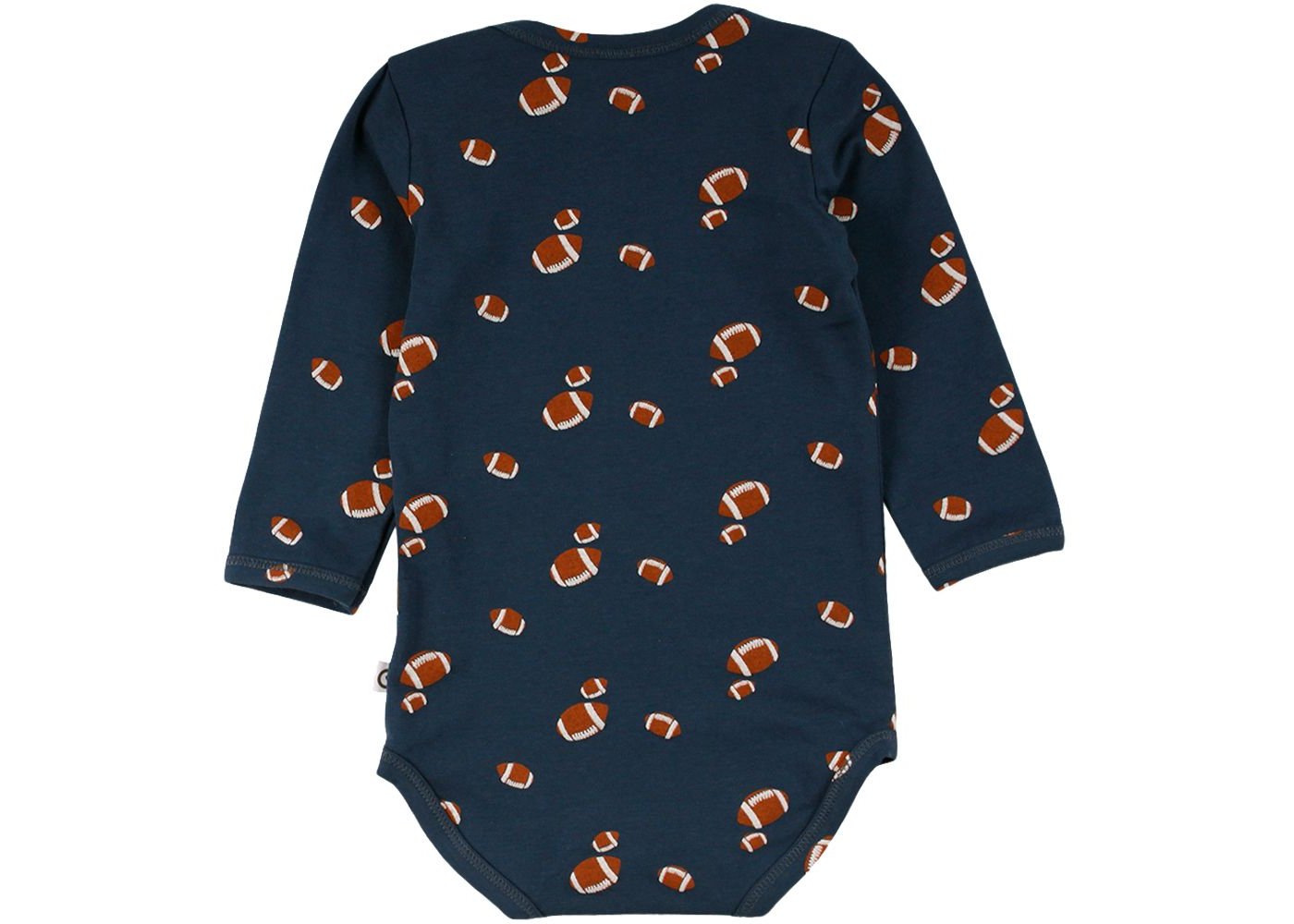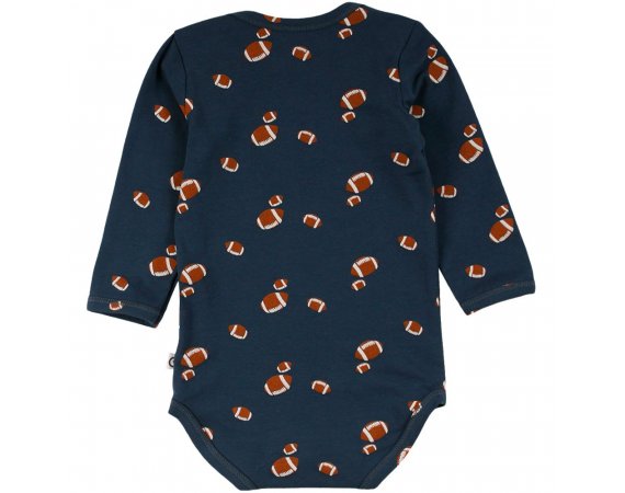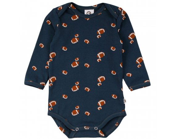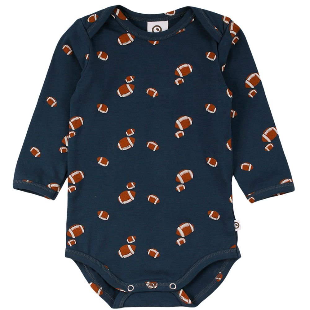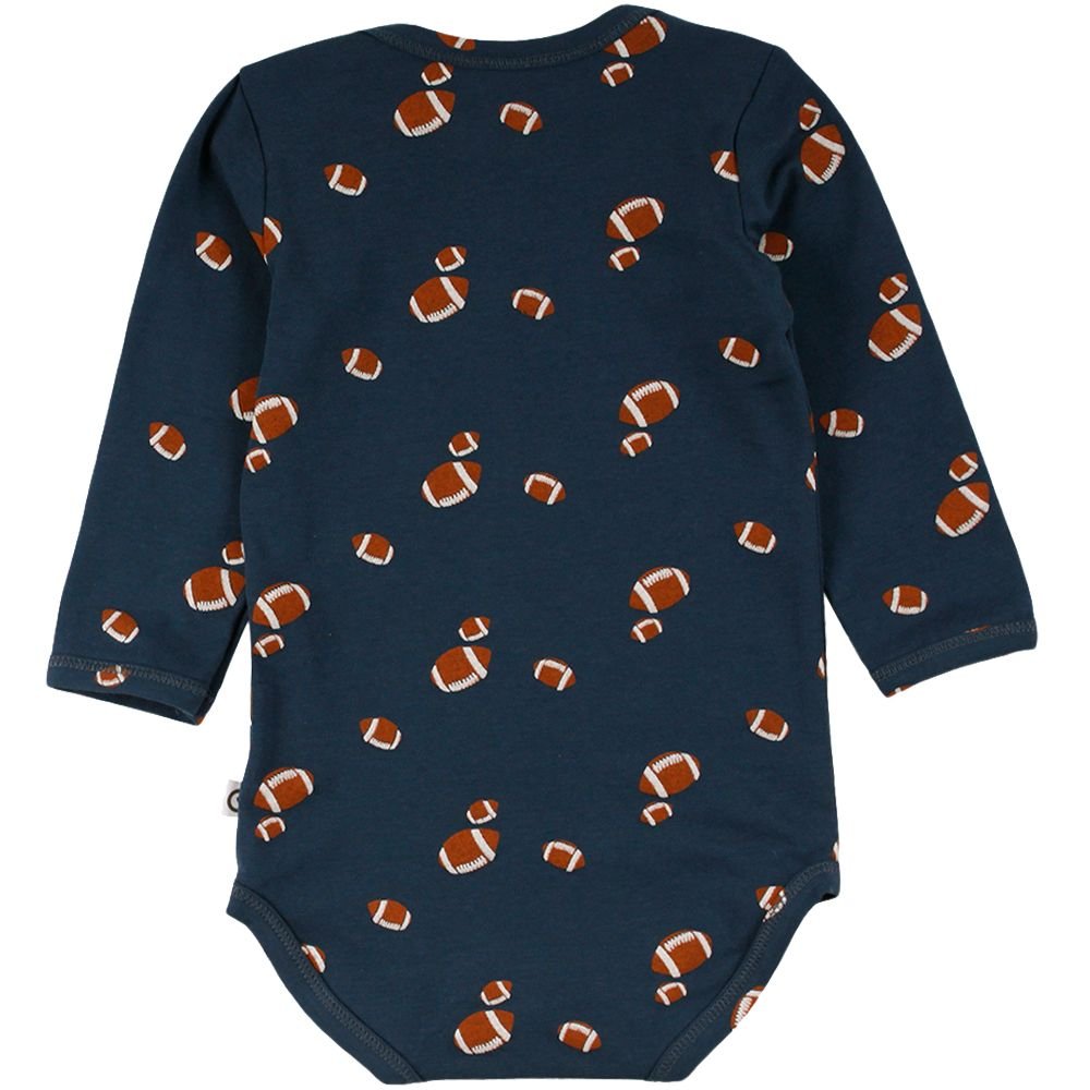 Super sød langærmet body i blå farve og med rugbybolde fra Freds World.Bodyen har smalle ribkanter i alle åbninger, kuvertlukning på skuldre og lukkes med trykknapper imellem ben. Den er fremstillet i en lækker, blød og strækbar bomuldskvalitet, der gør den behagelig at have på.Tekstil: 95 % økologisk bomuld, 5 % elastan