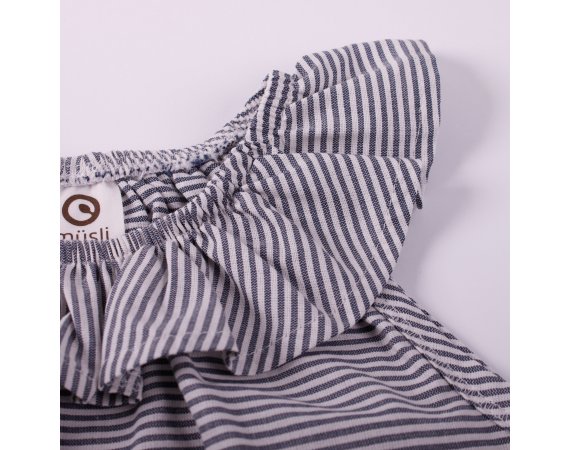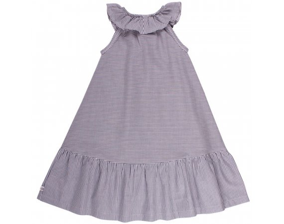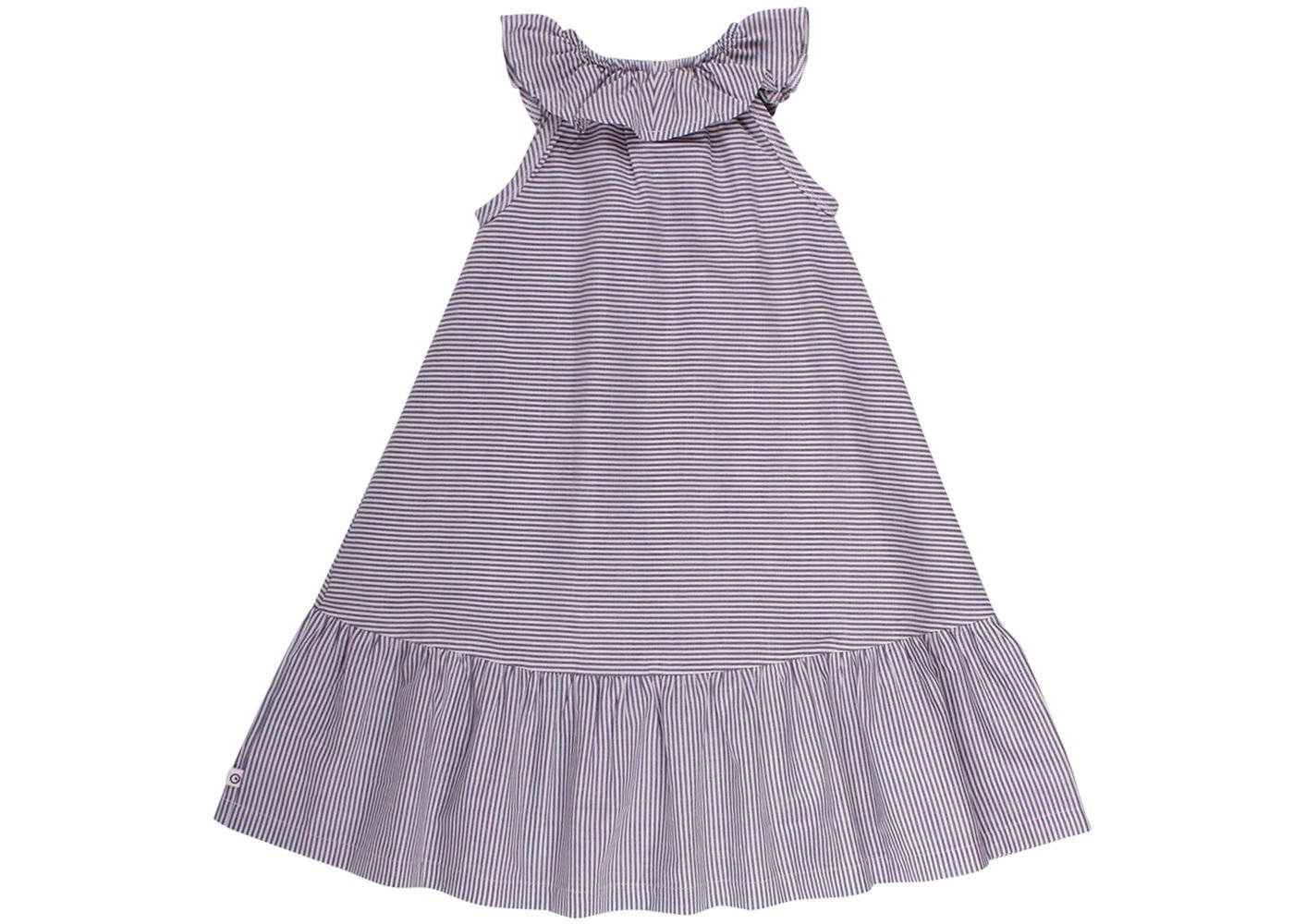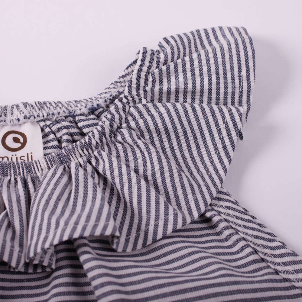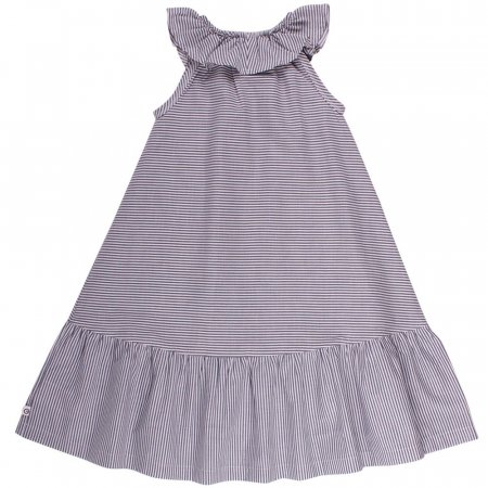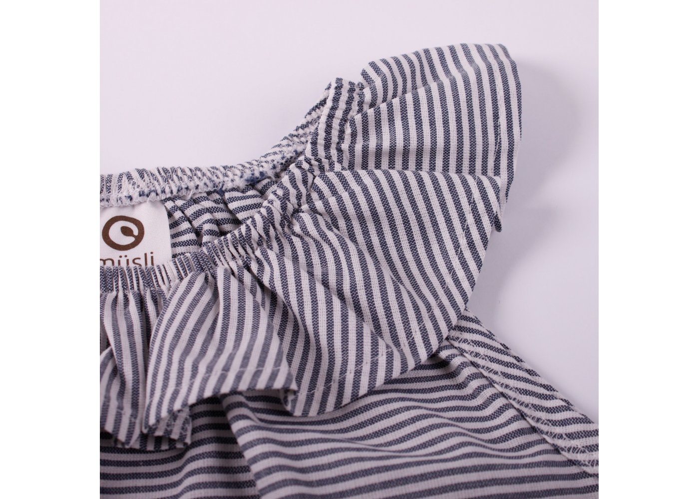 Skøn luftig kjole uden ærmer i hvid og blå striber fra müsli.Kjolen har en flæse rundt i halsudskæring og et ekstra skørt nederst, der giver kjolen en flot vidde og fylde. Den er fremstillet i en lækker, blød og strækbar bomuldskvalitet, der gør den behagelig at have på.Tekstil: 100 % økologisk bomuld