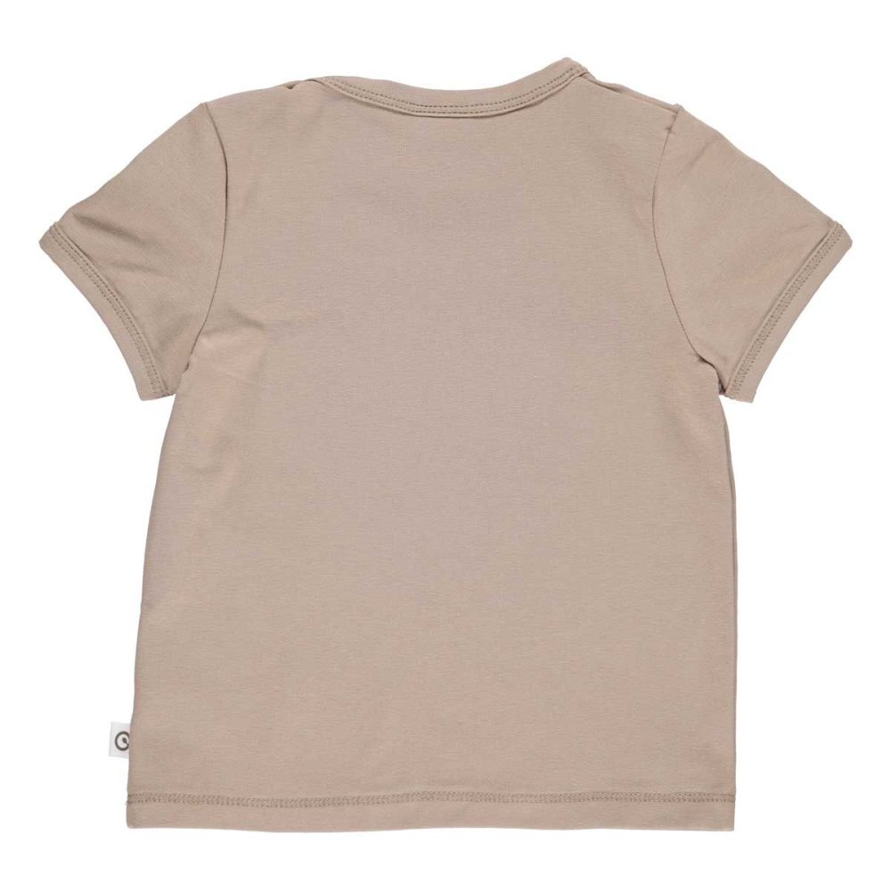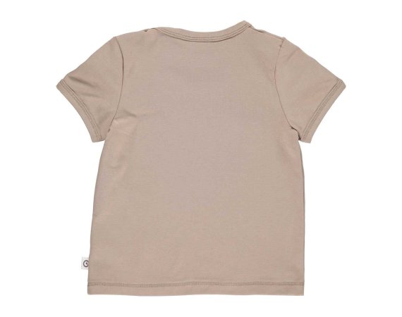 T-shirten er ensfarvet bagpå, og lukkes med trykknapper på venstre skulder.
