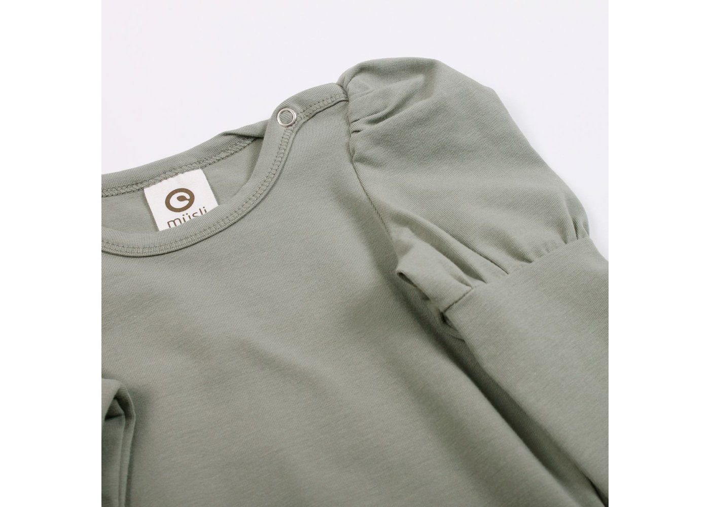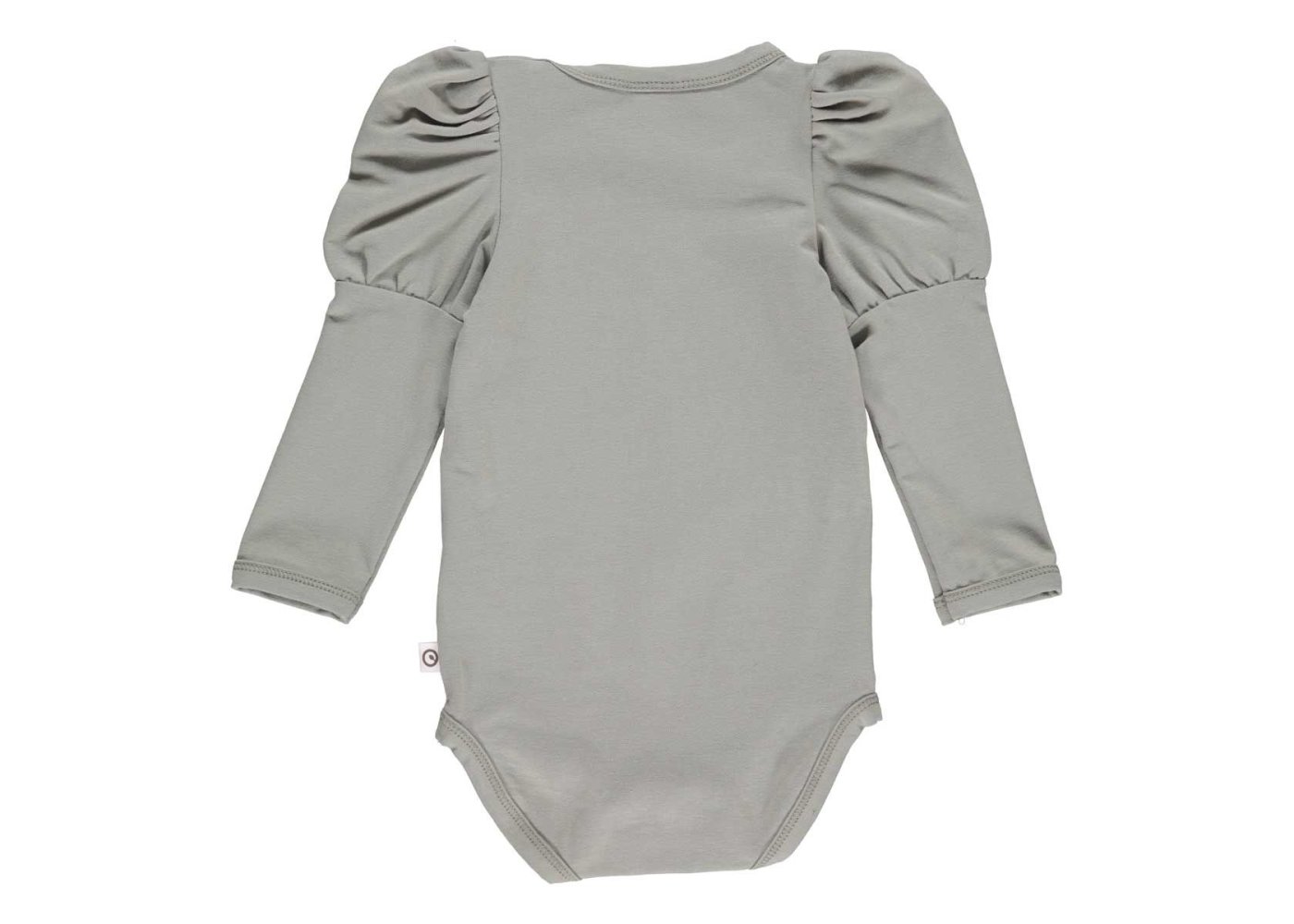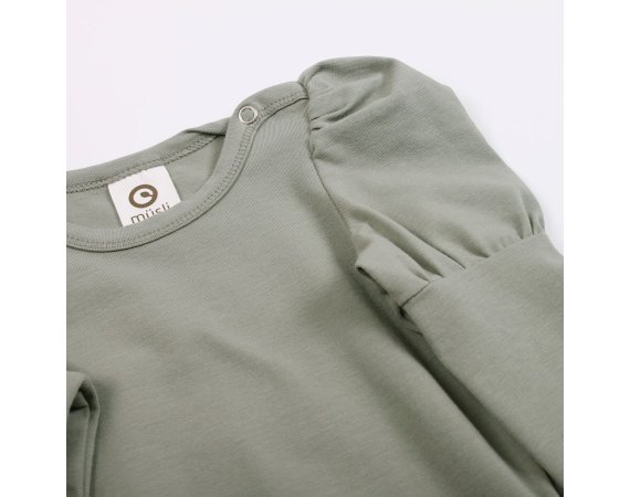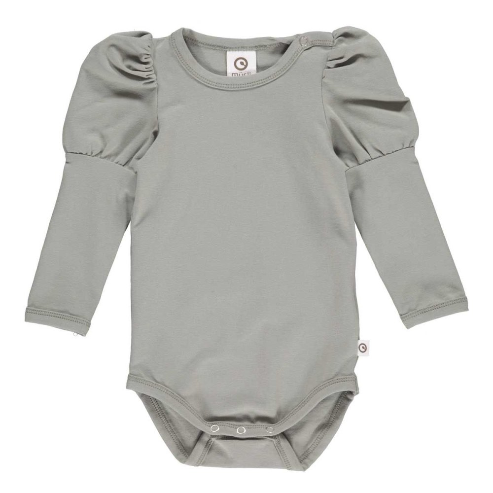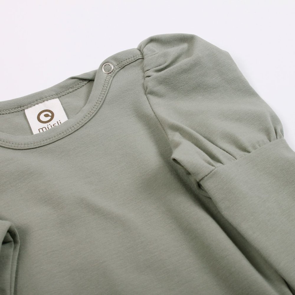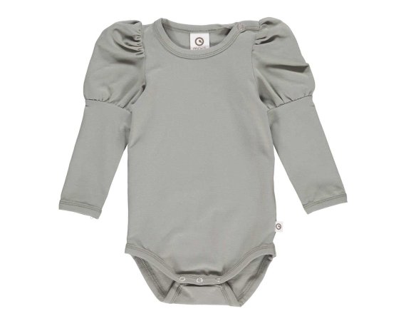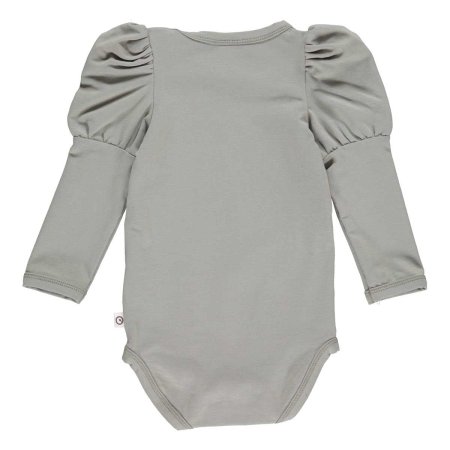 Body i blød og strækbar kvalitet med lange ærmer og flot rynk og puf på skuldre og overarme.