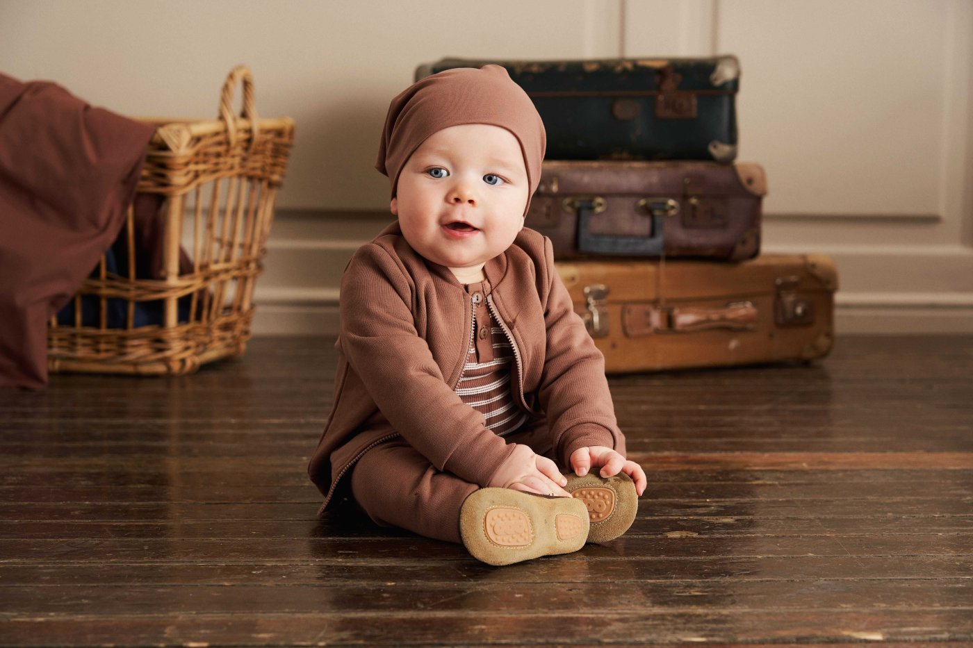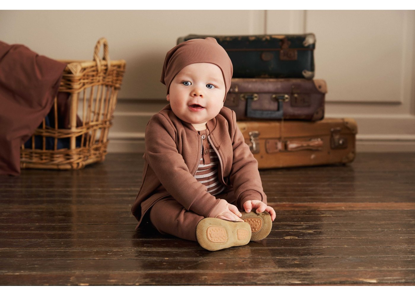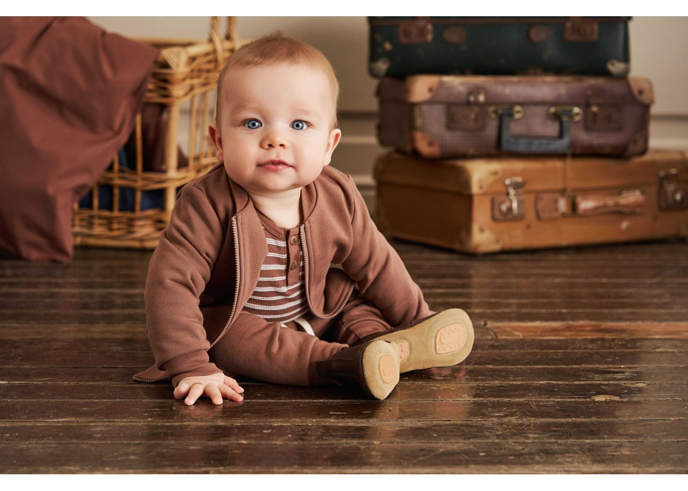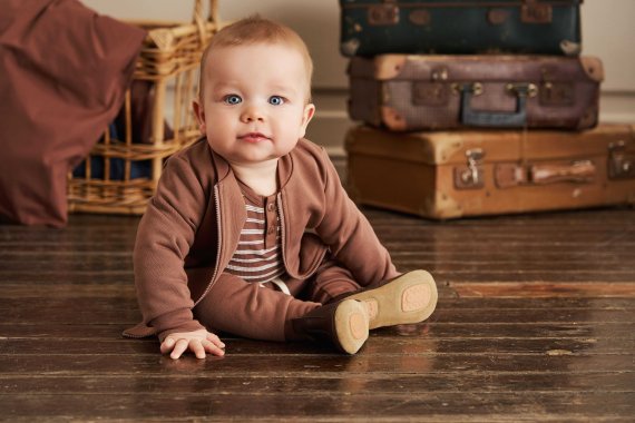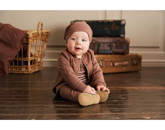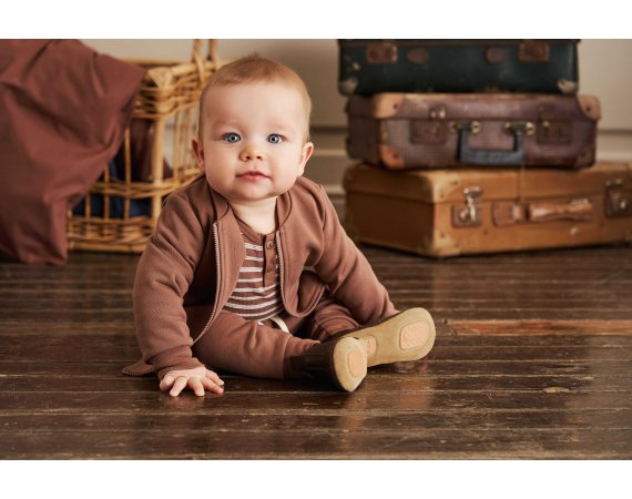 Bodyen er i slimfit med faste brune ribkanter i alle åbninger. Den har en fin stolpelukning med knapper foran og trykknapper mellem ben.