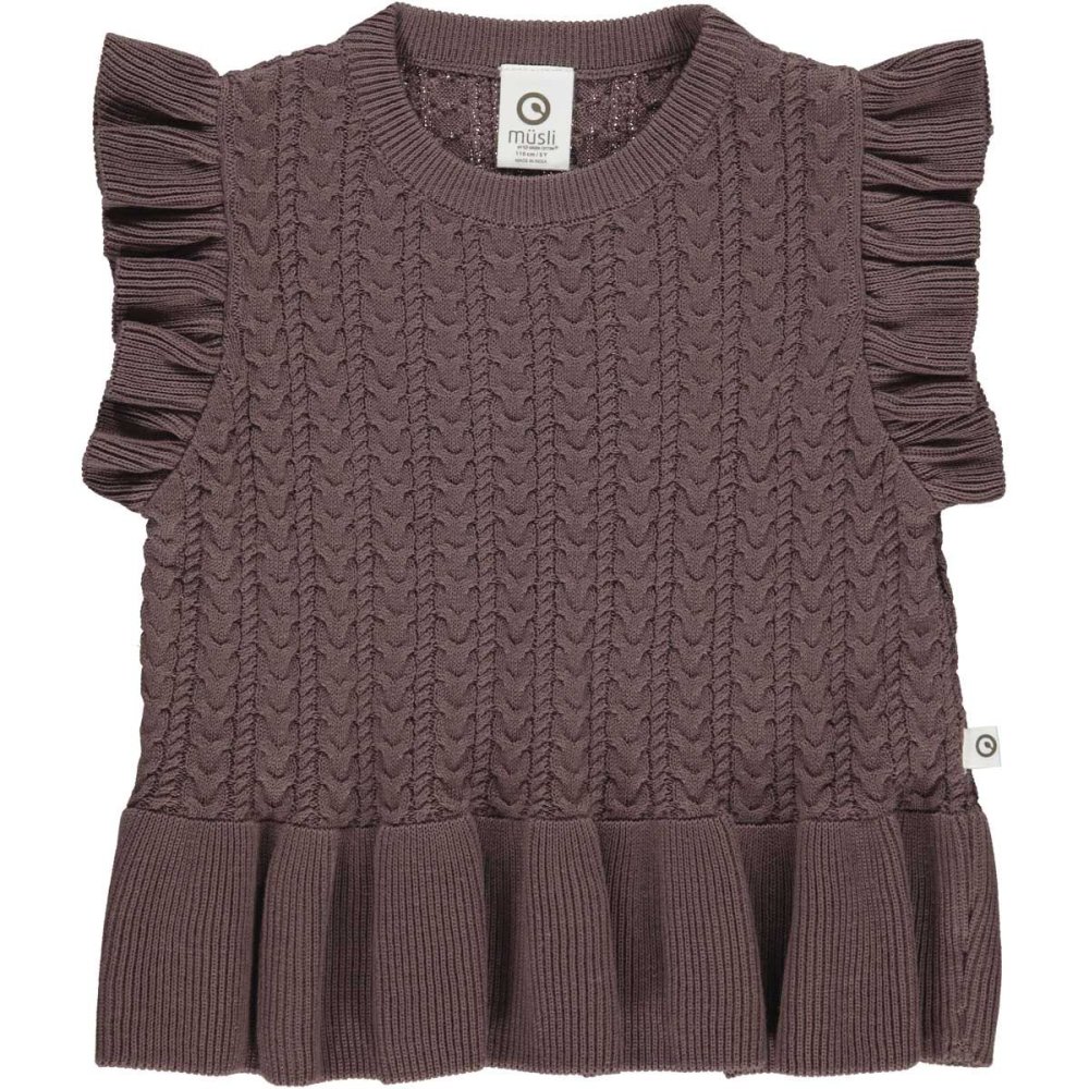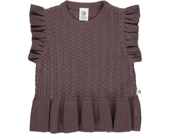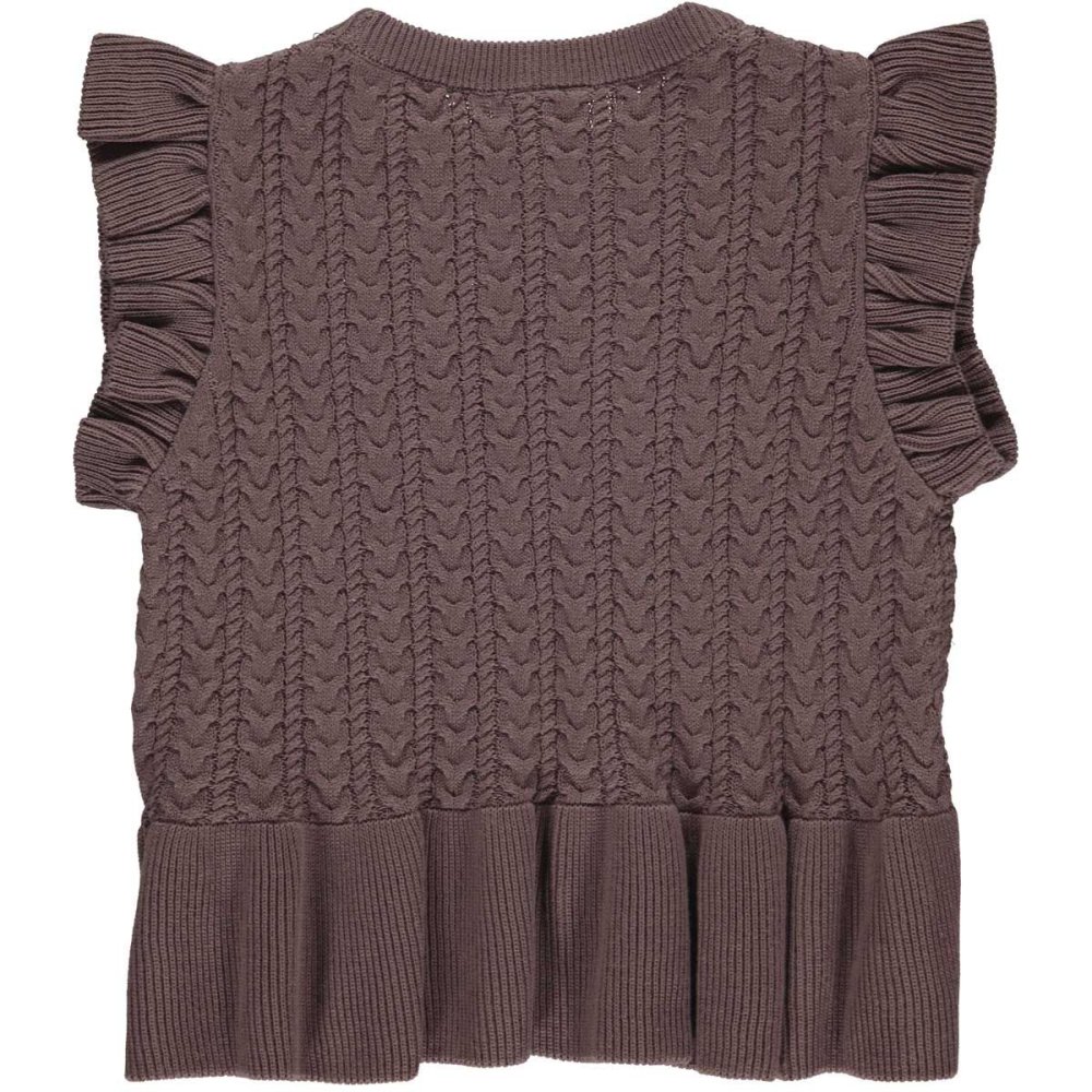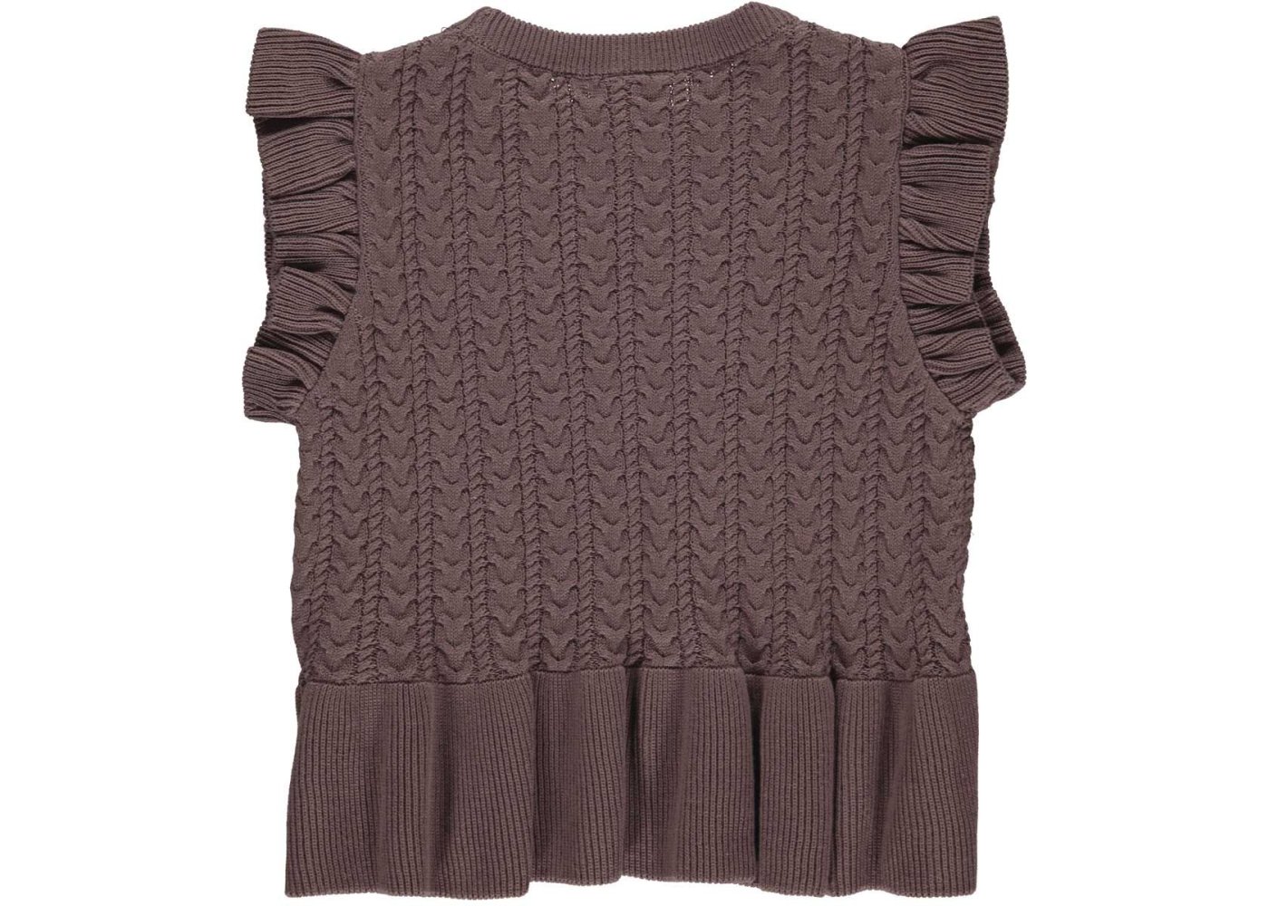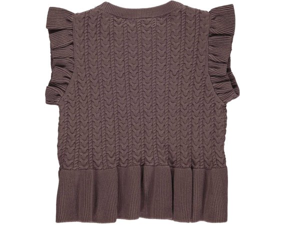 Yndig strikket vest i flot strikmønster og med flæser på skuldre og i livet.