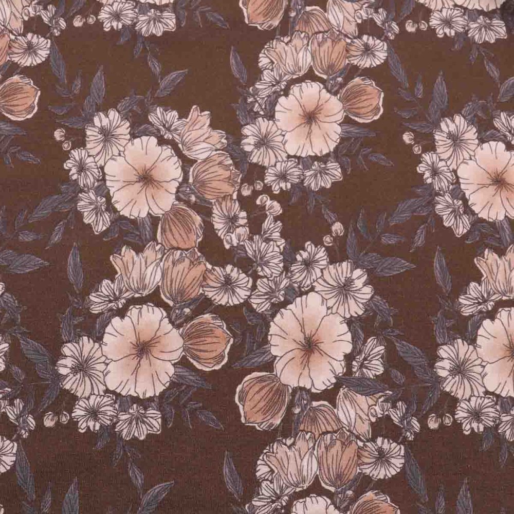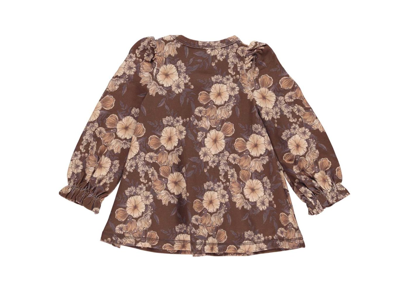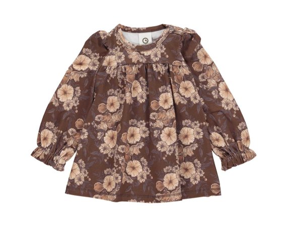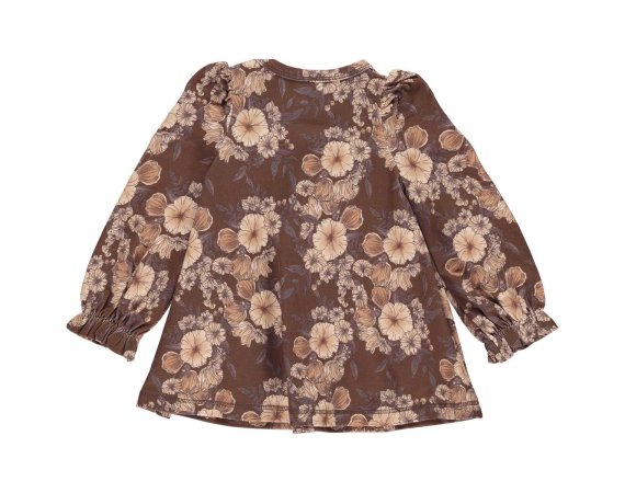 Smuk langærmet brun kjole med blomster.