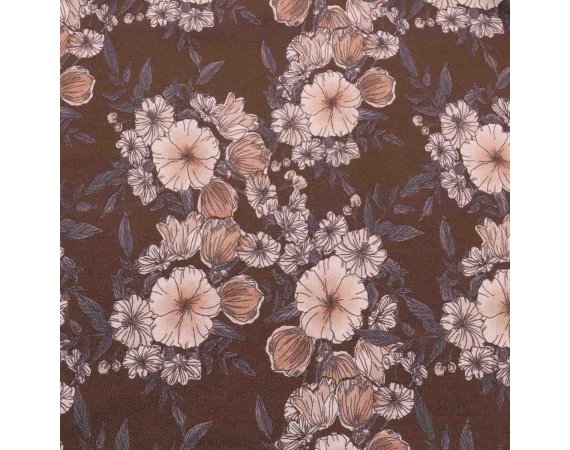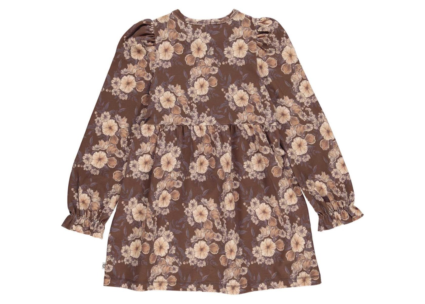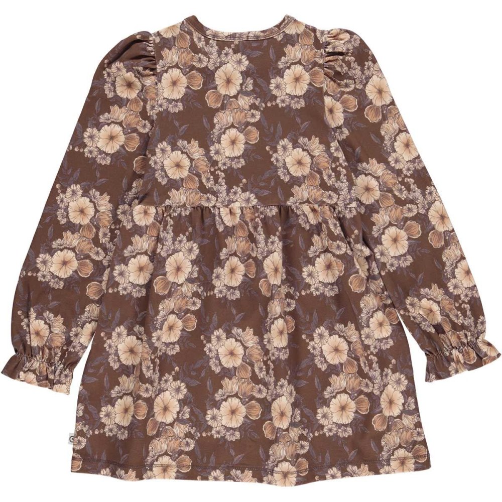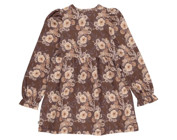 Smuk langærmet brun kjole med blomster.