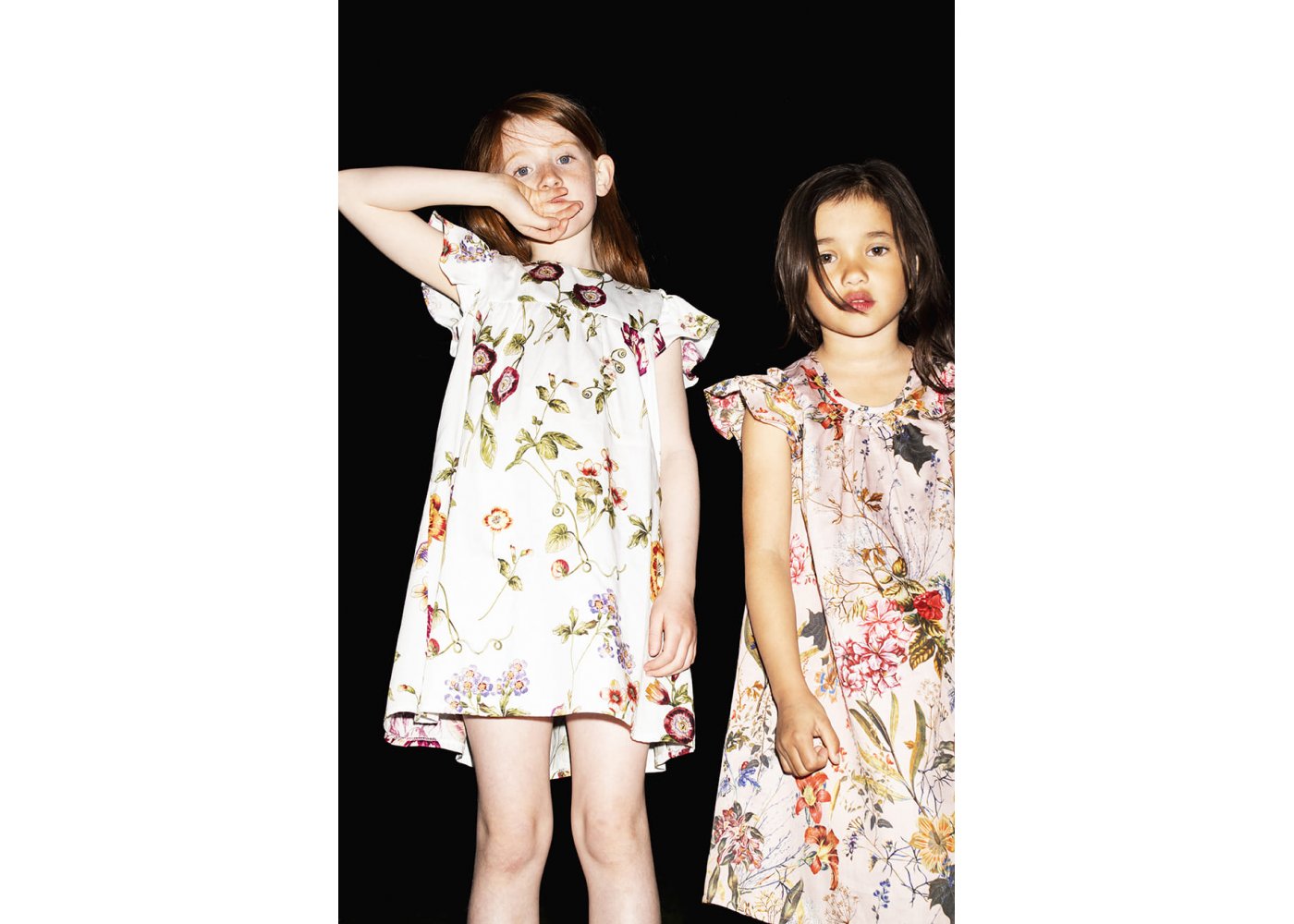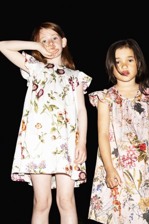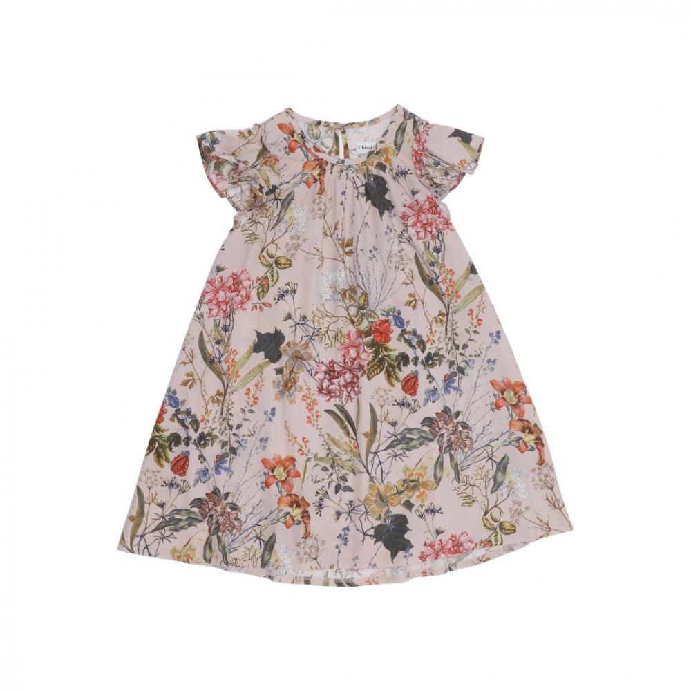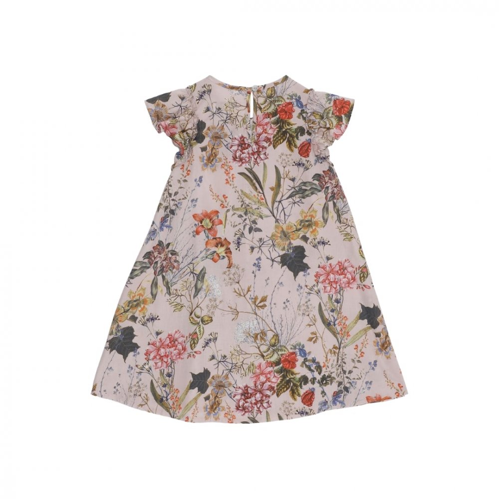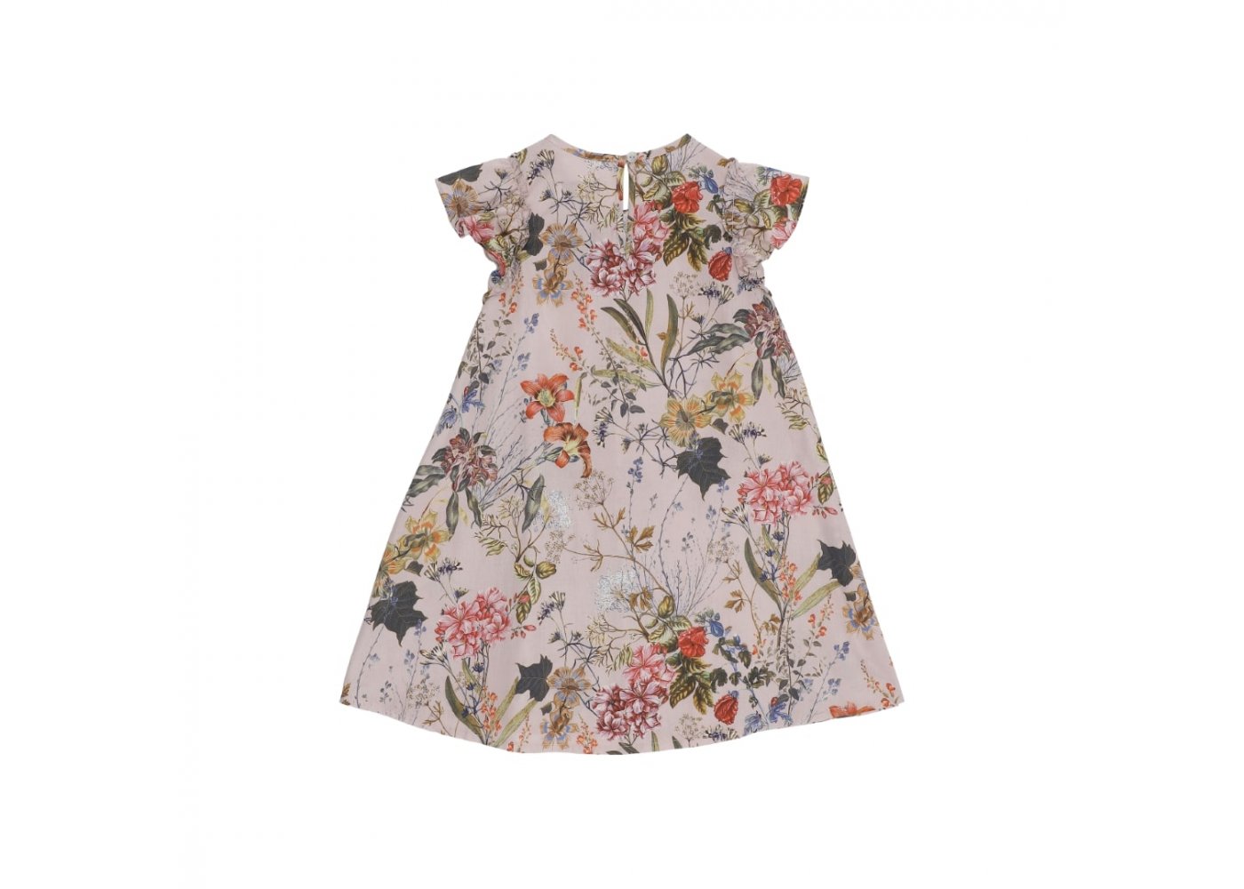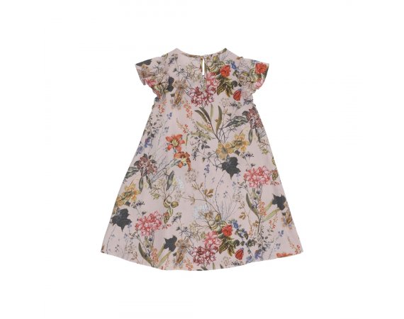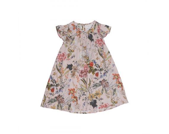 Kjole med flæse-ærmer og rynker i halsudskæring, der giver kjolen en sød vidde.