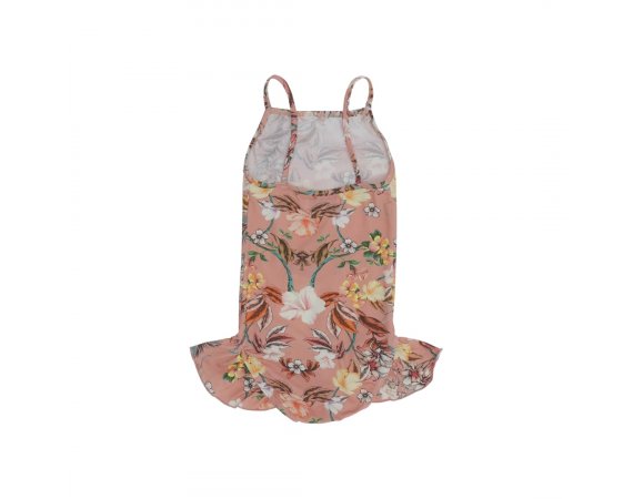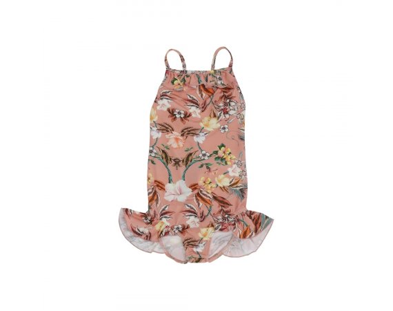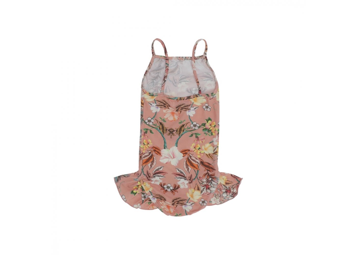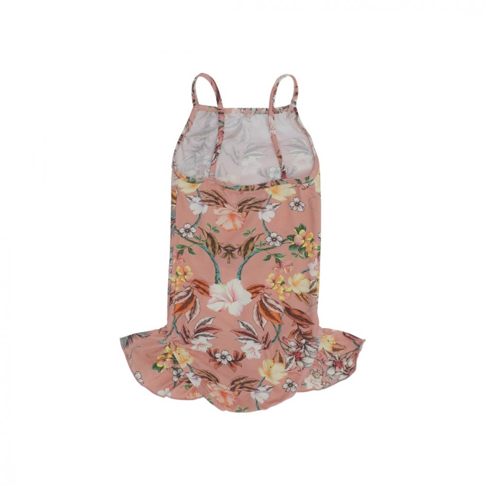 Sød badedragt med blomsterprint og flæser på bryst og ved benåbninger