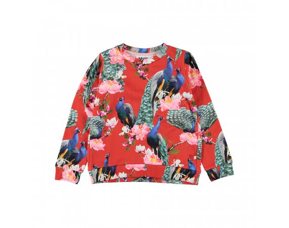 Super fed sweatshirt fra Molo i blå, grønne og rosa nuancer med print af smukke påfugle og blomster