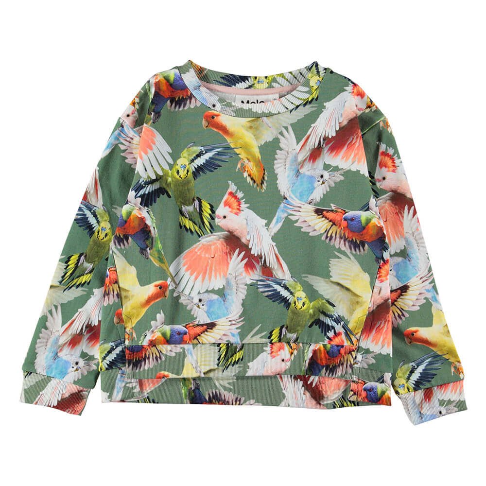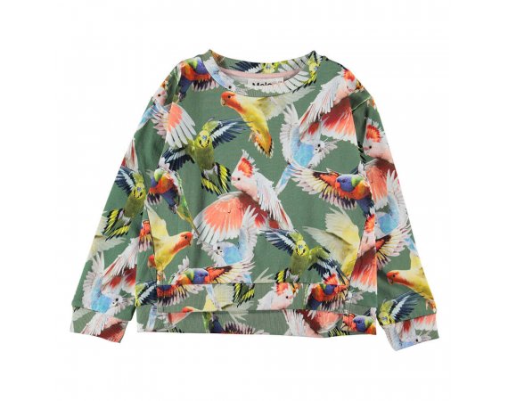 Kraftig sweatshirt i grøn med papegøjeprint. Passer i sæt med Molo Brianna Nederdel.