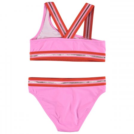 Bikinitoppen har brede stropper i rosa, rød og guld strib, som samles på ryggen. Trussen har en bred elastikkant i taljen i samme farver.