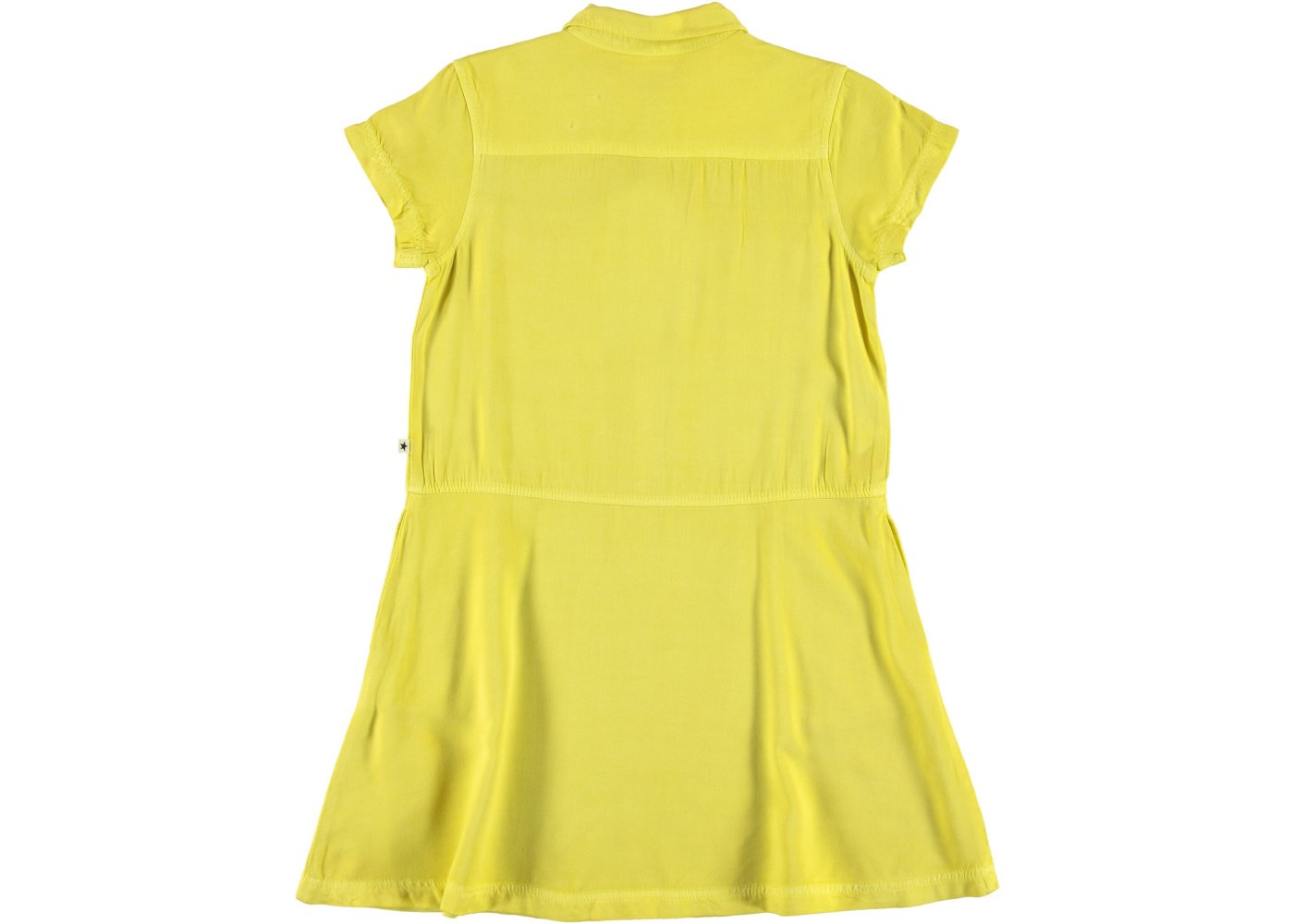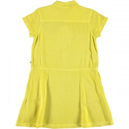 Farverig kjole med korte ærmer, krave og knaplukning ned foran.