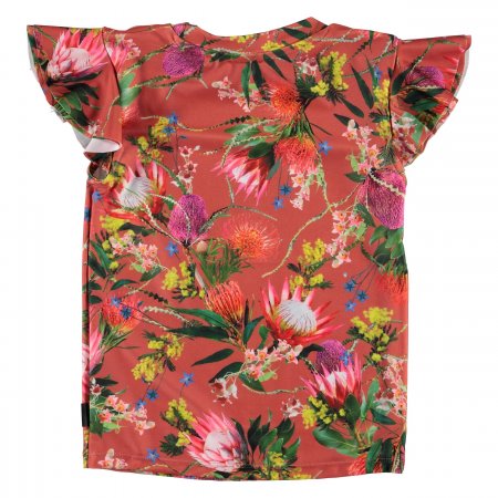 Smuk badetop med blomster print i flotte farver fra MoloBadetop med søde flæseærmer i to lag og en smal kant i halsåbning.