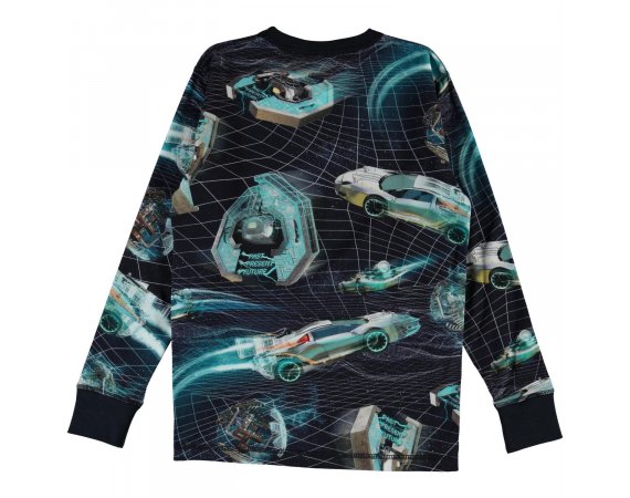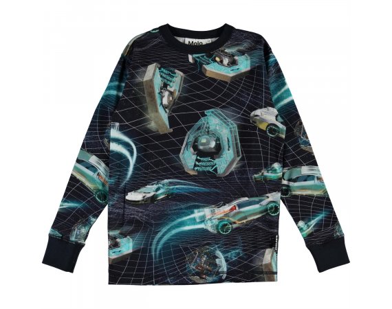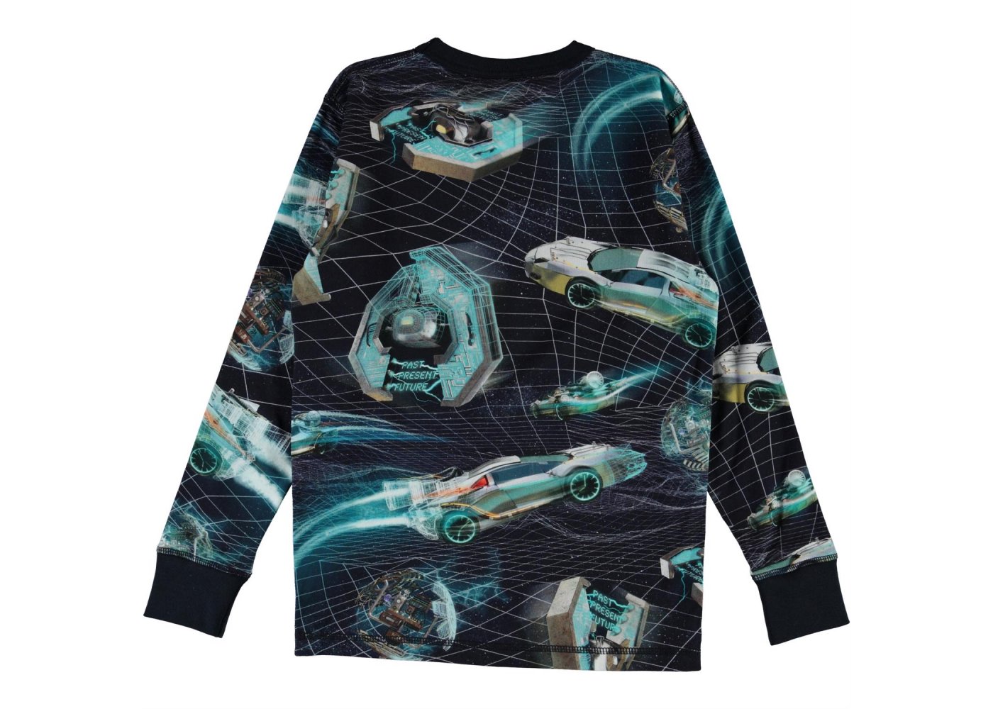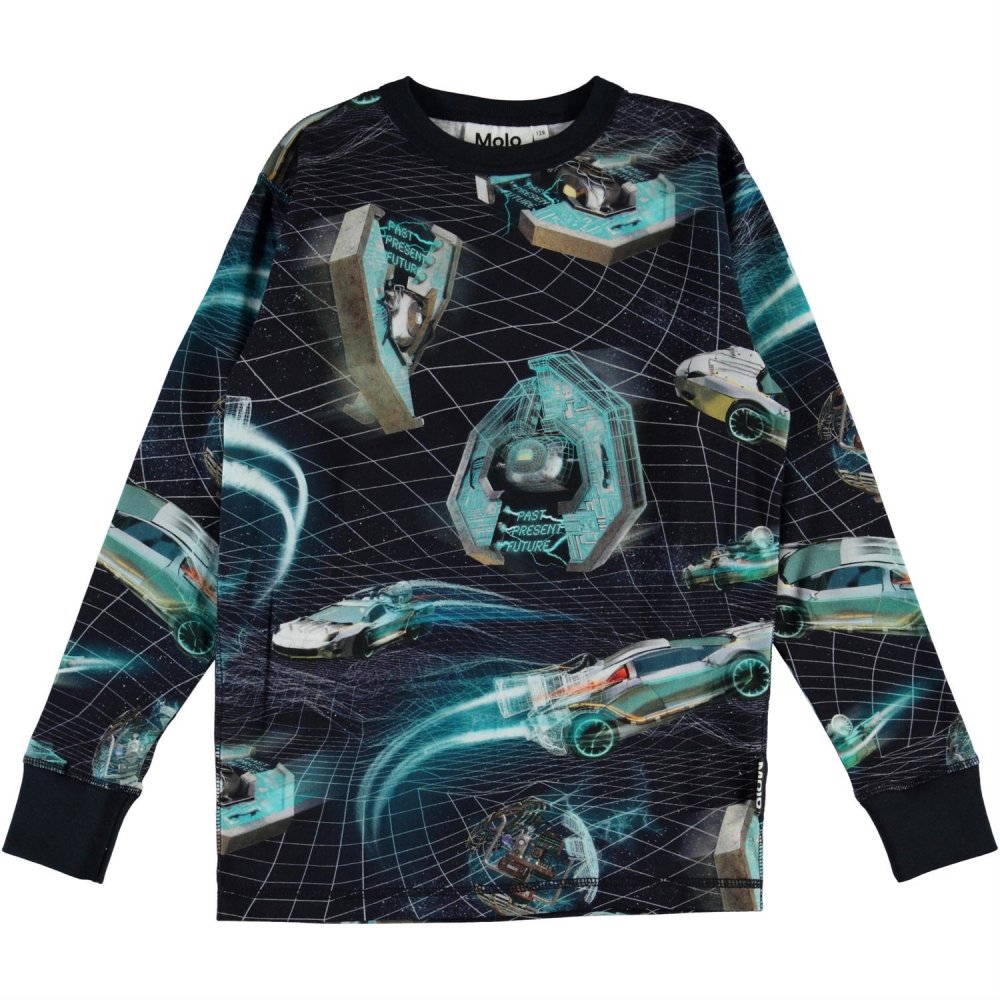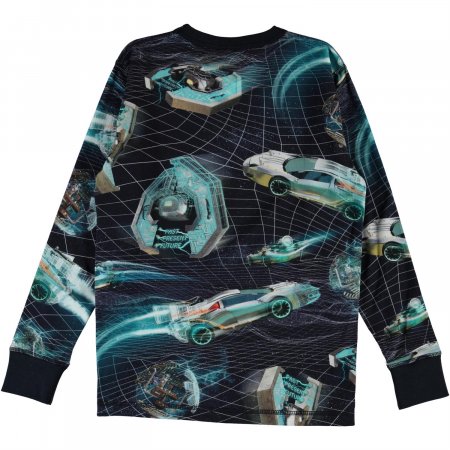 Smart langærmet blå t-shirt med raglanærmer og printT-shirten har ensfarvede ærmer og flotte billeder foran og bagpå med print af tids-maskiner i rummet.