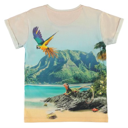 Kortærmet t-shirt i lækker bomuldskvalitet med frisk Hawaii motiv fra Molo.T-shirten er i fine farver, der er let at style med bukser og shorts. Den har rund hals og ombuk på ærmer.