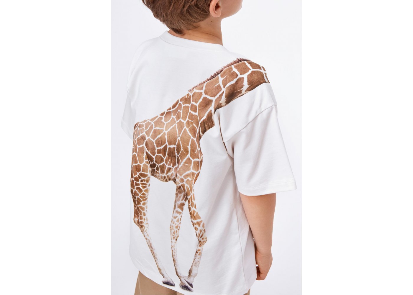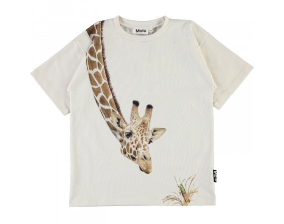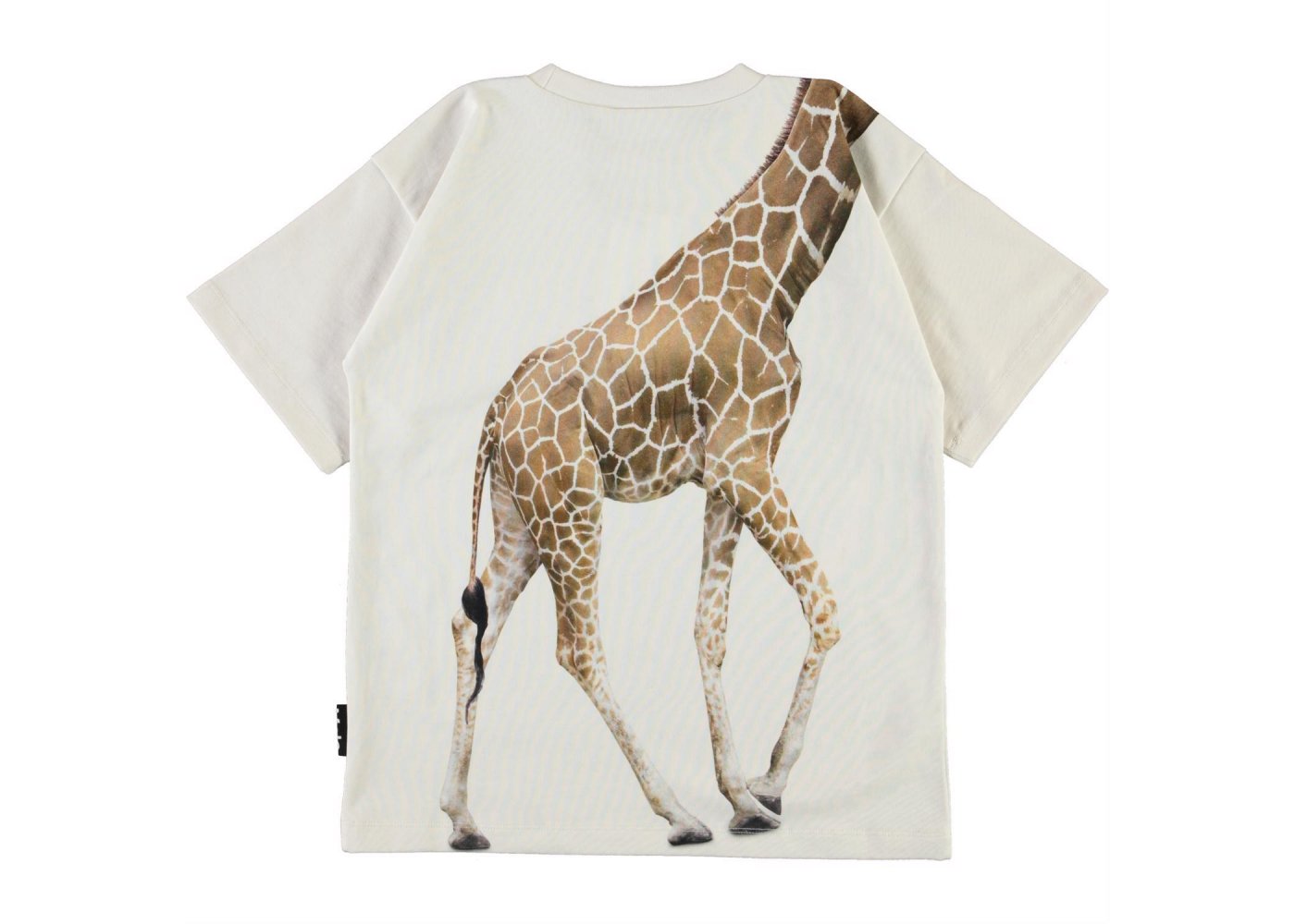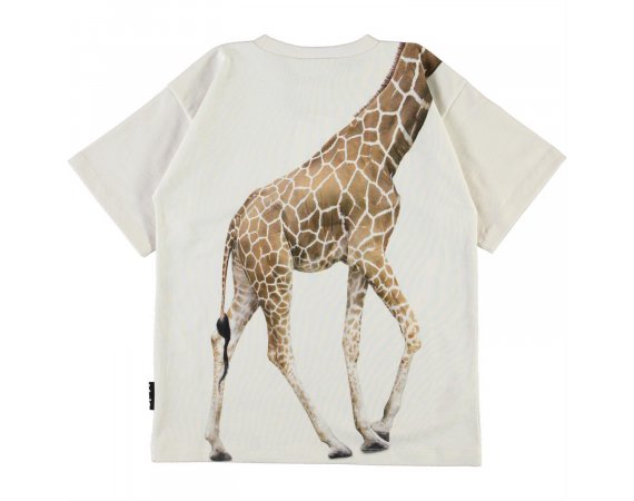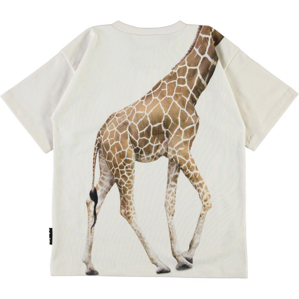 Flot kortærmet råhvid t-shirt fra Molo med print af en giraf.Giraffens hoved er på forsiden, og resten af kroppen er på ryggen.