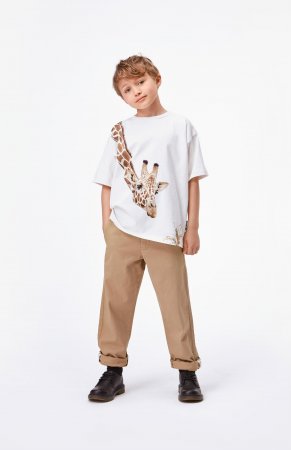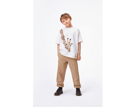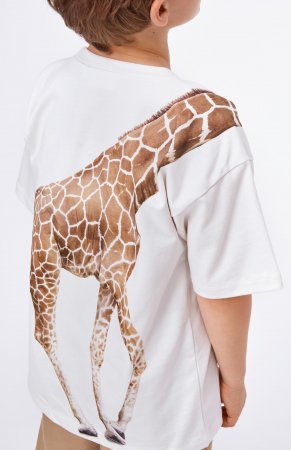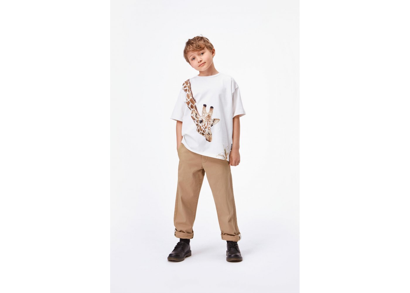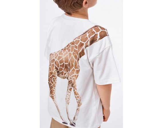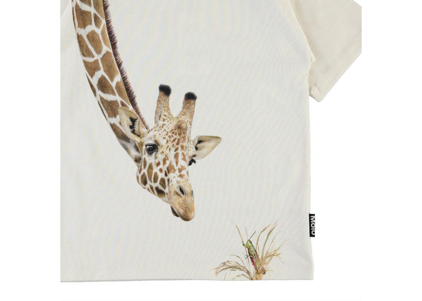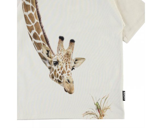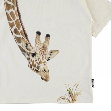 Flot kortærmet råhvid t-shirt fra Molo med print af en giraf.Giraffens hoved er på forsiden, og resten af kroppen er på ryggen.