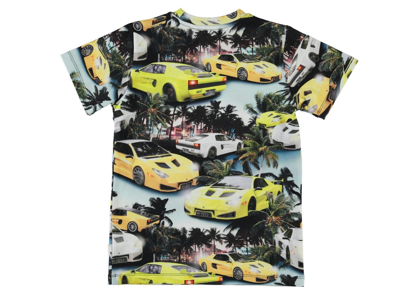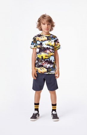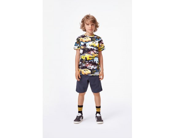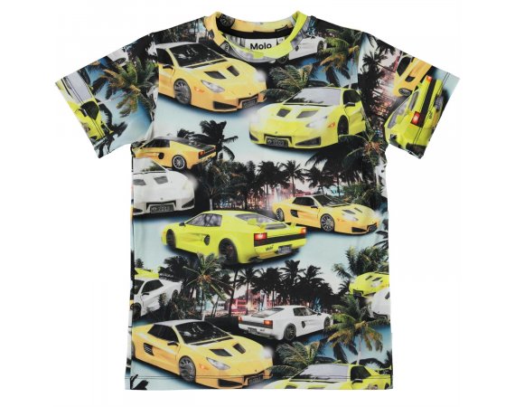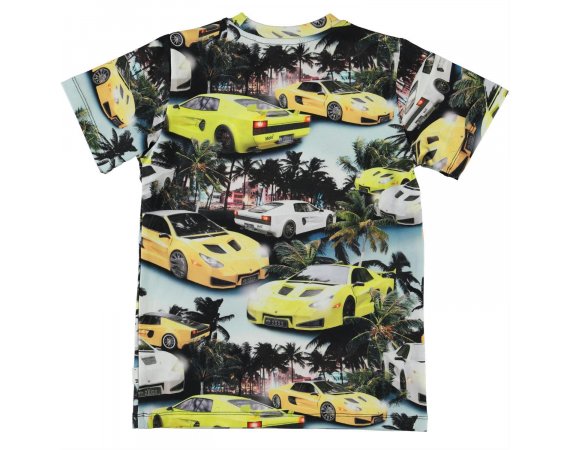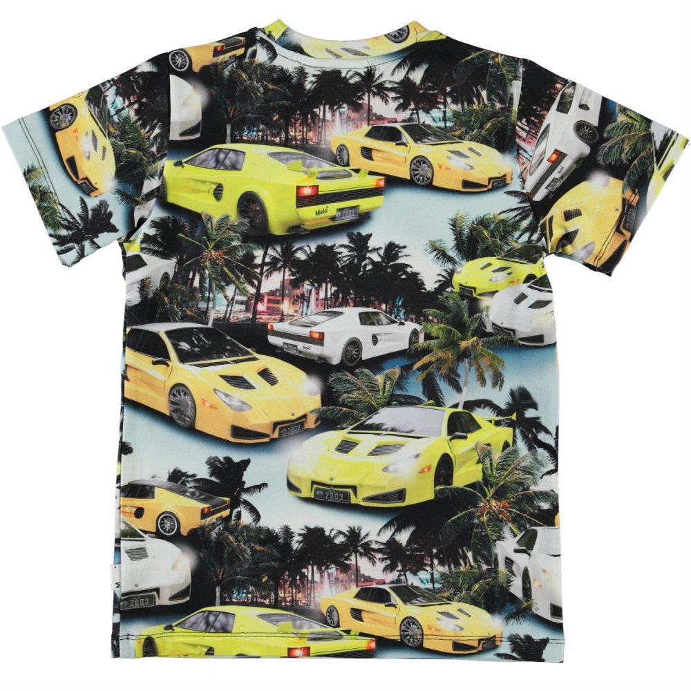 Flot kortærmet spraglet t-shirt fra Molo med print af racerbiler.T-shirten er i fine farver, der er let at style med bukser og shorts.