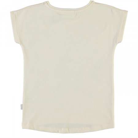 T-shirten går lidt længere ned bagpå og er i ensfarvet råhvid farve.