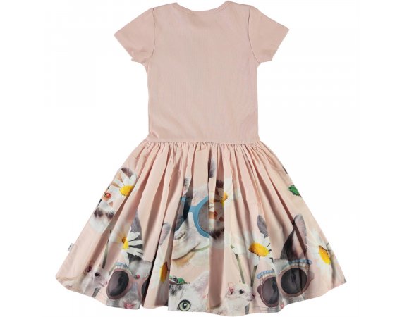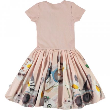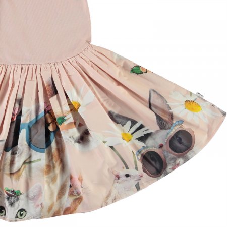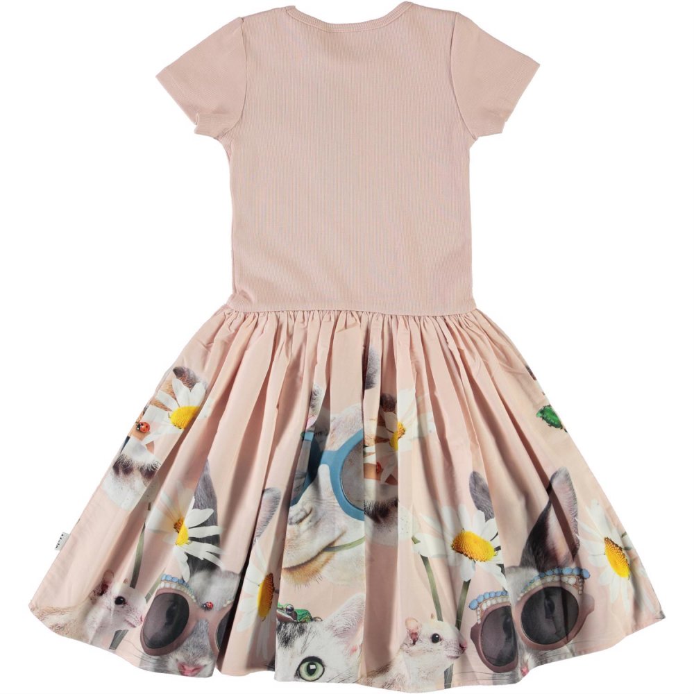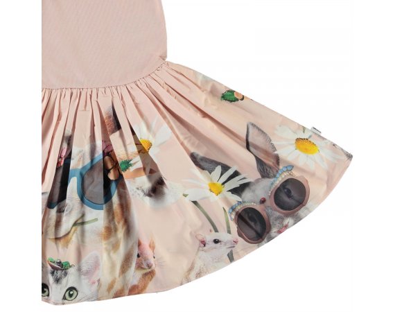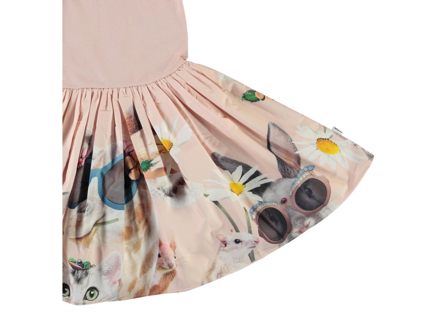 Cissa fra Molo er en yndig kortærmet kjole med en ensfarvet rosa overdel i rib og et feminint poplin skørt i rosa med blomster og dyr med solbriller på.Tekstil: 100% økologisk GOTS-certificeret bomuld