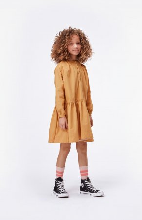 Cinzia fra Molo er en yndig sennepsgul langærmet kjole med et feminin look.Kjolen har et flot rynket skørt og stolpelukning foran, som lukkes med fine gule knapper.