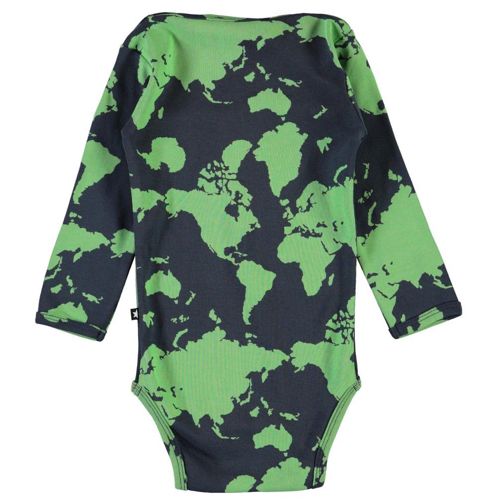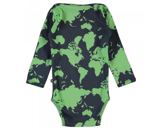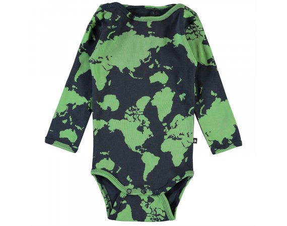 Foss fra Molo er en skøn langærmet body i grøn og blå farve med print af verdenskortet.Bodyen har smalle kanter i alle åbninger. Den lukkes med trykknapper ved skuldre og imellem ben, som gør den let at få af og på igen.